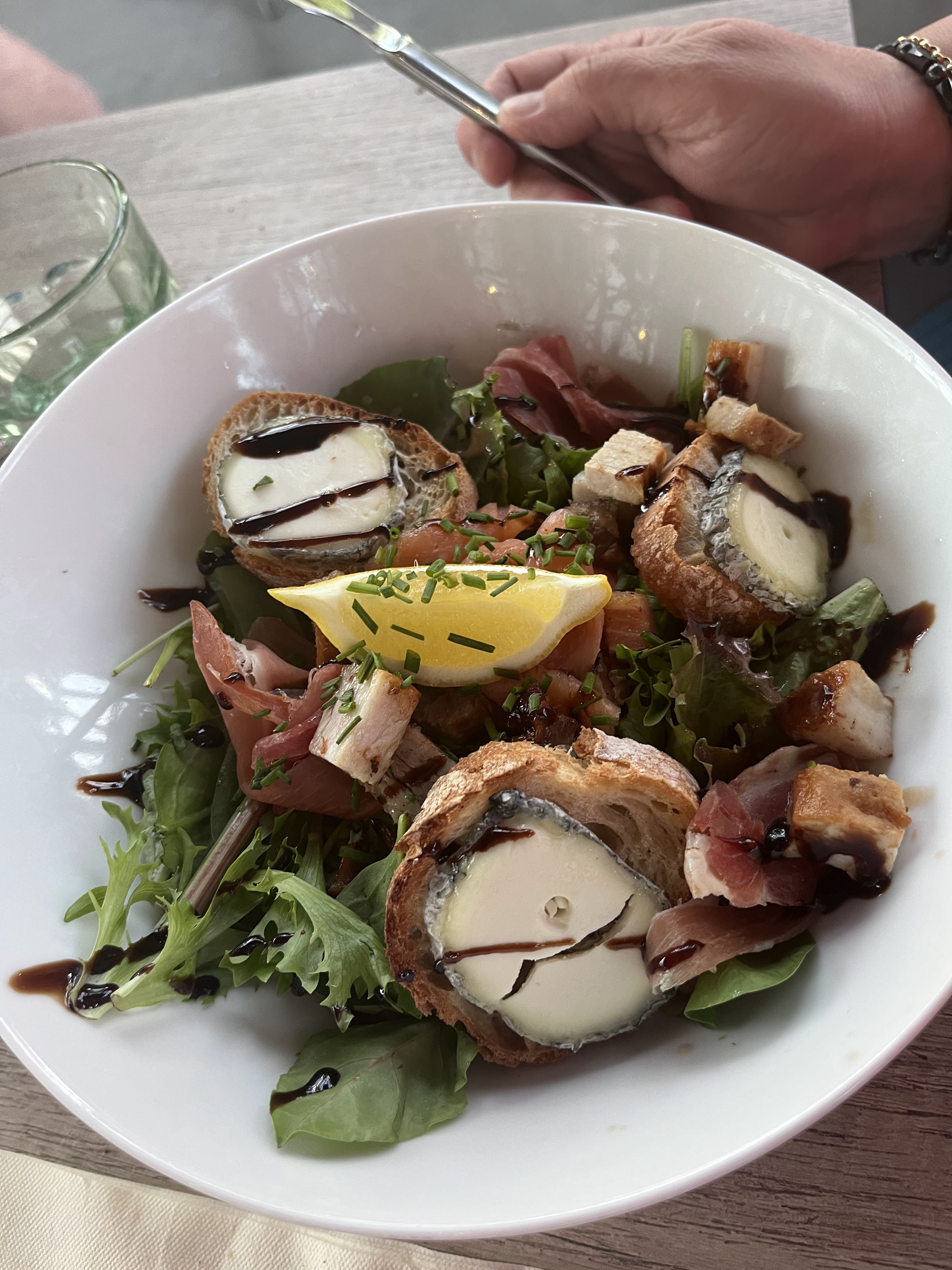 Salade de chèvre froide avec de gros morceaux de lardons je vais dire plutôt de gros morceaux de gras très déçue 😞 Pour info nous l avons signalé au moment de régler mais prix plein pot quand même surtout d en avoir laisser pas mal dans l assiette