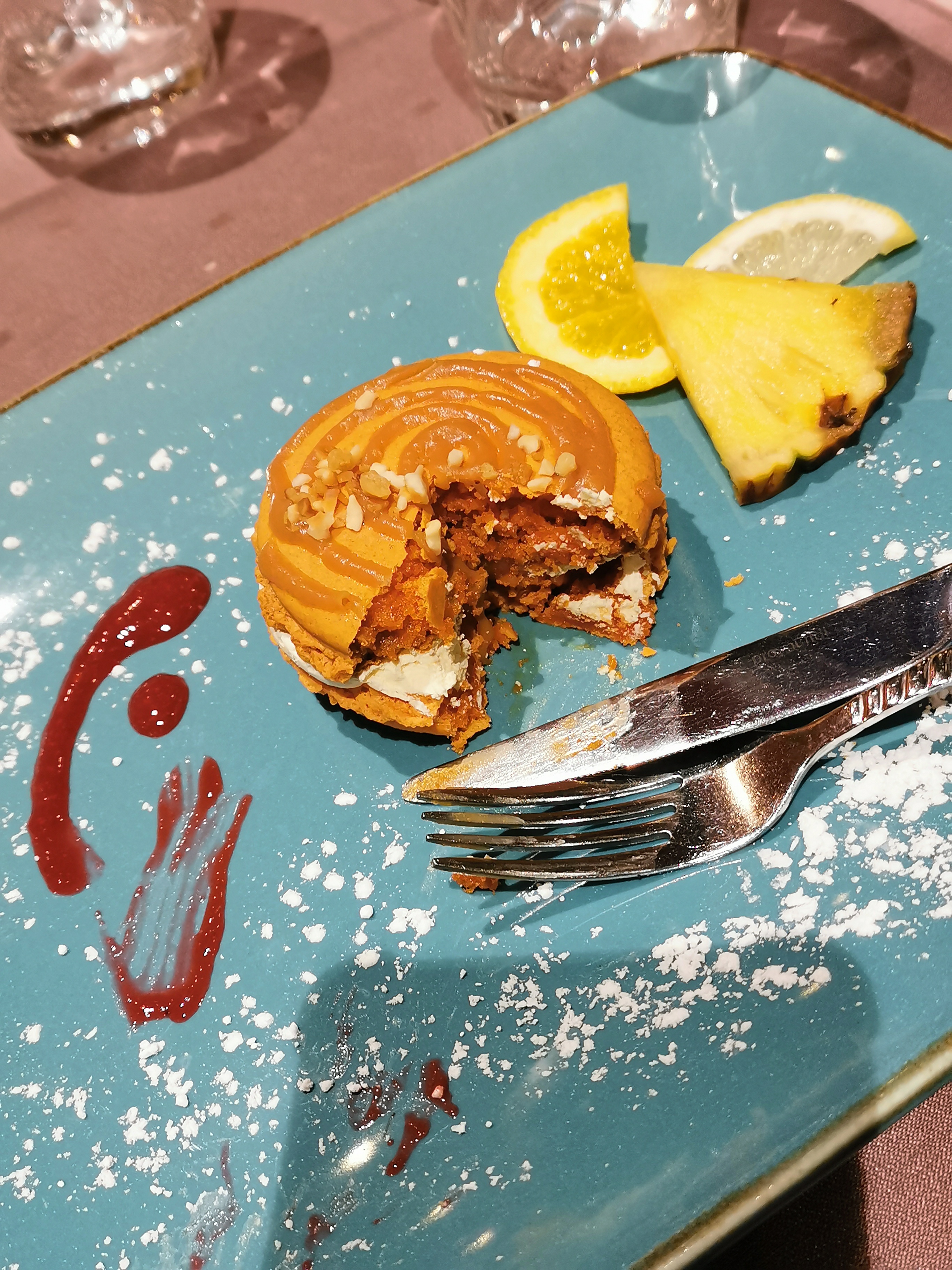 Cocotte de riz de veau et la poêlé de légumes, très bon. J'ai moins aimé les pomme de terre grenaille. En dessert, une serveuse me voyant regarder les desserts de la maison diener m'a conseillé. J'ai pris un dôme, je crois que le nom est arnaque cœur : Excquis ! Mon compagnon est satisfait de son choix. Il a pris un Burger boucher et une crème brûlé.