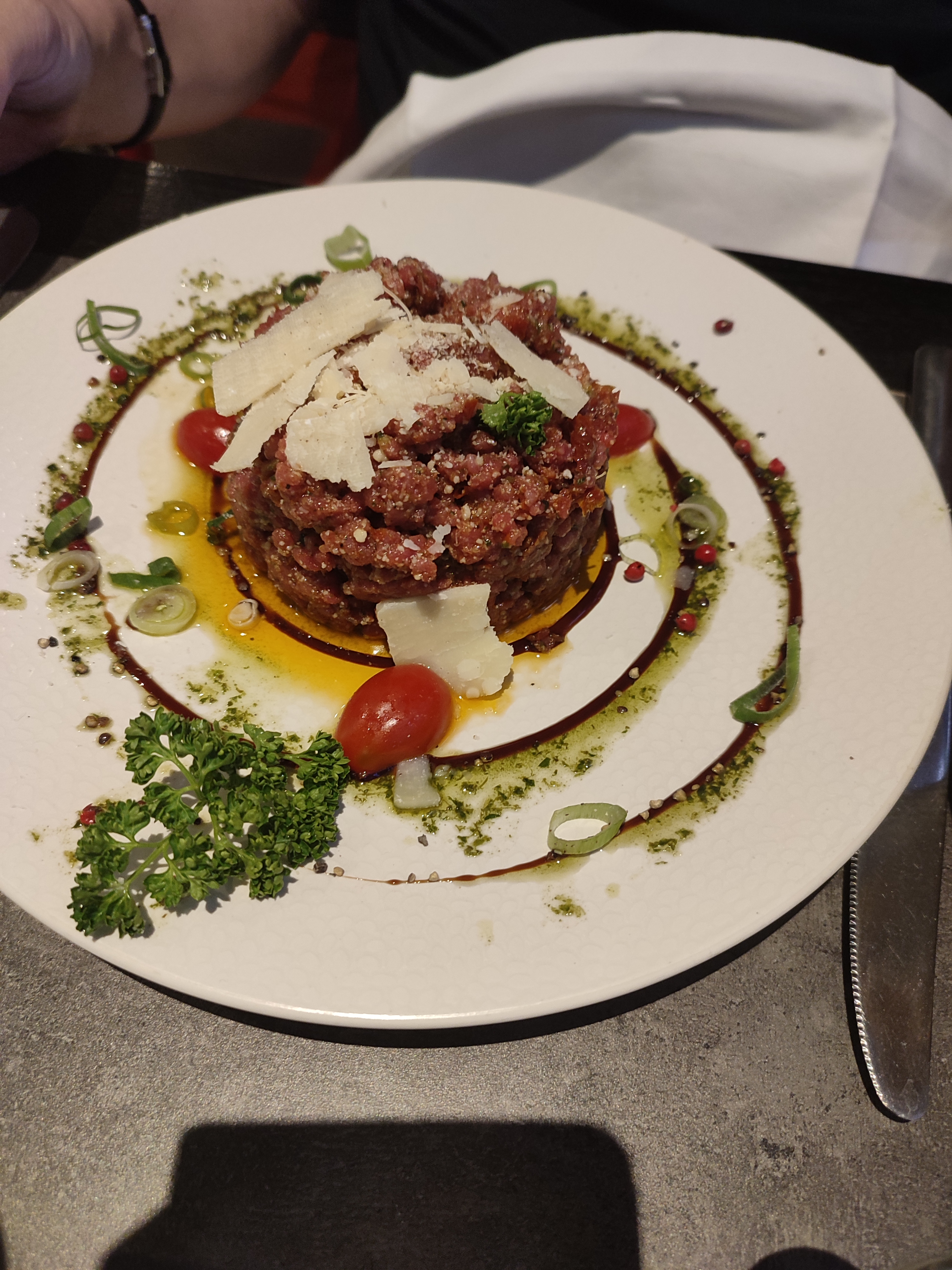 Le tartare était très copieux et très bon Le jarret était aussi copieux et très appétissant, très bon. Grosse déception sur la cuisse de canard, ni bon ni mauvaise, mais très sèche. Manque une petite vinaigrette sur la salade. Par contre le service est top. Le serveur très sympa . Je recommande 😊 je mets trois étoiles seulement parce que c est moi qui ai mangé la cuisse de canard 😌