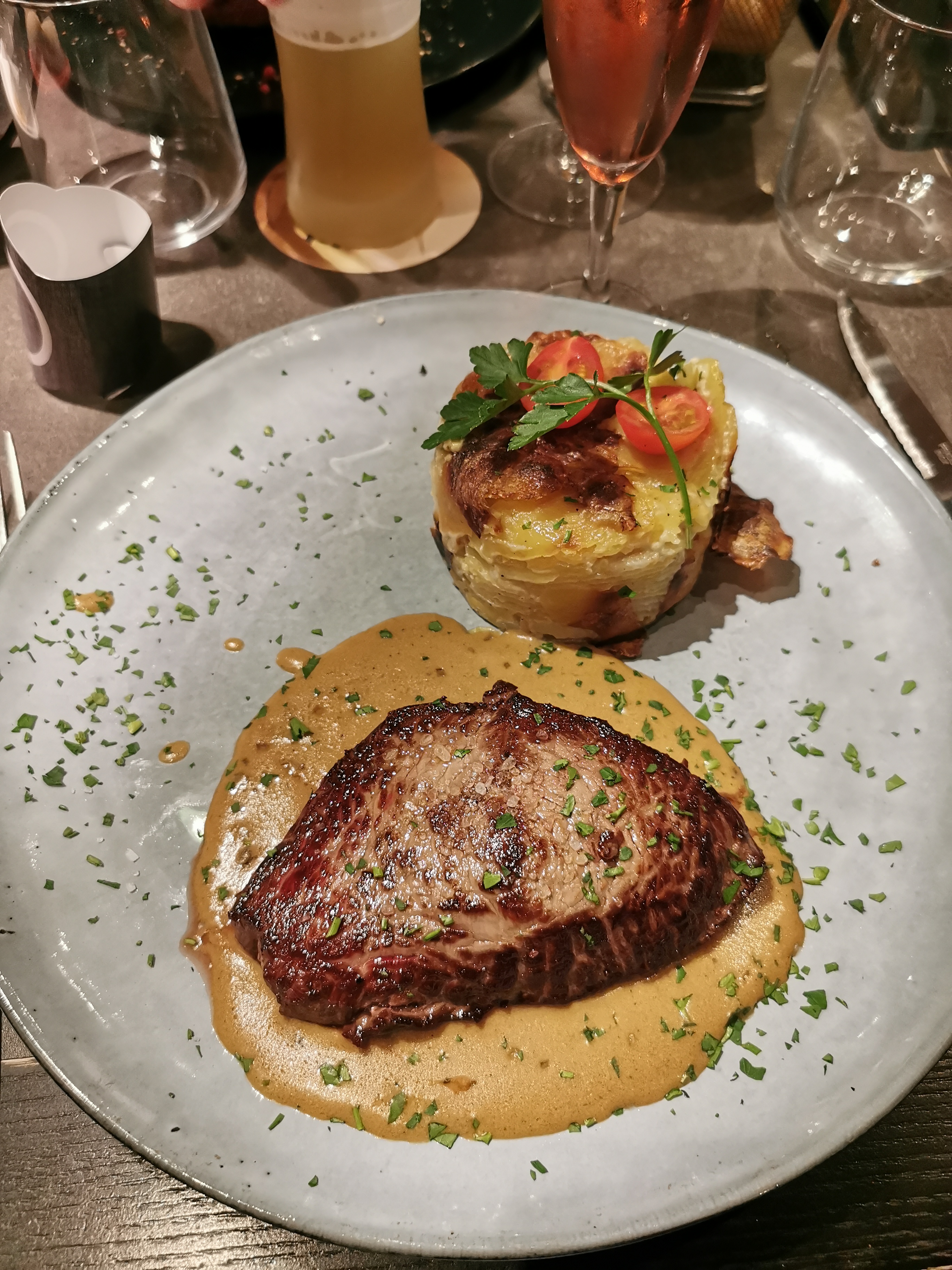 Malgré des serveuses agréables, un service très long ! Arrivés à 20h30, servi qu’à 21h40. Pour des plats plus que limites, des pommes de terres crues et noircies à l’intérieur (heureusement que le serveur est venu nous échanger les pommes de terres sautés) ! Le saumon trop cuit. Les cuissons des viandes n’était pas celles demandés (bleu au lieu de saignante) Une addition salée, pour seulement cocktail et plat : 125,50€ à 5. Sans aucun geste commercial malgré notre mécontentement exprimé !