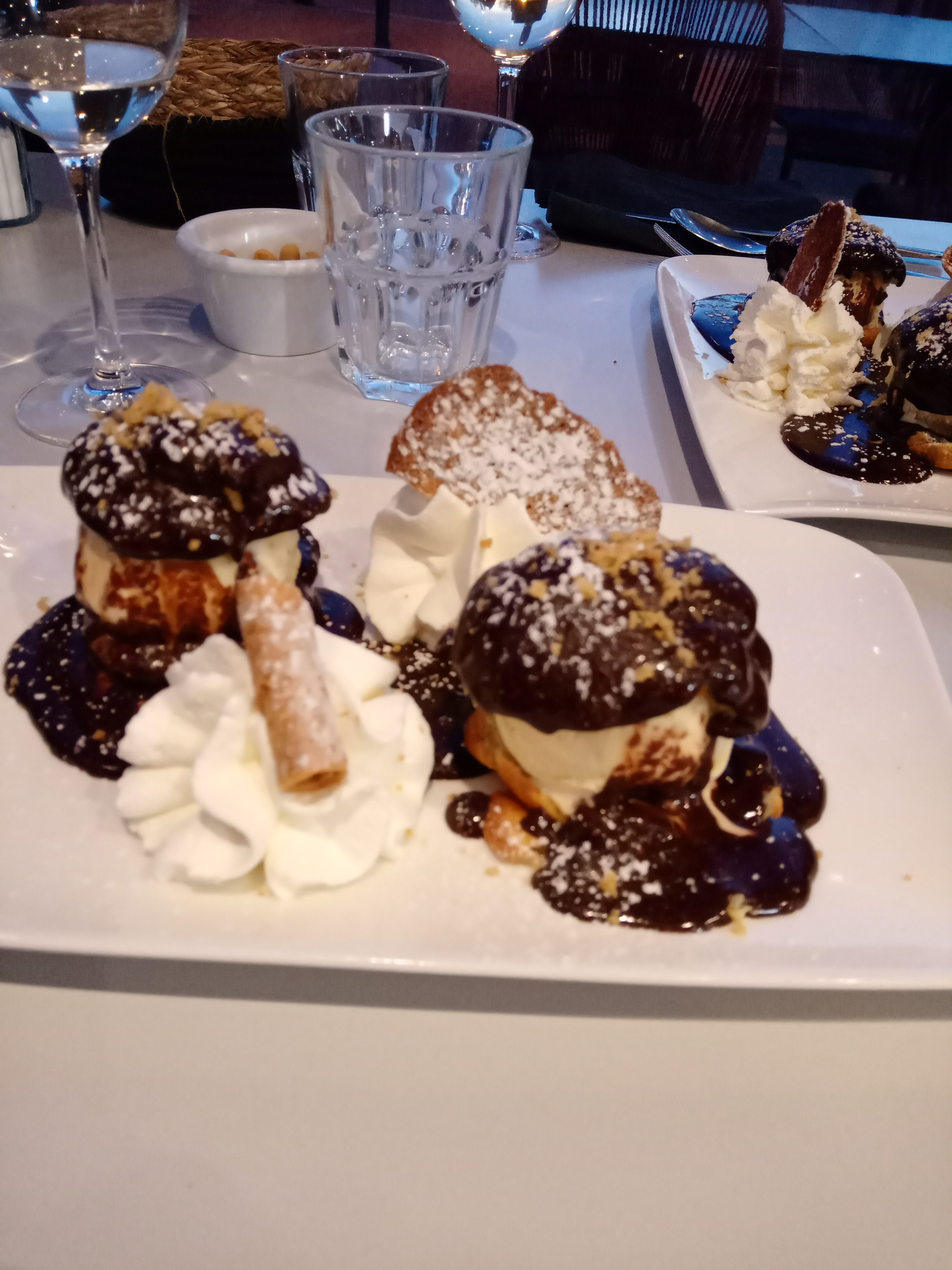 Terrasse agréable. J'ai pris des profiteroles assez quelconques, j'aurais dû prendre un dessert fait maison ( moelleux ou tiramisu).... service agréable.