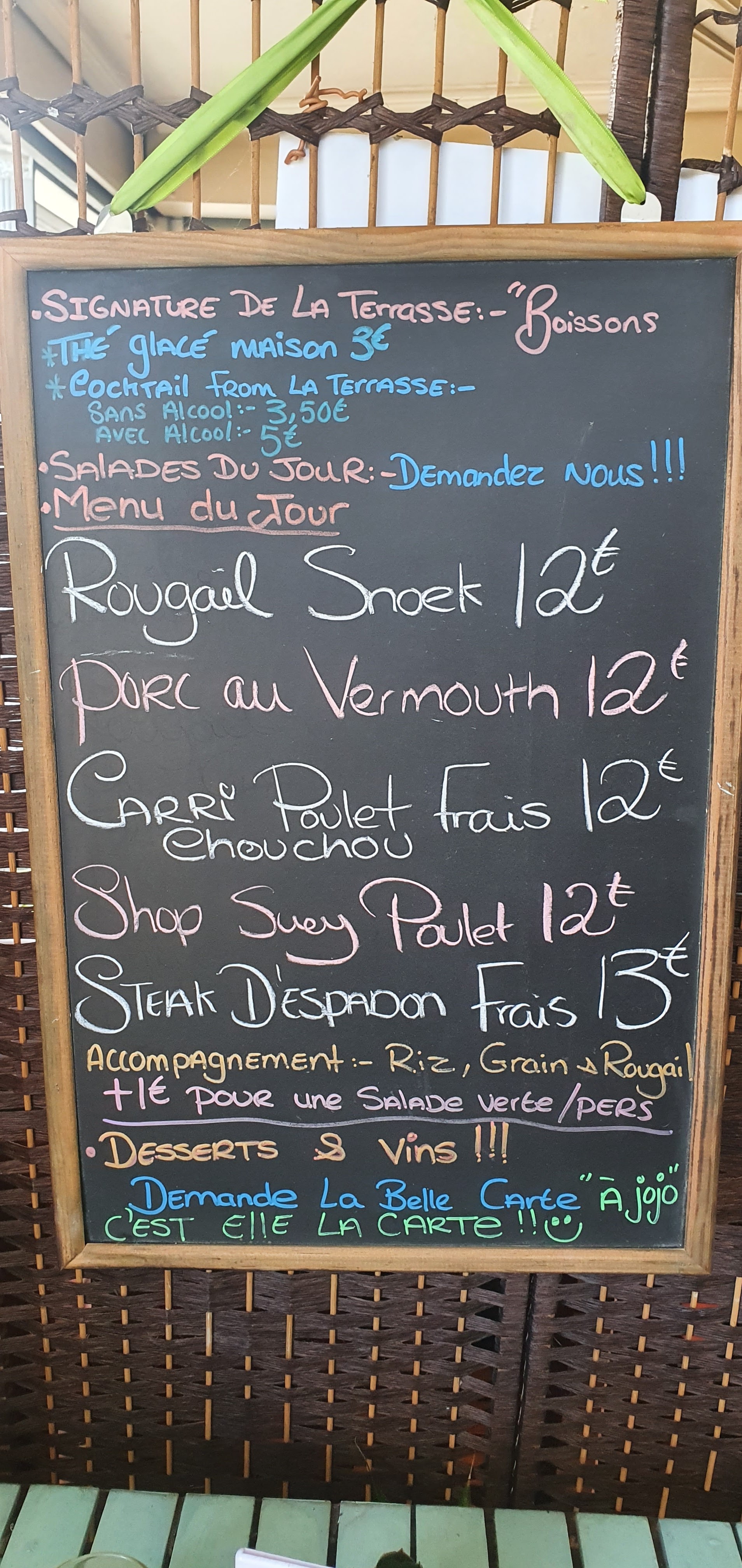 Arrivés un peu tard ce midi et au hasard dans ce petit restaurant, nous avons été reçus par une jeune femme avenante et pleine d'enthousiasme. Elle nous signale aussitôt que beucoup de plats ne sont plus disponibles a la carte et nous décidons, ma femme et moi de lui faire confiance...et nous ne l'avons pas regretté. Avec une bonne bière locale, elle nous sert un massalé de thon et d'espadon ainsi qu'un chop suay de poulet (là je ne suis pas sûr du nom) et nous nous sommes régalés. Nous discutons avec elle et comme c'est notre 1ère visite dans cette belle ile de la Réunion, elle prend sur son temps et nous liste tout un tas de choses à voir pour les prochains jours ( c'est en cours Jojo!). On mange bien, on passe du bon temps, on apprend plein de chose, on rigole...bref, on t'aime Jojo et on ne t'oubliera pas de sitôt. Des touristes enchanté, Pascal et Patricia