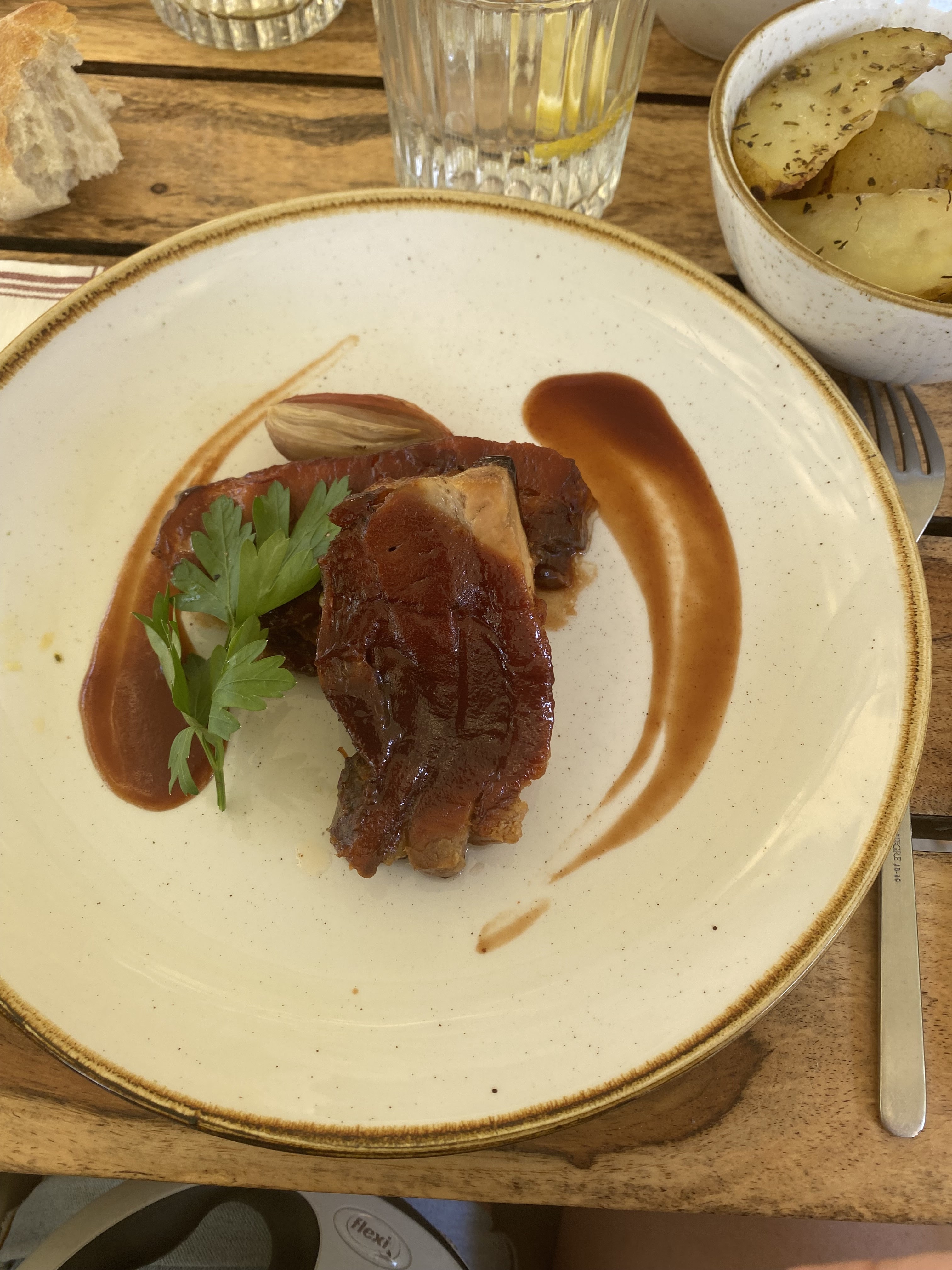 Terrasse sympathique devant la rivière, service très agréable, mais avis plus réservé sur certains plats: des assiettes excellentes (côte de veau et travers de veau) et d'autres moins réussies. Nous y retournerons quand même !