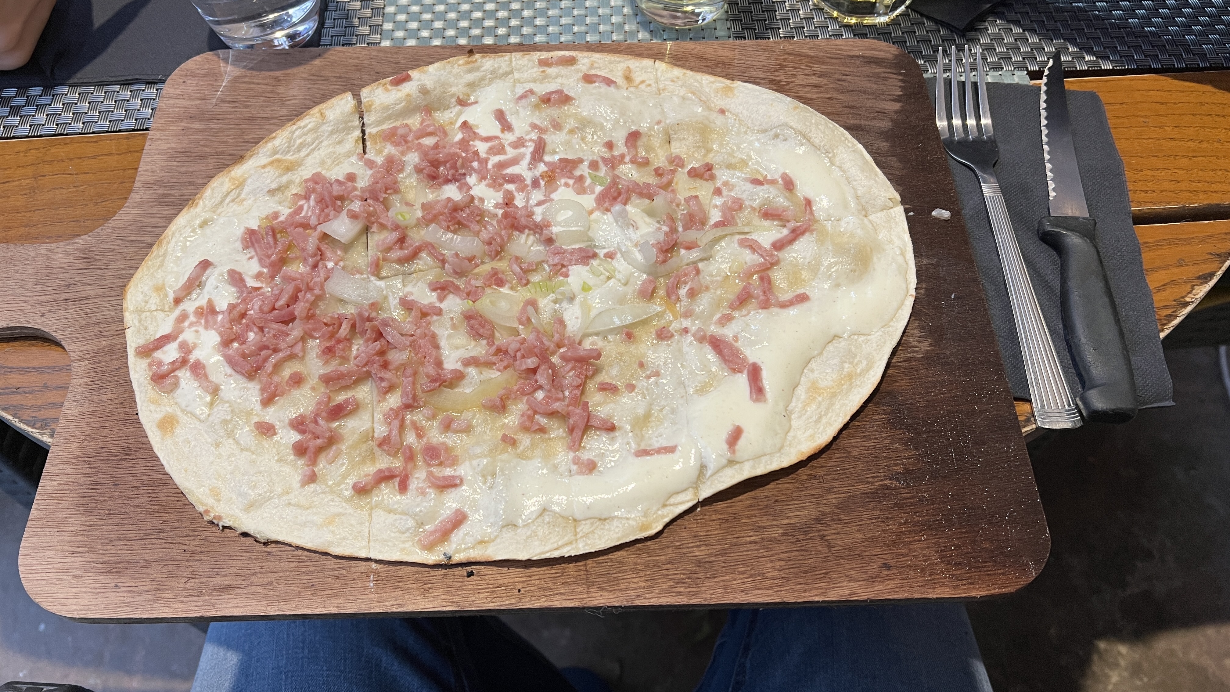 Au menu, principalement de la tarte flambée dans une variété de modèles. Lorsque nous nous sommes assis à une table dehors à 20h20, le menu nous a été apporté et peu de temps après, on nous a dit que toutes les tartes flambées étaient sorties aujourd'hui. Nous serions également inhabituellement rejetés dans le restaurant d'en face. Apparemment, ces hôtes s'en sortent trop bien pour n'avoir plus besoin d'être amicaux et arrangeants.