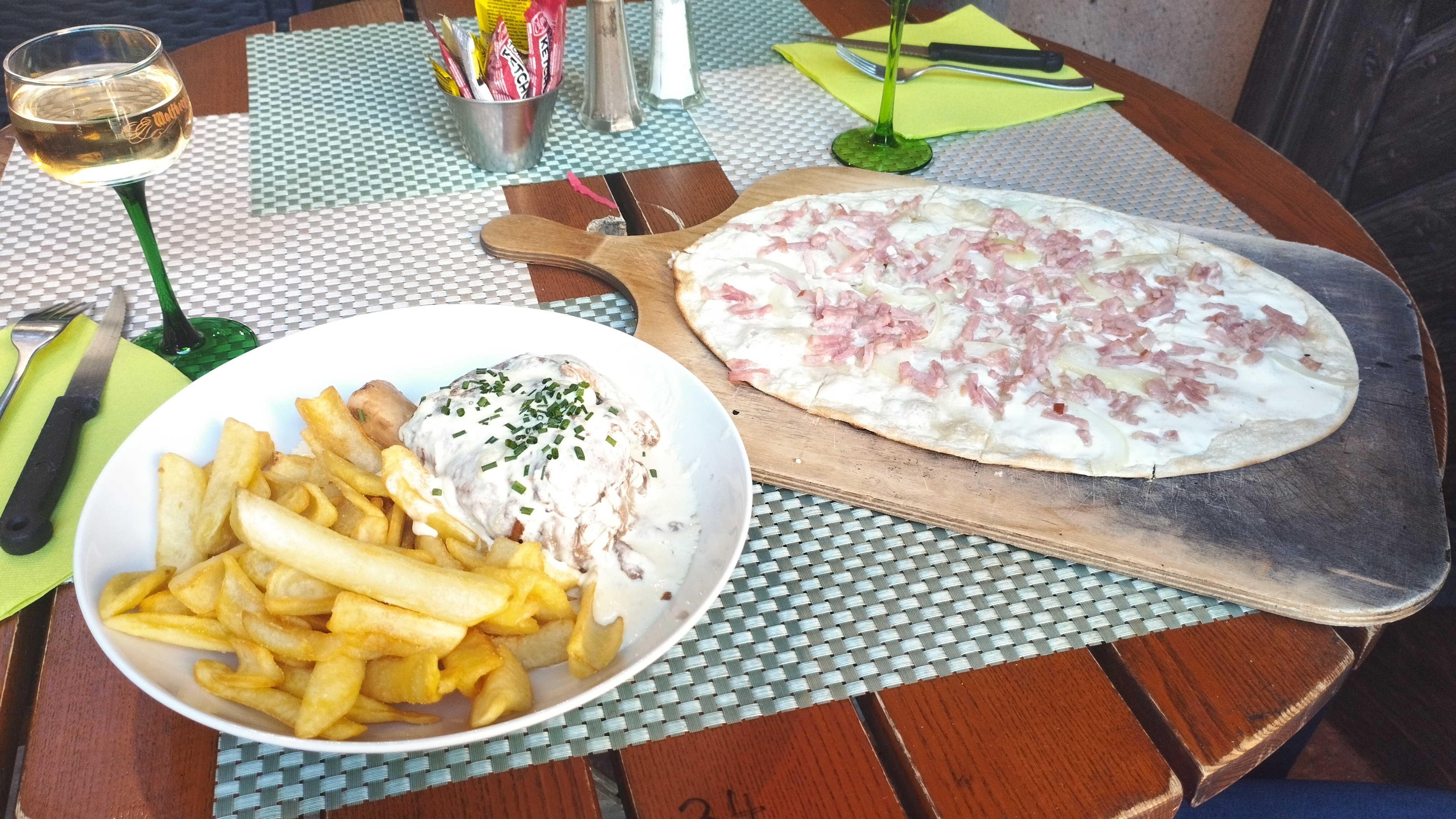 Tarte flambée très fine et fine. Bon Gewürztraminer. Bon service. Hautement recommandé.