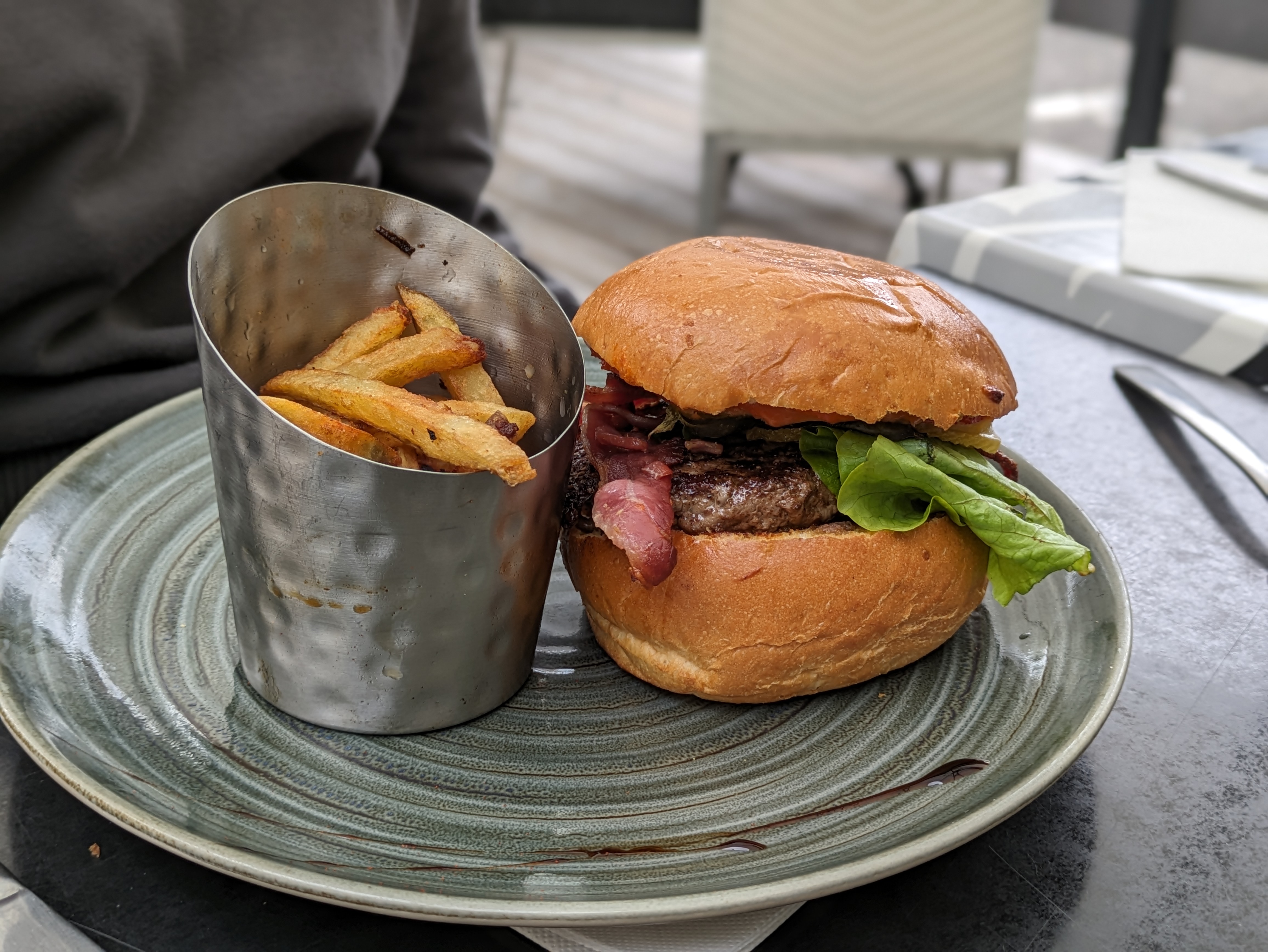 A FUIR!!! Un burger (la base dans n’importe quel restaurant en général) avec un pain qui ne peut pas se couper tellement il est dur au-dessus et en dessous, la responsable daigne en refaire tout en nous proposant de nous laisser les frites ?? Et donc on mange des frites froides 15min plus tard? Résultat de nouveau une assiette avec cette fois des frites pas assez cuites et un burger de nouveau immangeable avec ce pain dur + mauvaise cuisson du steak. Le meilleur pour la fin au moment de payer : Un geste de 10€ sur une note de 110€ alors que les 3/4 sont encore dans les assiettes et pour seule réponse : Oui mais on vous a fait le plat 2 fois ! Madame si votre cuisinier ne sait pas faire des burgers mangeables, c’est principalement votre problème pas celui des clients. On repassera (surtout pas) pour le coté commerçant !