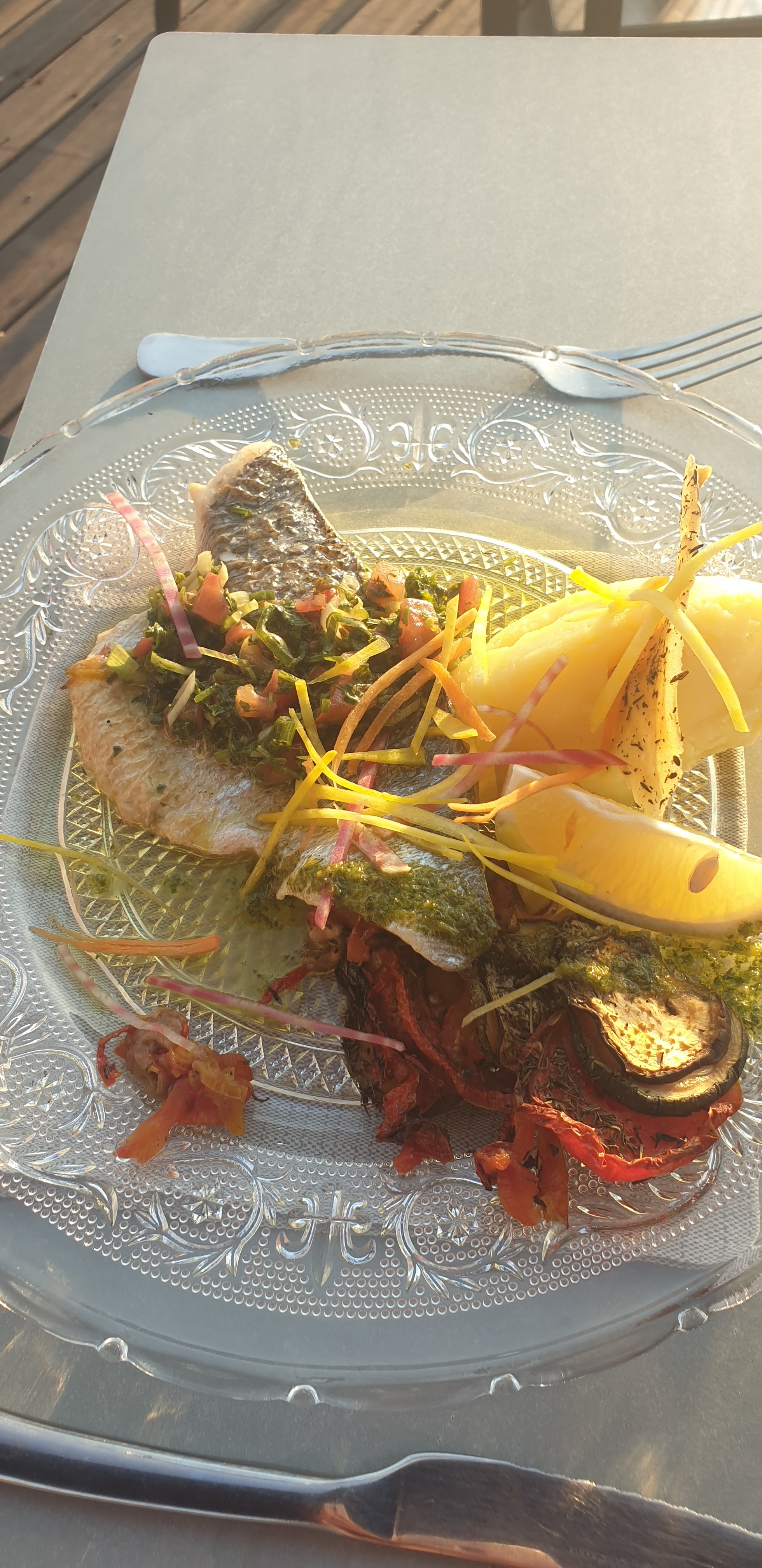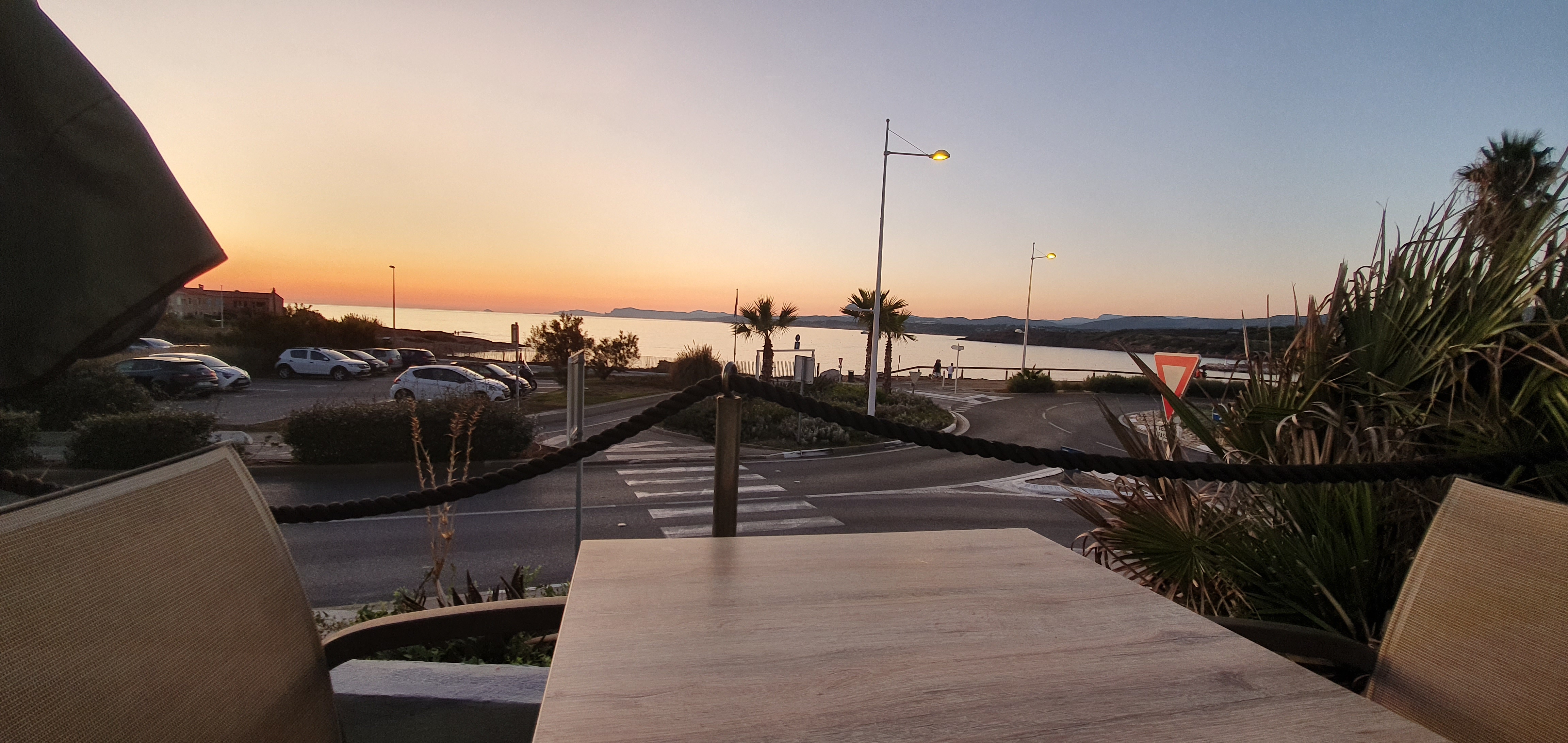 Bel emplacement avec vue sur l'océan et superbes couchers de soleil, dommage que vous regardiez aussi sur la route et le rond-point. Le service était très lent, il leur a fallu environ 30 minutes pour prendre notre commande en tant que seul preneur de commande. A le Rouget, mais tout dans l'assiette était froid et les légumes peu appétissants. Pour le prix, la nourriture aurait dû être chaude et de meilleure qualité