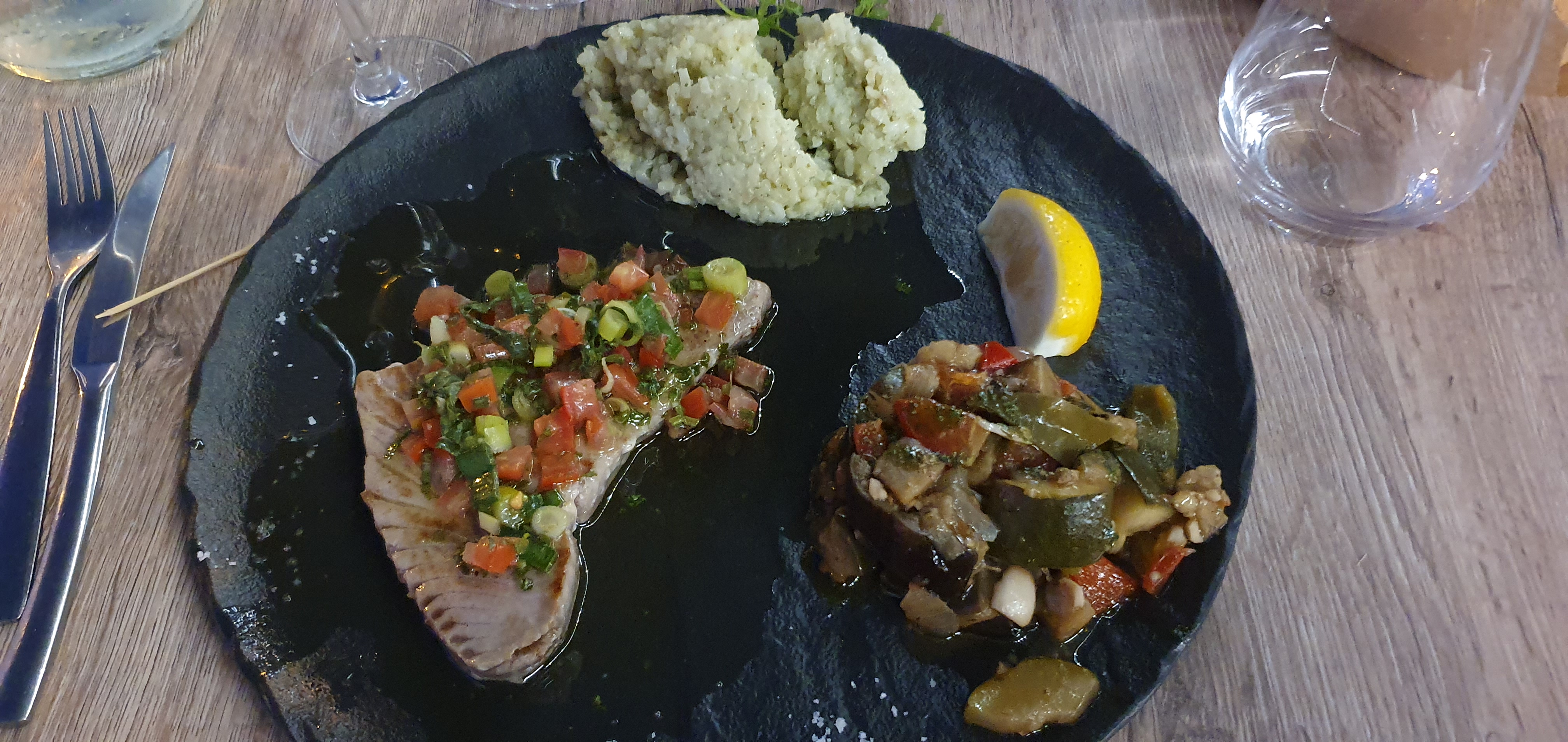 Tout était parfait ! Bien conseillés, nous avons dégusté un succulent poisson frais et une très bonne viande. Produits locaux. Serveurs jeunes et sympas cela vaut vraiment le détour !