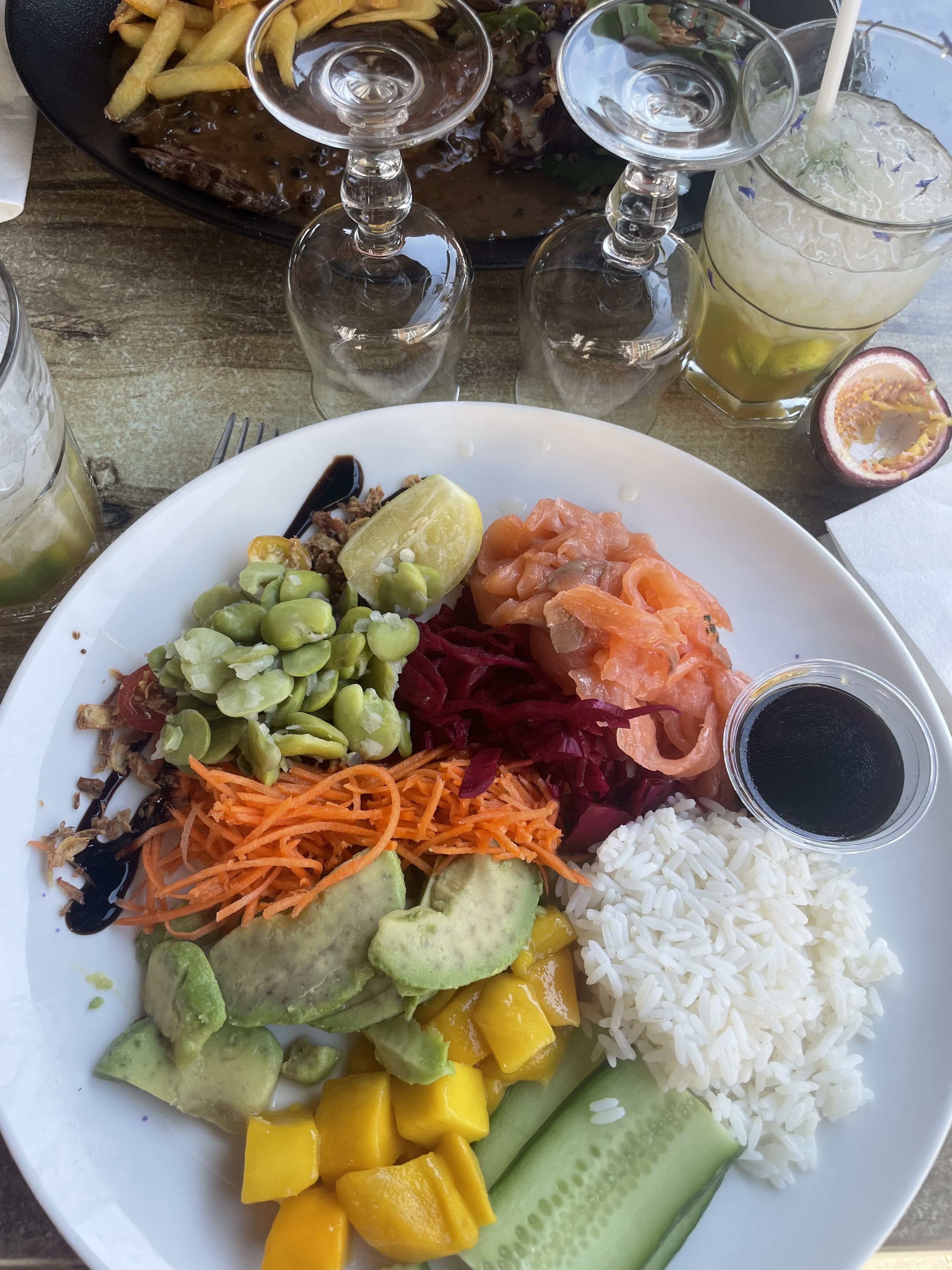 Bon cocktail mojito passion, tequila sunrise (la meilleure partie) super presentation de plus. Un peu déçue sur le pokebowl, les avocats, choux et carottes n’avait pas de goût, on remarque des taches brunes sur les avocats, pas terrible. Un peu cher 19€ pour ce plat. J’avais déjà été décue la dernière fois avec moules/frites (froid et pas top) Je met 3 étoiles.