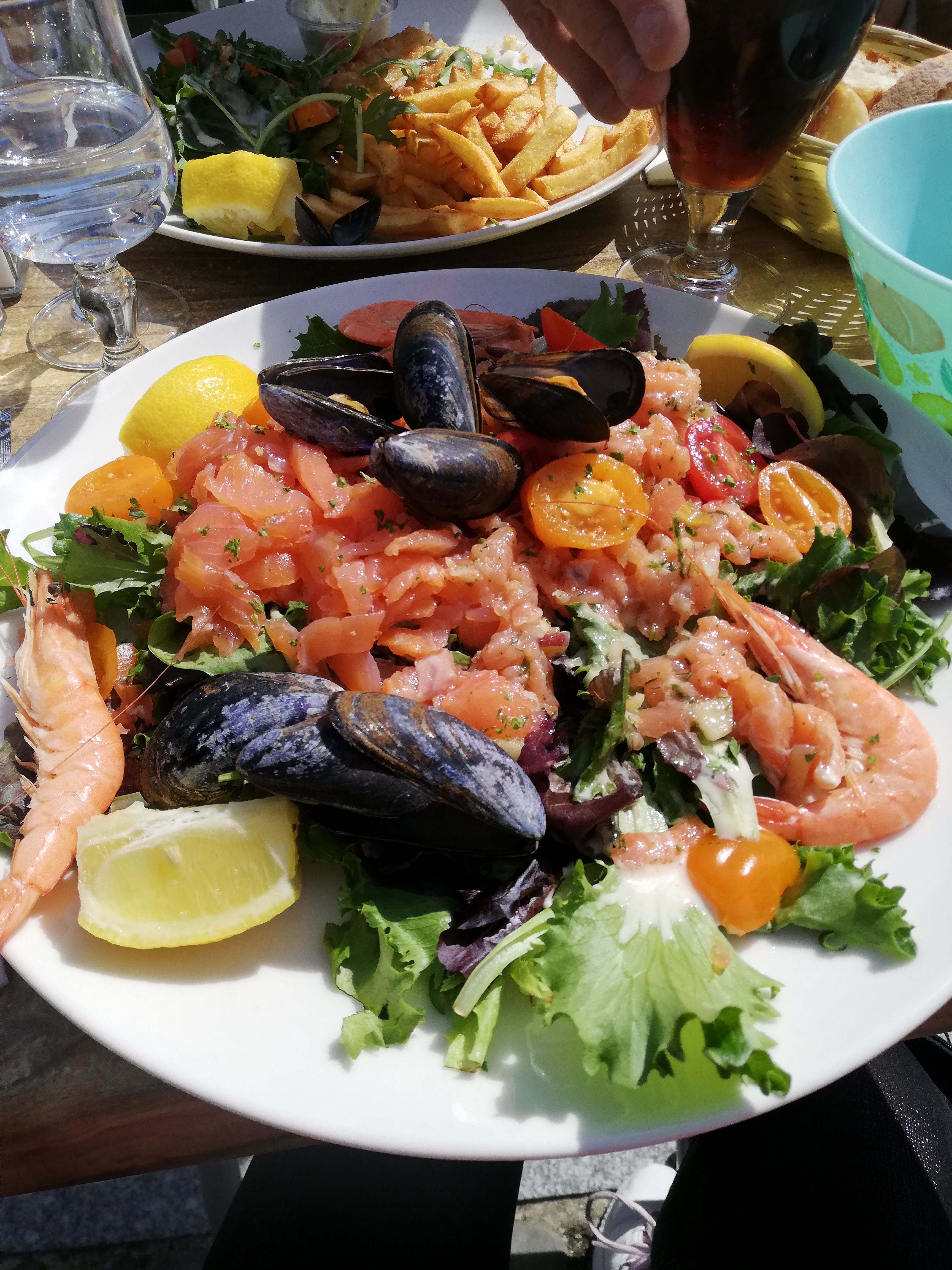 Très belle vue, salade pirate bien copieuse mais toujours pas digérée plusieurs heures après... Saumon de très basse qualité, en miettes pour le saumon fumé. Les tomates sont inmangeables mais à cette saison ce n'est pas étonnant. Mon mari a pris une assiette de fruits de mer, pas top , avec mayonnaise industrielle bas de gamme... Bref, vraiment déçus de ce restaurant malgré la vue superbe