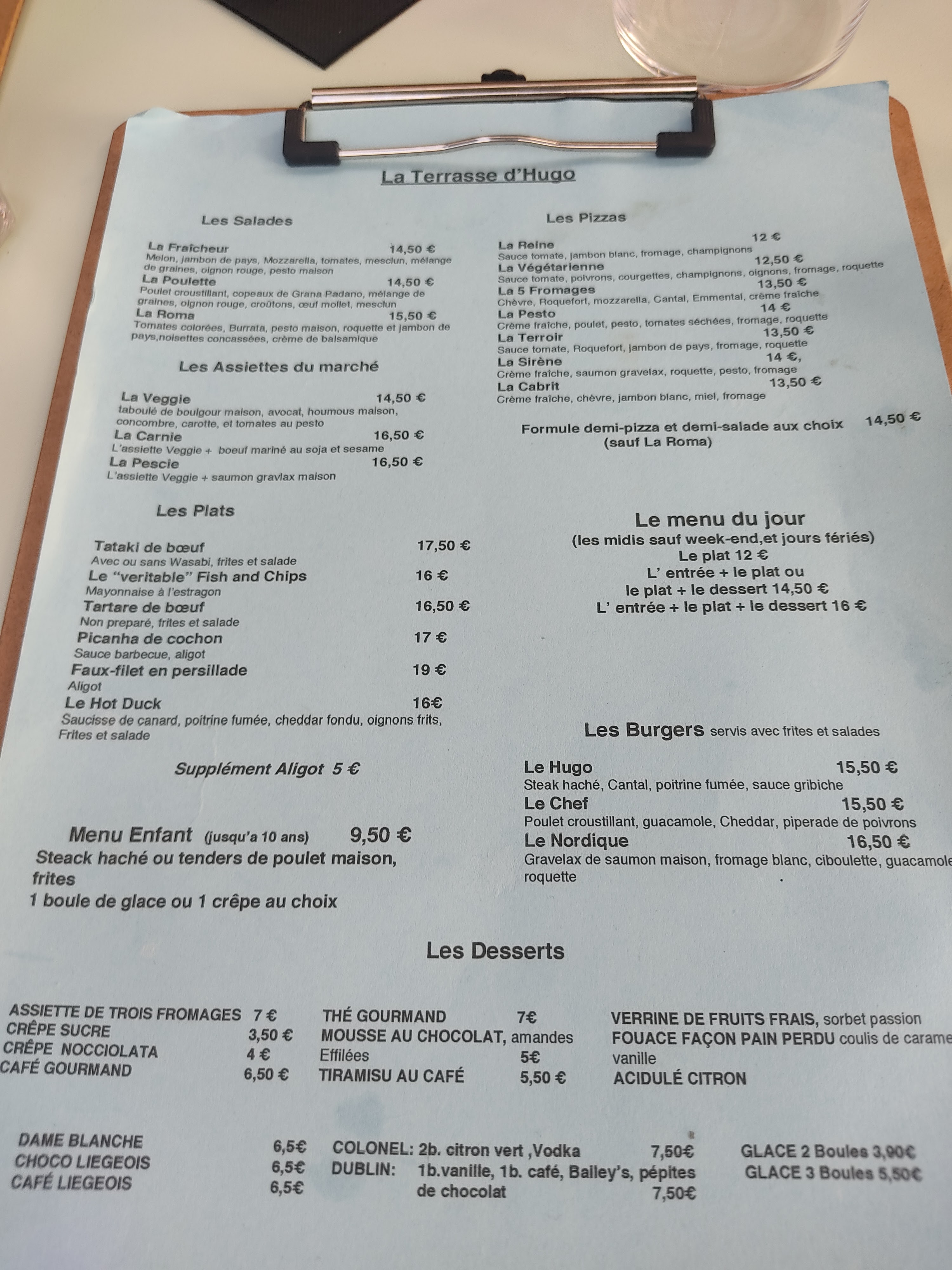 Nous avons apprécié notre repas à la terrasse d'hugo. Le décors est reposant et chaleureux. Nous avons prix le menu du jour qui était un délice. Le Chili con carne était super bien épicé, moi qui aime que cela soit relevé j'en était très heureuse. Il est preferable de réserver. Le service a été rapide et les assiettes généreuses.