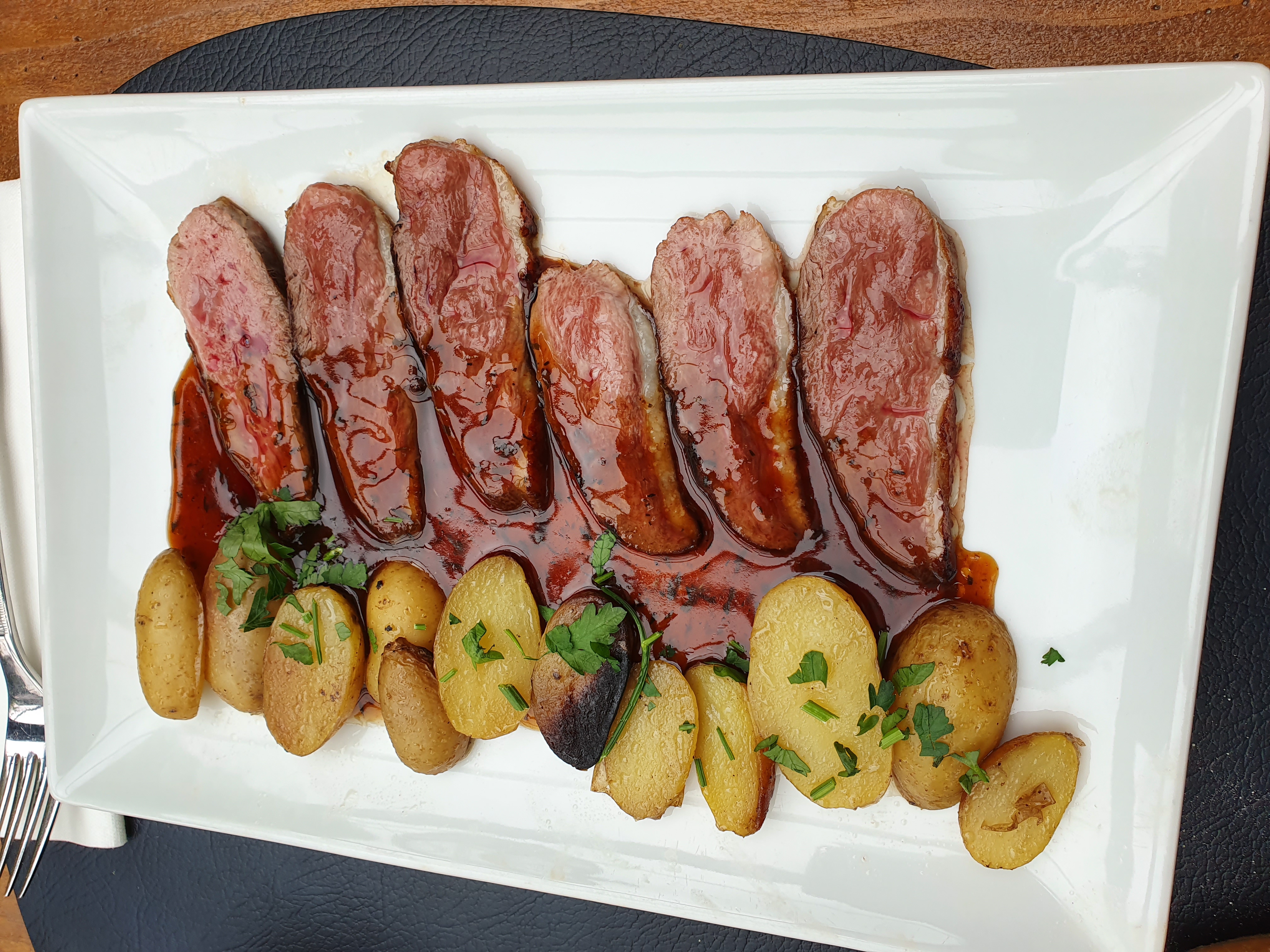 Nous y avons dîné. Acceuil cordial et professionnel. Dans le menu à 25 € nous avons choisi le duo de foie gras : très bon et fait maison . Puis la pièce de boeuf : cuisson suivant notre demande avec une sauce de réduction de viande. Viande très tendre et sauce délicieuse. Fromages et dessert à l'avenant. Tout était très bon. Produits frais et cuisine maison. A recommander si vous passez par ici.