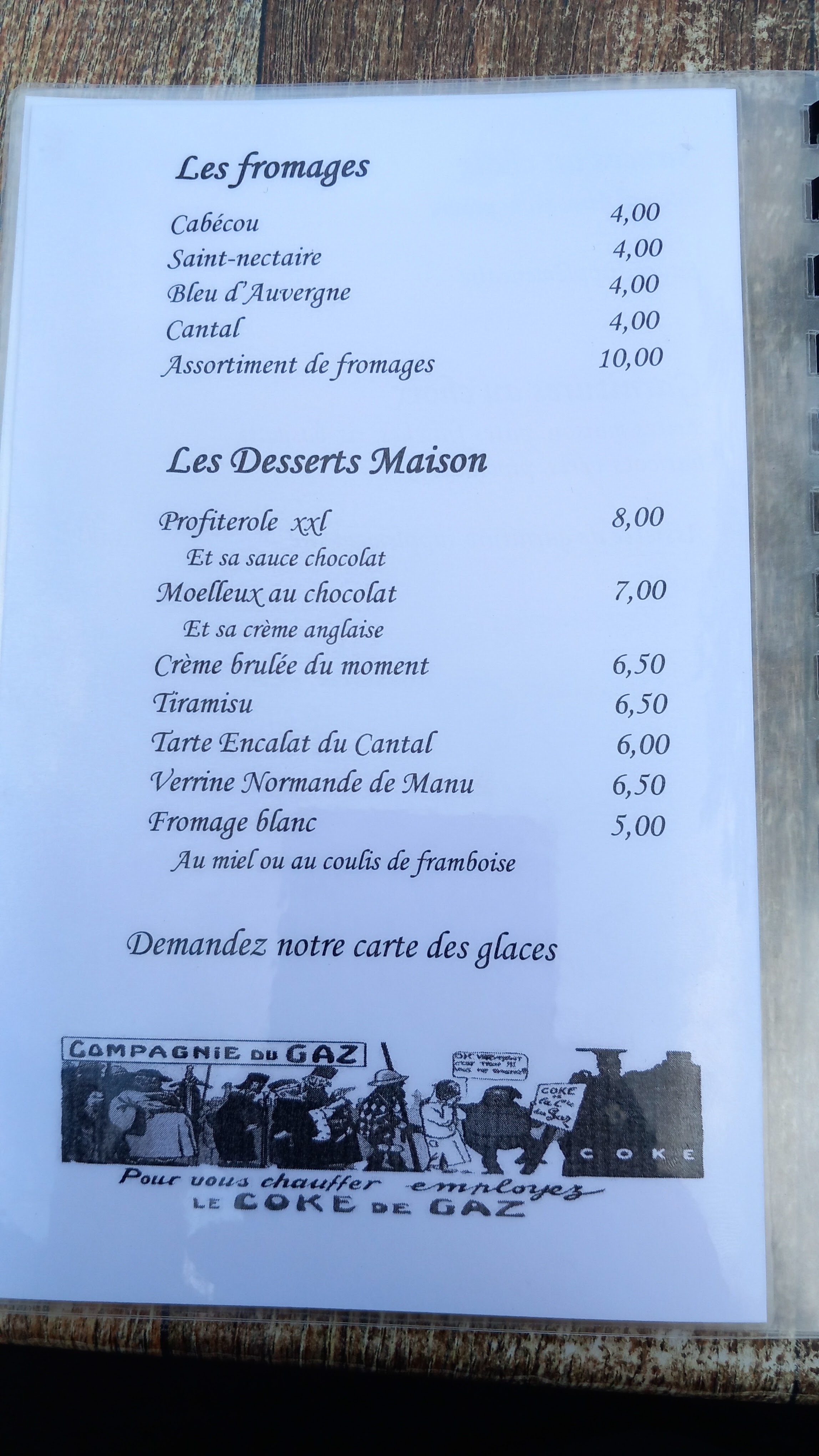 Un lieu désuet, un service aimable, une viande peu tendre et une absence de vrai couteau à viande, des haricots verts surgelés très mal cuisinés, une sauce au bleu qui n'en a que le nom, une verrine aux pommes caramélisées froides dont on sent plus le goût du beurre passé au frigo que de la pomme. Cela aurait mérité une mise en place de dernière minute avec des pommes chaudes et un contraste avec la crème à la châtaigne fraîche. Seul l'accompagnement de la saucisse d'Auvergne était réellement correct. Ce n'est pas une adresse à conseiller.