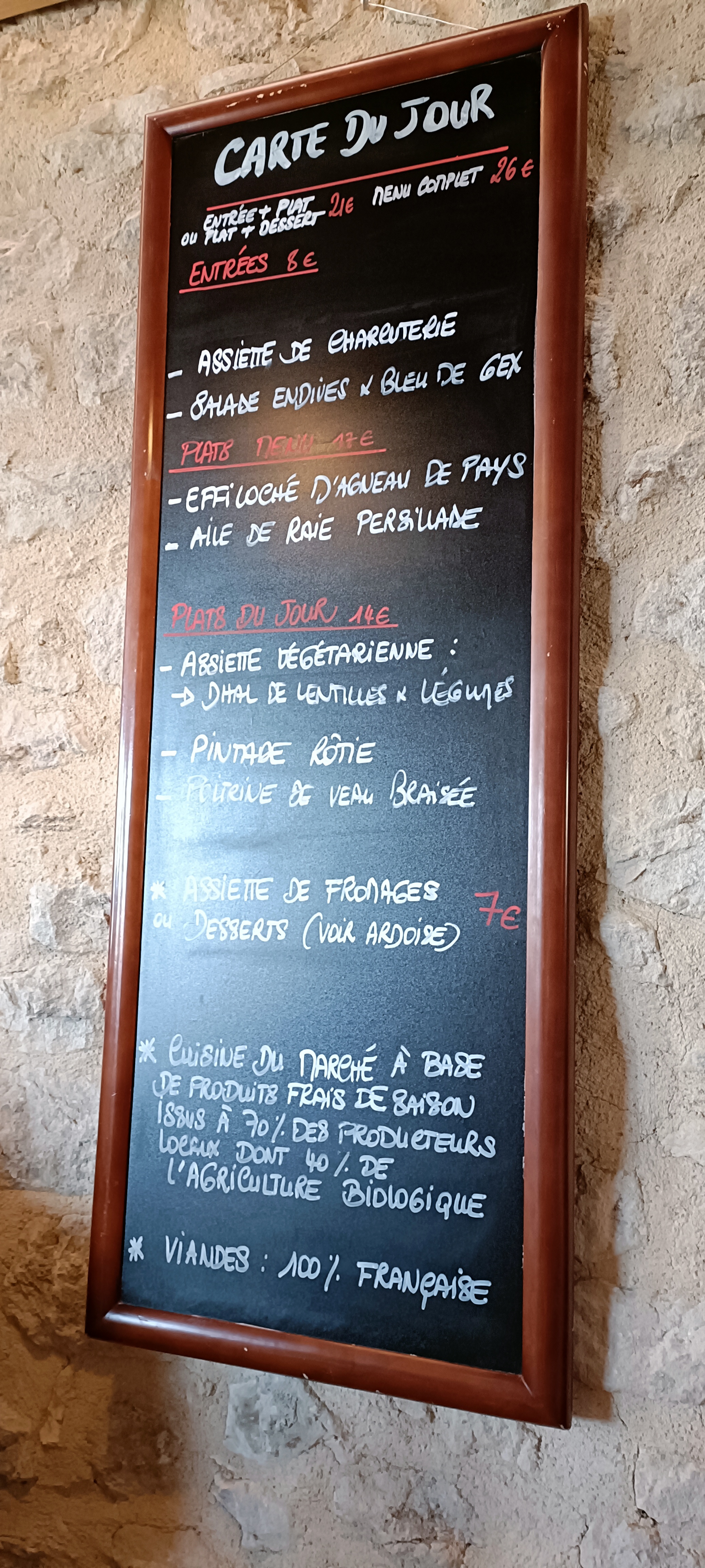 Depuis la Terrasse, vous aurez une jolie vue qui surplombe la vallée. Les conditions de distanciation sont respectées. Le plat du jour coûte 13 €, il est succinct tant dans la quantité que l'originalité , puisqu'ayant commandé une assiette végétarienne et pensant manger des crudités ou des légumes d'été, on nous a servi un plat de pâtes au pesto ....Le garcon de service était affable et rapide, la serveuse n'était pas souriante du tout