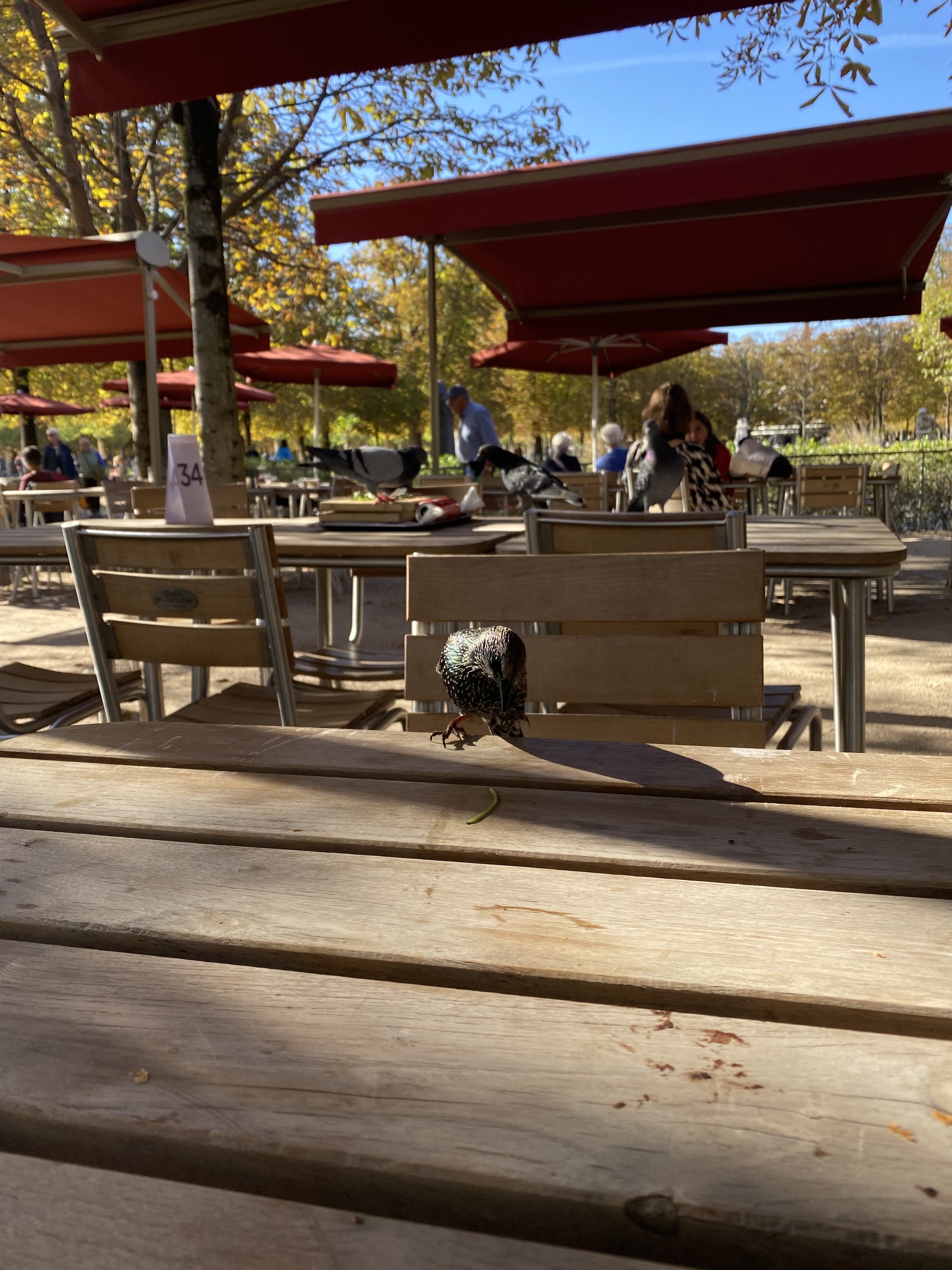 Agréable pour le lieu, en plein jardin des tuileries. Service rapide et toujours une solution pour trouver une table même aux heures d'affluence. En revanche tarifs largement exagérés pour la qualités des consommations, et exagérés pour la qualité du service. Le sourire doit être une option, et le regard fait bien comprendre qu'une table de francais avec enfants rapportera bien moins qu'une table de touristes. Pour le coup je ne suis jamais contre donner un pourboire, mais là le serveur est passé à côté dès qu'il nous a toisé de haut ! Ne vous étonnez pas si les parasols sont ouvert par tout temps, ils servent surtout à protéger des pigeons. Et quand vous les voyez fermés vous comprenez que leur lavage n'est pas la priorité du lieu...