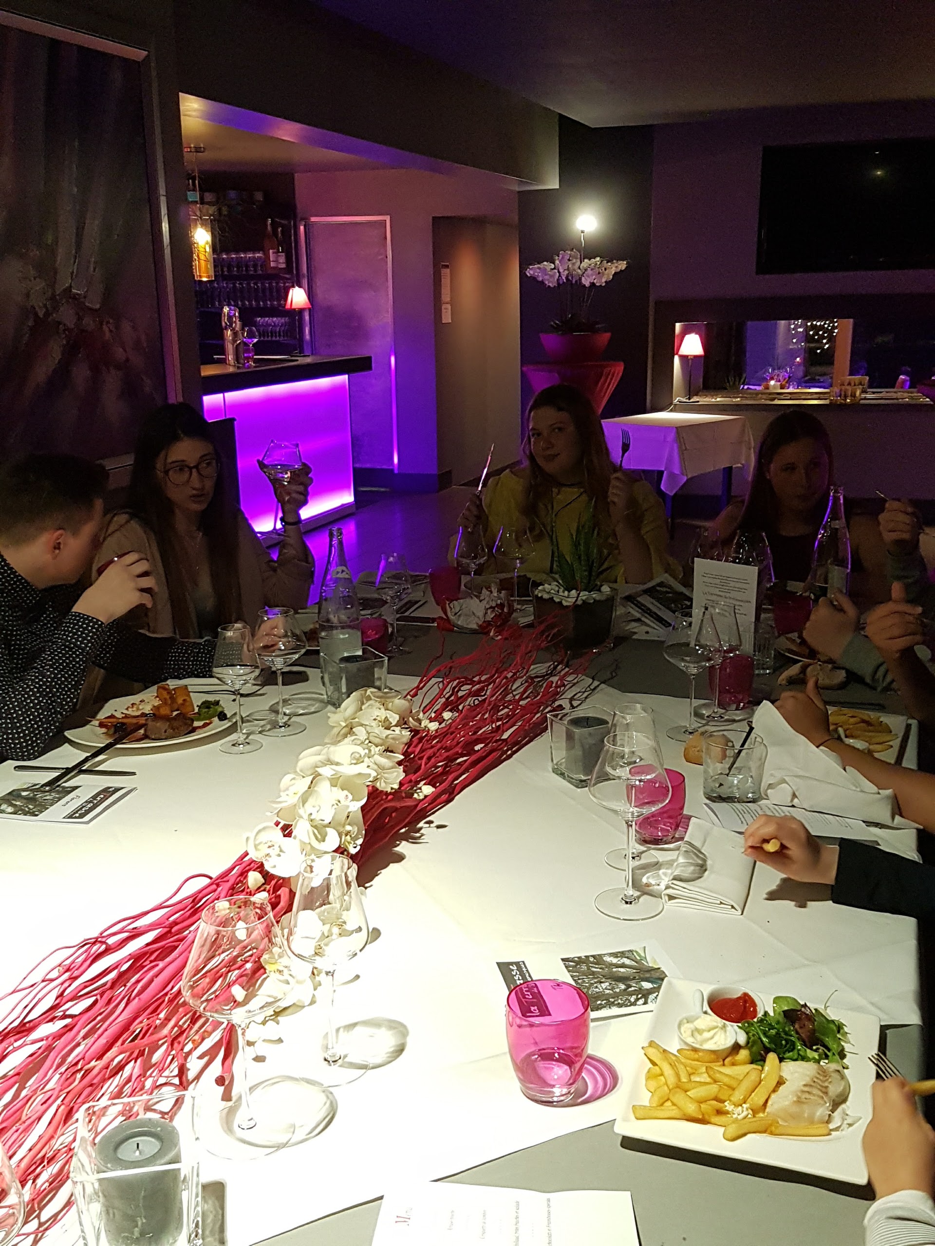 à l'occasion d'un anniversaire, nous étions 9 autour d'une table ronde. points négatifs : - en entrant par la terrasse, la première table a une nappe trouée!, - il a fallu que nous avancions jusqu'au bar en parlant haut et appelant pour qu'un serveur arrive au bout d'un moment (nous étions les premiers), - ensuite quand nous étions tous bien installé, il a fallu l'appeler alors qu'il était accoudé dans le coin du bar en nous regardant, et nous avons eu les menus tout juste nettoyés mais non séchés (pas agréable, avons renvoyé) - le serveur n'est vraiment pas loquace mais il a bien conseillé sur les vins (une découverte de cépage). - le pauvre couple, seul autres clients de la soirée, a été placé jusque à coté de nous, or nous étions particulièrement bruyant! POINTS POSITIFS : - le parking, - la terrasse avec son petit parc, - la déco du restaurant moderne et épurée (éclairage rose - un peu space pour ceux qui n'aiment pas le rose),nappe et serviette en tissu ouvert sur le jardin, les magnifiques orchidées, la statue!!! - Une grande table ronde pour nous accueillir à 9 - la carte : les descriptifs donnent envies; il y en a pour tout les gouts petits/gros mangeurs, viandes, poissons, végétariens et, ce qui est bien, on retrouve les plats des menus dans la carte. - le service : certes le serveur n'est pas loquace mais le service est Ok (bon en tout il y avait 11 clients) - les plats : des menus - jolie présentation, nous nous sommes tous régalés et n'avons rien laissé. au final: une excellente soirée. Nous avons l'intention de revenir et aussi d'essayer la terrasse aux beaux jours -