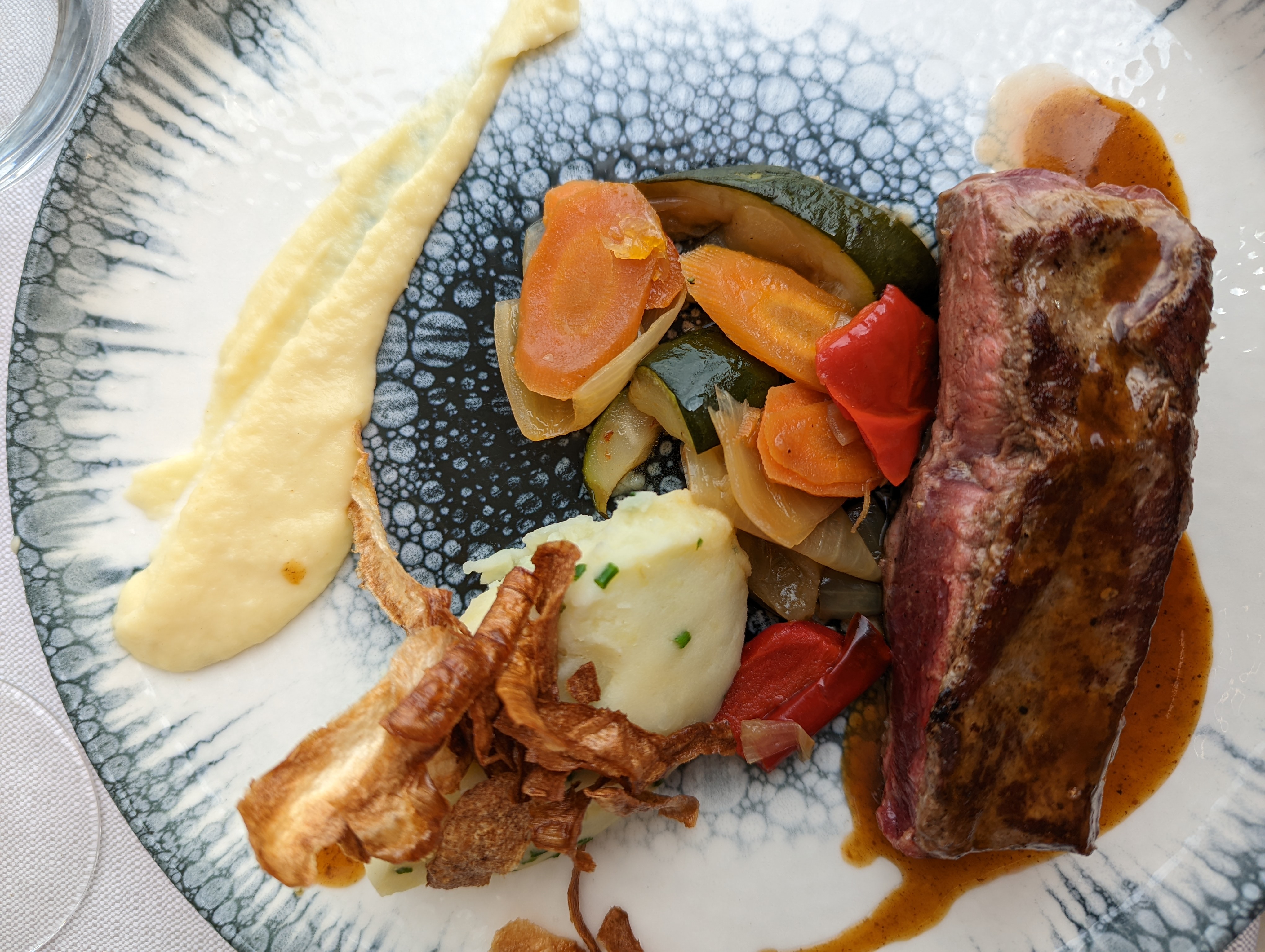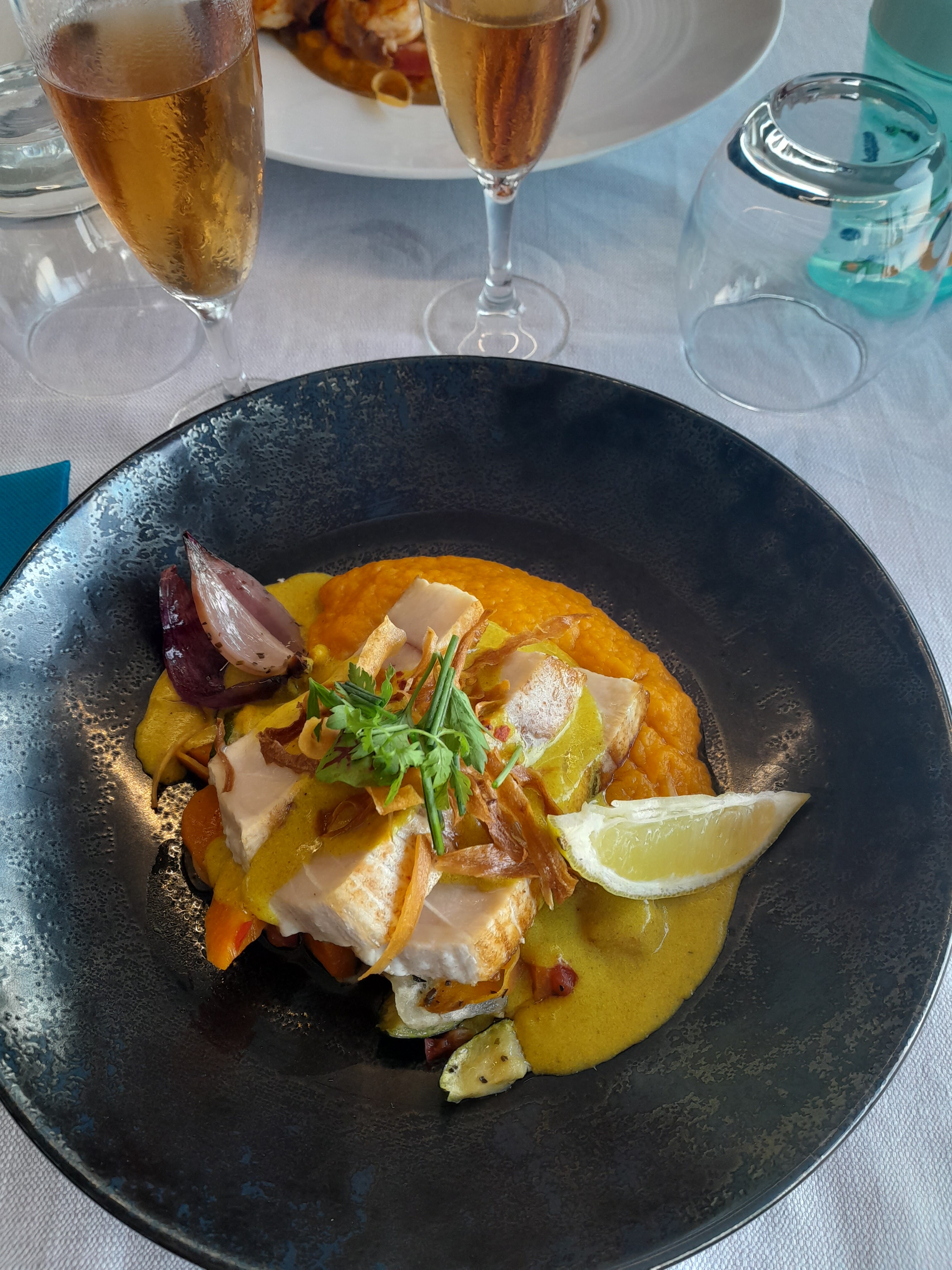 J'ai pris des gambas en plat (5 gambas )avec la de purée de patate douce qui avait aucun goût. Le dessert tarte au poire pareil pas de goût. Très déçu même si les plat son super bien présenter.