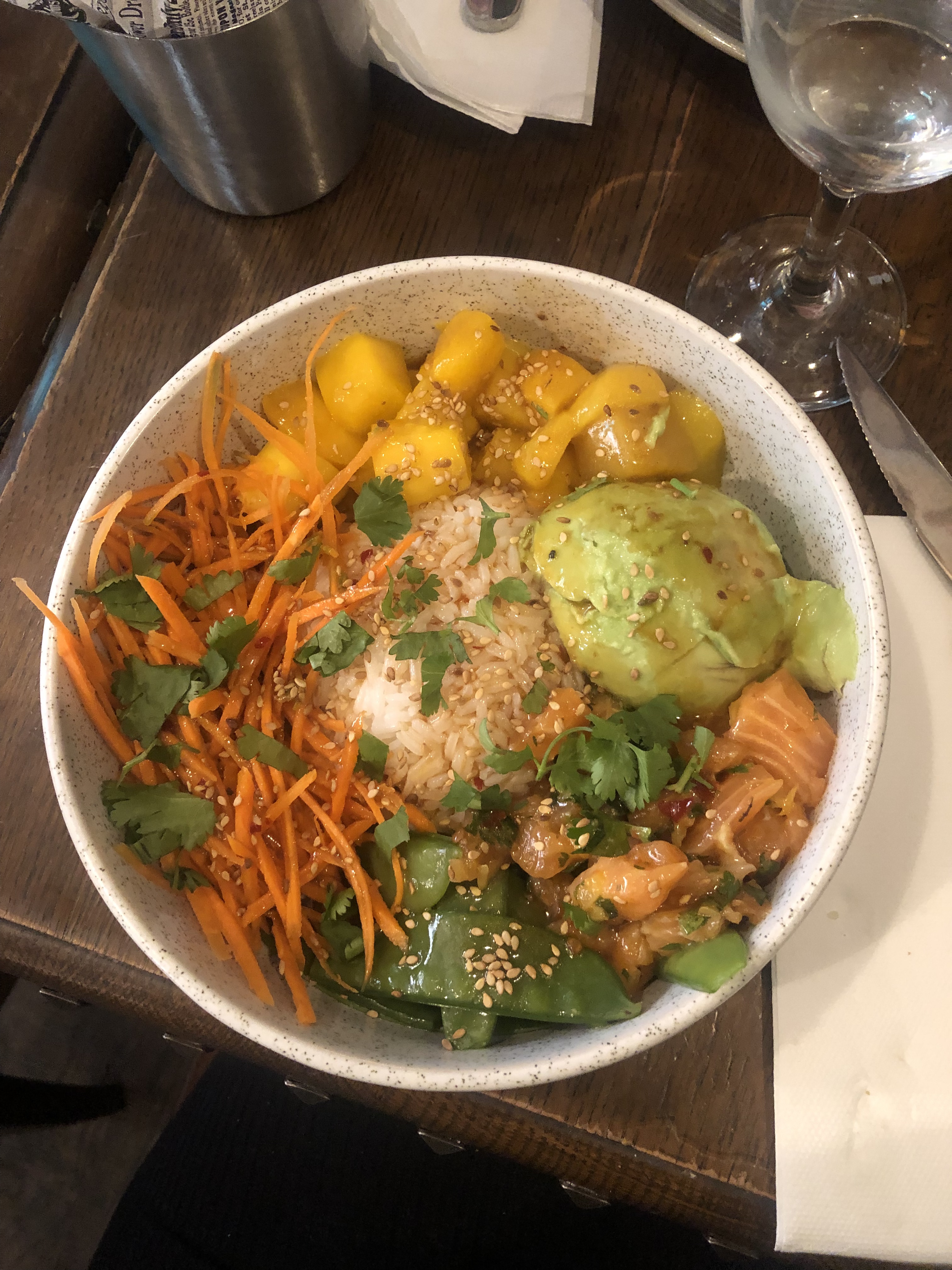Concernant les plats que j’ai goûtés; la quiche du jour (souvent au chèvre) et les lasagnes aubergines sont bonnes, bien que les courgettes gâchent le goût du plat à mon avis; j’ai le souvenir qu’il n’y en avait pas à un moment ?. Les lasagnes végétariennes classiques (parmigiani: aubergine, sauce tomate, mozzarella) sont meilleures. Le poke bowl saumon n’est pas très goûteux. Les Nems aux légumes et le toast guacamole sont assez bons aussi. Les plats plus classiques sont d’après mes collègues très bons. Le service est aussi rapide et sympathique. La terrasse est très agréable pour déjeuner lorsqu’il fait beau; tables assez espacées, calme de la rue… 🤝 En somme, les plats sont pour la plupart assez bons, et les prix raisonnables, ce n’est pas délicieux mais le rapport qualité prix est là et c’est un endroit agréable pour manger le midi!