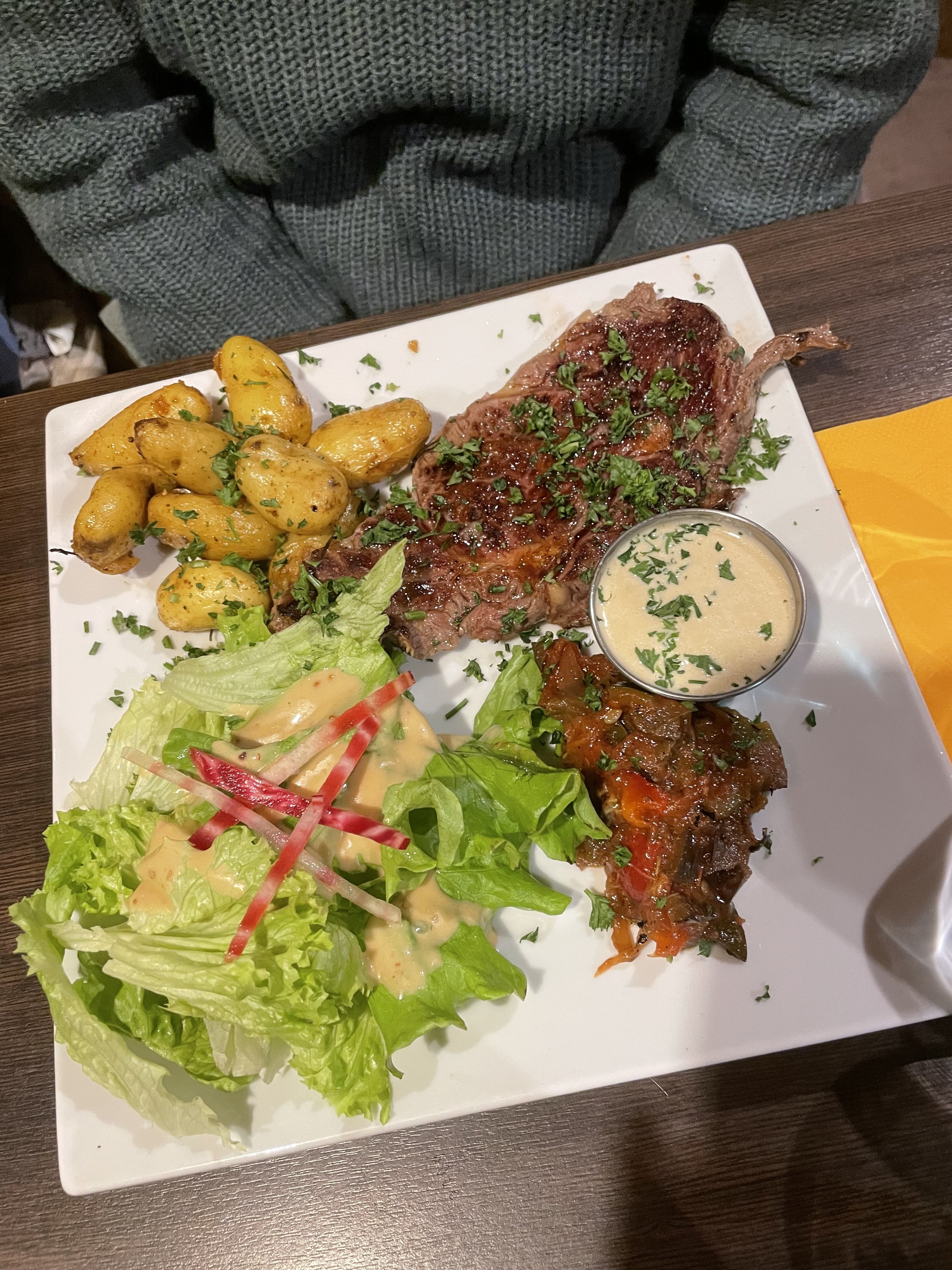 Vraiment un délice. Côte de veau très tendre et excellente. Accompagnement exquise. Je recommande vivement. Et j'en parlerai autour de moi. Service et accueil impeccable. Je reviendrai.