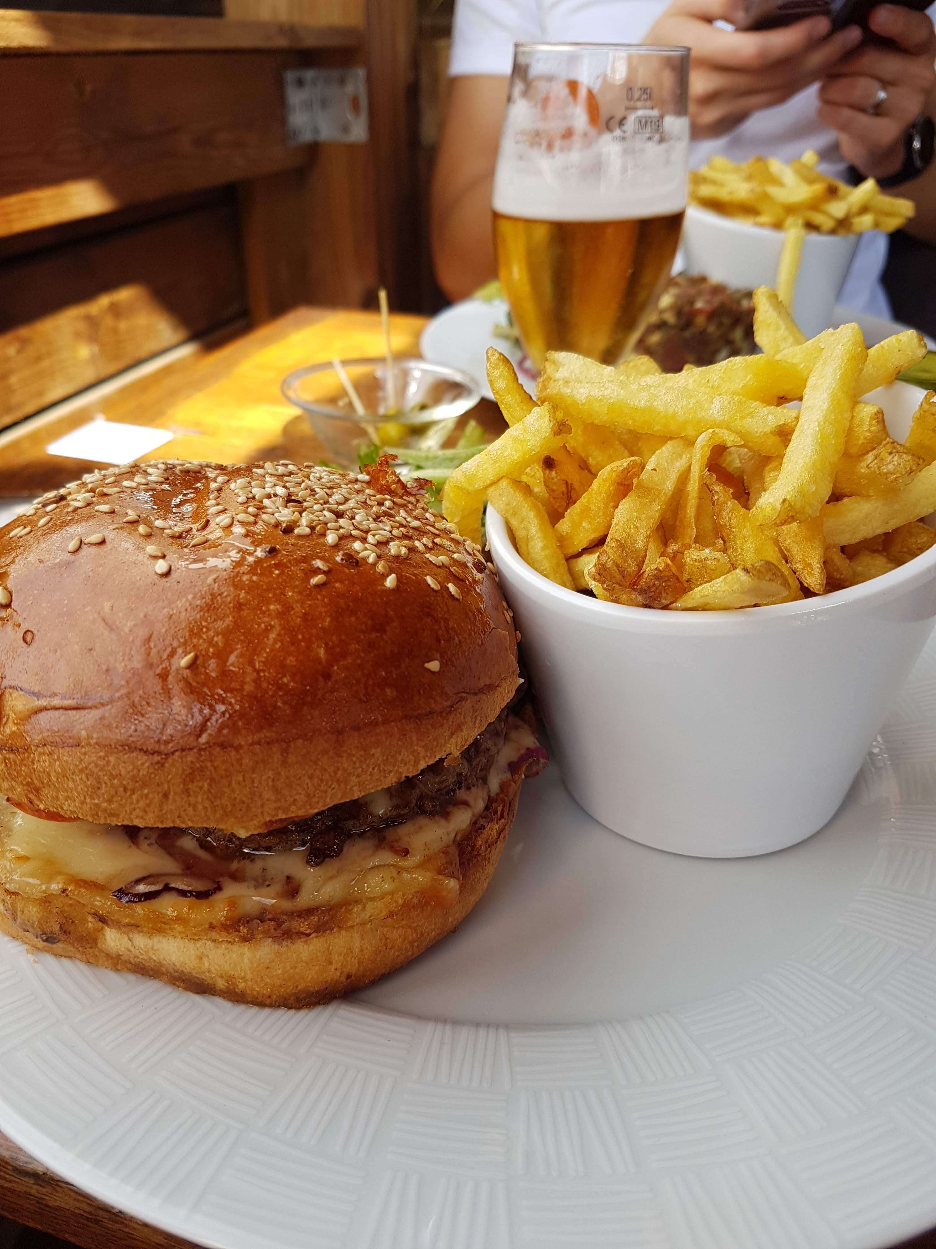 Inutile de demander la cuisson du burger, en l'occurrence saignant, pour amener un steak marron et sec façon Mcdo entre deux énormes pains, mous, bourratifs, et un pauvre reste de tomate et d'oignon... Même les frites sèches n'ont pas rattrapé ce plat à 16€! Le rapport qualité, quantité, prix du tartare de saumon et autres desserts que nous avons pris est très décevant. Bon endroit pour prendre un verre et quelques tapas sans préparations, mais pas plus.