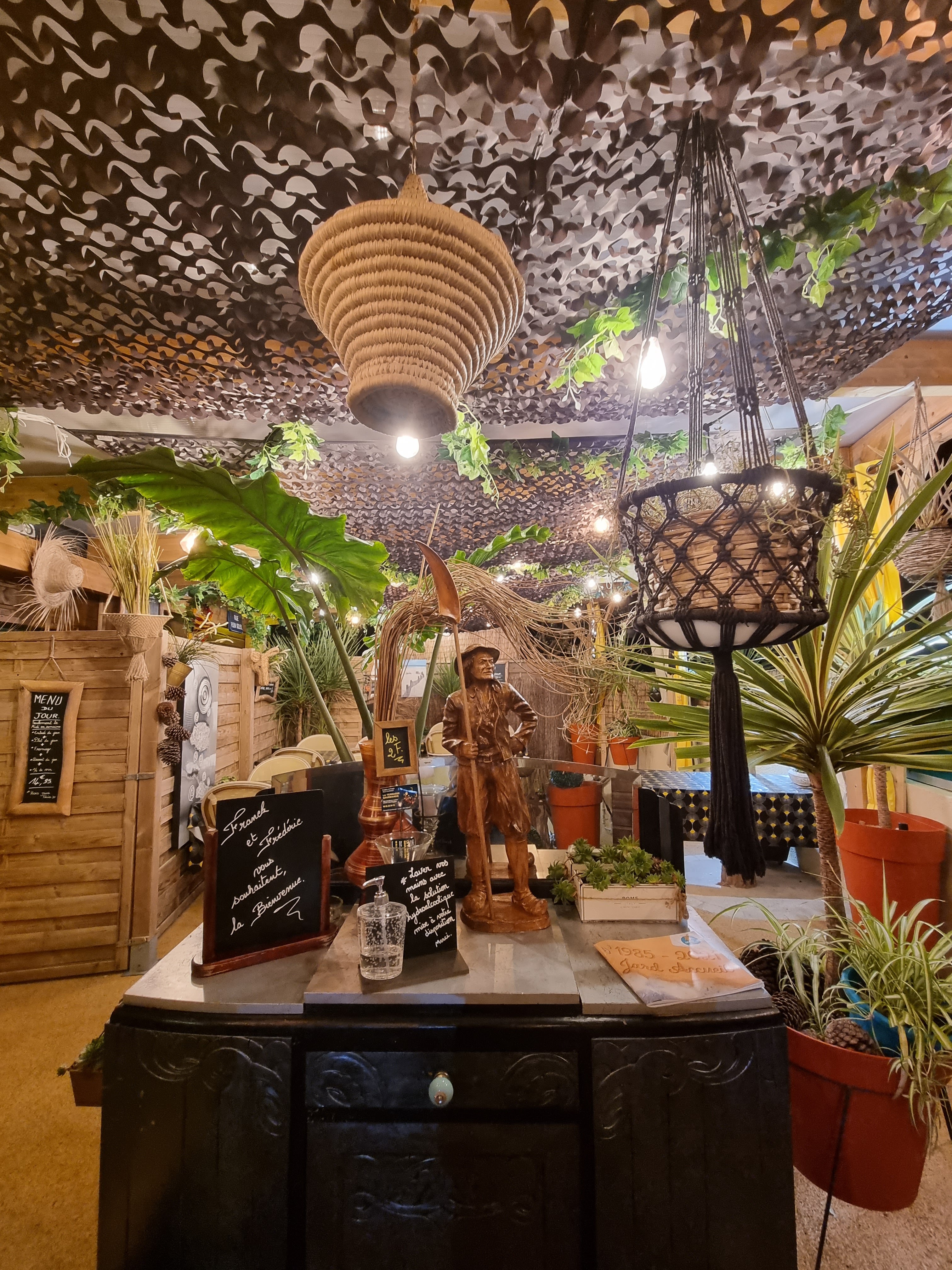 Rien à redire pour la cuisine. Tout est manifestement cuisiné maison comme promis sur la carte, les recettes sont originales et délicieuses, les sauces goûteuses, les assiettes bien présentées et relativement copieuses. Les desserts sont (enfin) différents des sempiternels fondants au chocolat et crème brulées de chez Métro servies du nord au sud de la France. Bravo donc pour la qualité, la variété et l'originalité des recettes proposées. A noter que la carte propose 4 entrées, 4 plats et 4 desserts, ce qui permet à chacun de trouver ce qu'il préfère, et que cette carte est renouvelée régulièrement, ce qui permet de revenir se régaler. La salle est spacieuse, les matériaux (bois, bambous) chaleureux, les chaises confortables, mais surtout l'espace est intelligemment aménagé à l'aide de claustras, pour que chaque table soit dans son petit coin, sans promiscuité gênante. Un autre bon point donc. L'option accumulation / saturation adoptée pour la déco peut plaire à certains pour son côté caverne d'Ali Baba; personnellement, de par ma nature claustrophobe, j'ai eu l'impression de manquer d'air et, mentalement, j'avais envie de faire le vide autour de moi (beaucoup d'objets sont là pour faire masse, mais sont particulièrement laids!) pour retrouver un peu de l'espace d'origine. Ceci étant un ressenti purement personnel. Une petite réserve sur l'accueil des 2F… tonitruant, faussement familier, théâtral, surjoué. Là encore, on peut trouver ça sympathique mais c'est plutôt surprenant et ça devient vite irritant lorsque les mêmes mots, les mêmes phrases sont rejouées à toutes les tables voisines… Dans ce cadre et avec cette qualité de restauration, je verrais mieux la simplicité et le naturel. Avis perso là encore. Ces petites réserves ne doivent surtout pas vous décourager de vous rendre à la Terrasse Gourmande, probablement l'un des meilleurs restos de Jard-sur-mer et peut-être de la région.