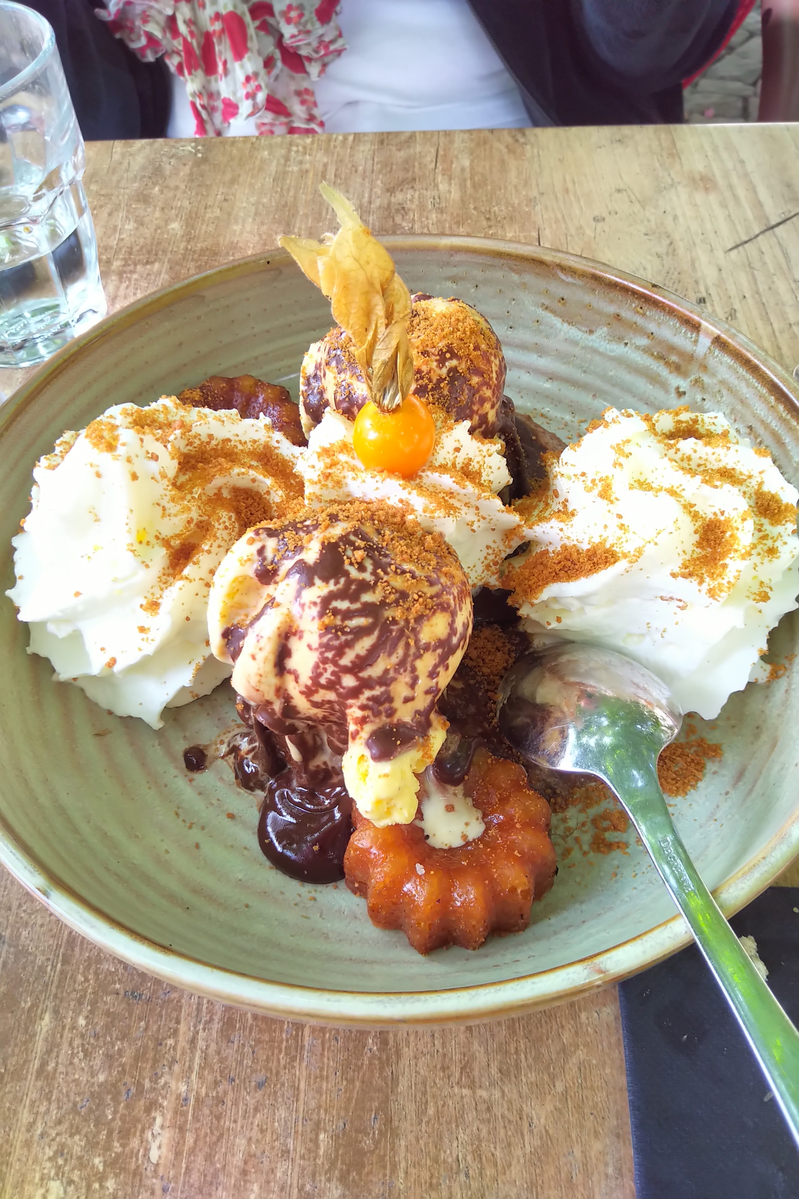 Une terrasse accueillante, un service rapide mais un peu impersonnel. Les assiettes sont fournies bien garnies avec - un burger qui aurait été top si la cuisson avait été respectée ( servi à point alors que demandé saignant ) et des frites un peu trop cuites . - un sans faute pour le poisson du jour bien agréable et son délicieusement crémeux comme annoncé . On a essayé le dessert avec un revisite des cannelés façon profiteroles. C’était une chouette idée . Bon le résultat ne nous a pas autant emporté qu imaginé mais pour le coup ce n’est qu’une question de goût. Encore une fois assiette généreuse . Ainsi globalement un bon moment passé qui pourrait être amélioré avec juste qlq petits ajustements.