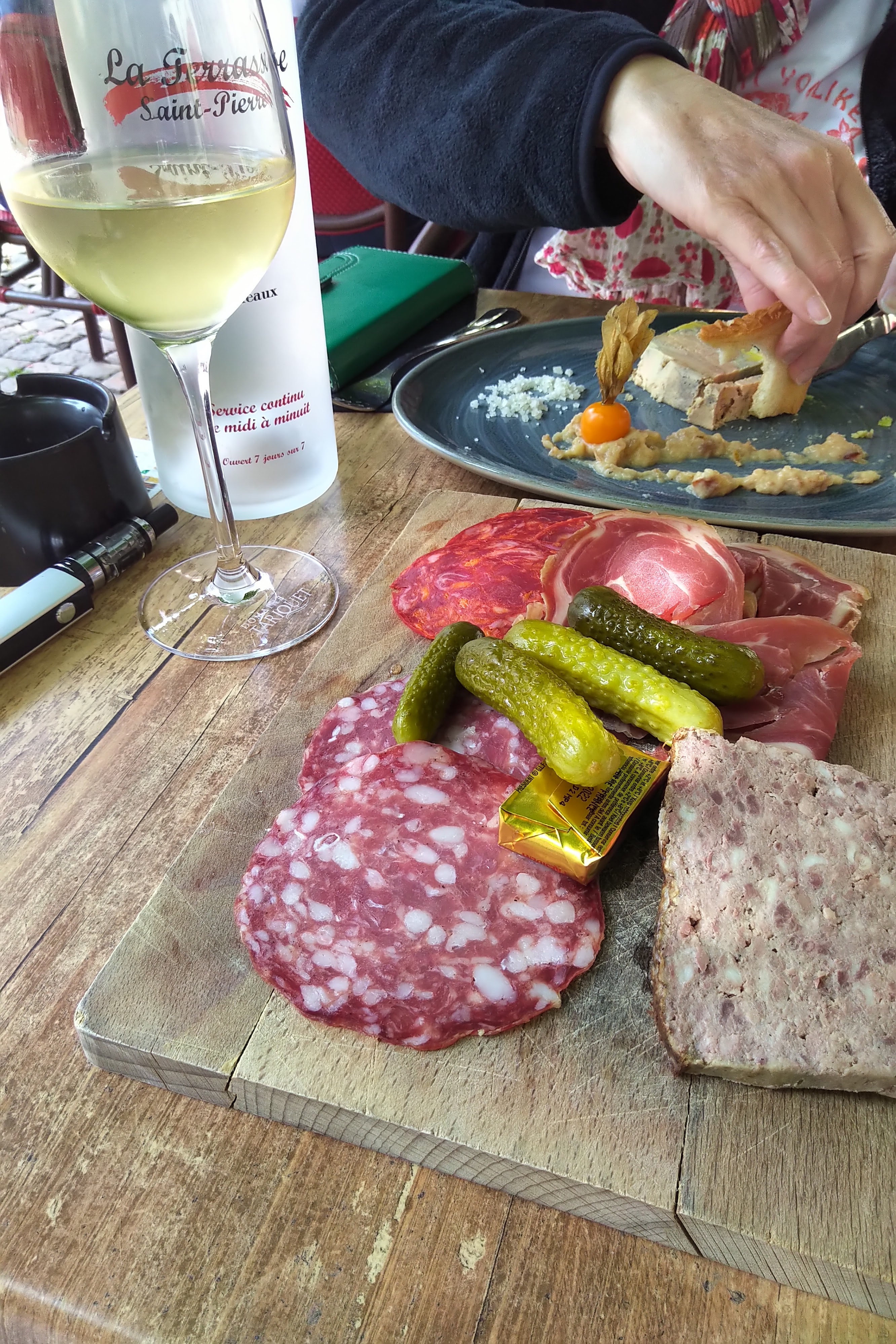Bel endroit posé sur une terrasse sous un grand marronnier, très charmant et vivant. Plancha charcuterie partagée à 2 puis une super entrecôte Angus très tendre. Dommage elle était un peu froide à cœur