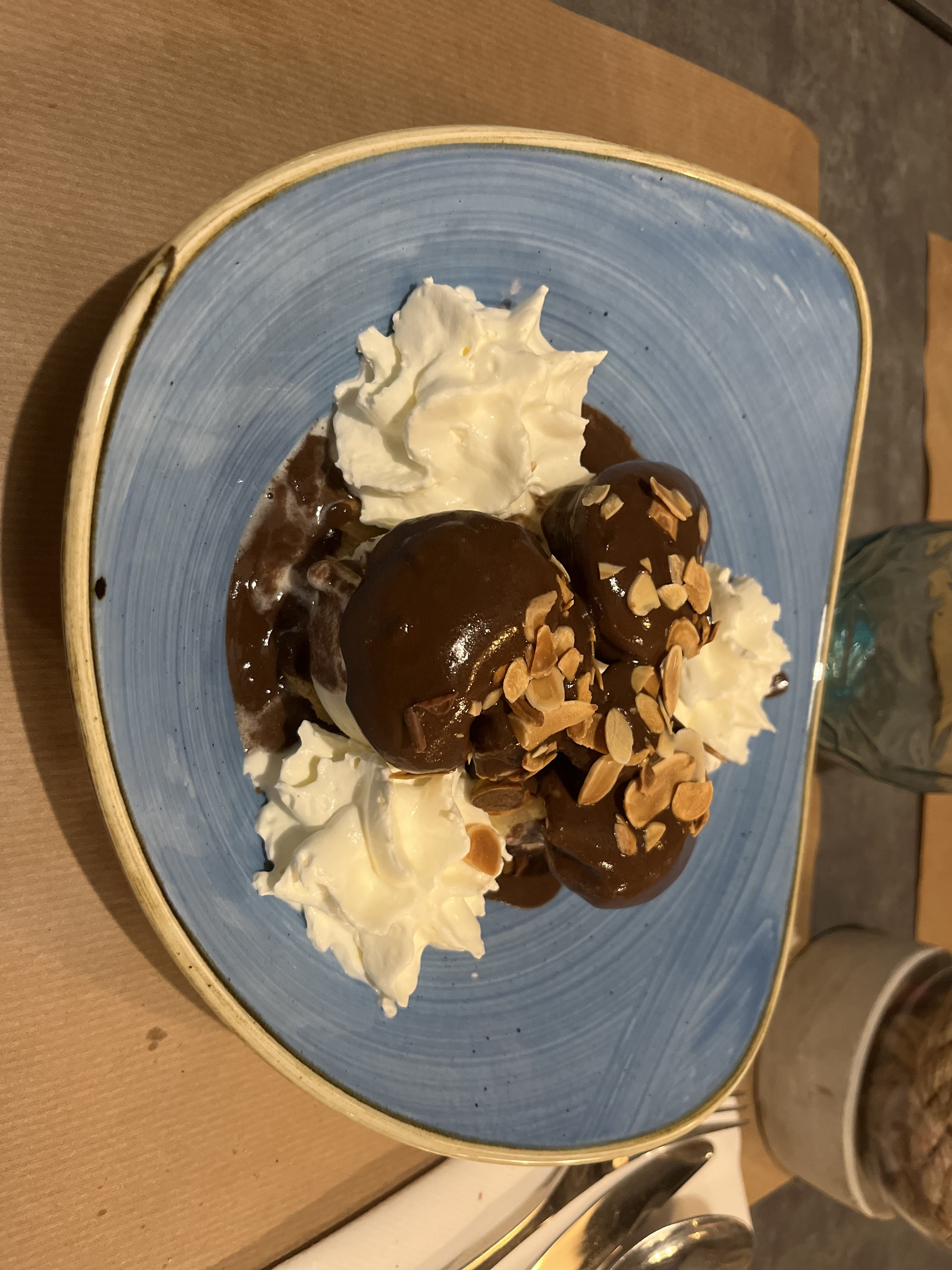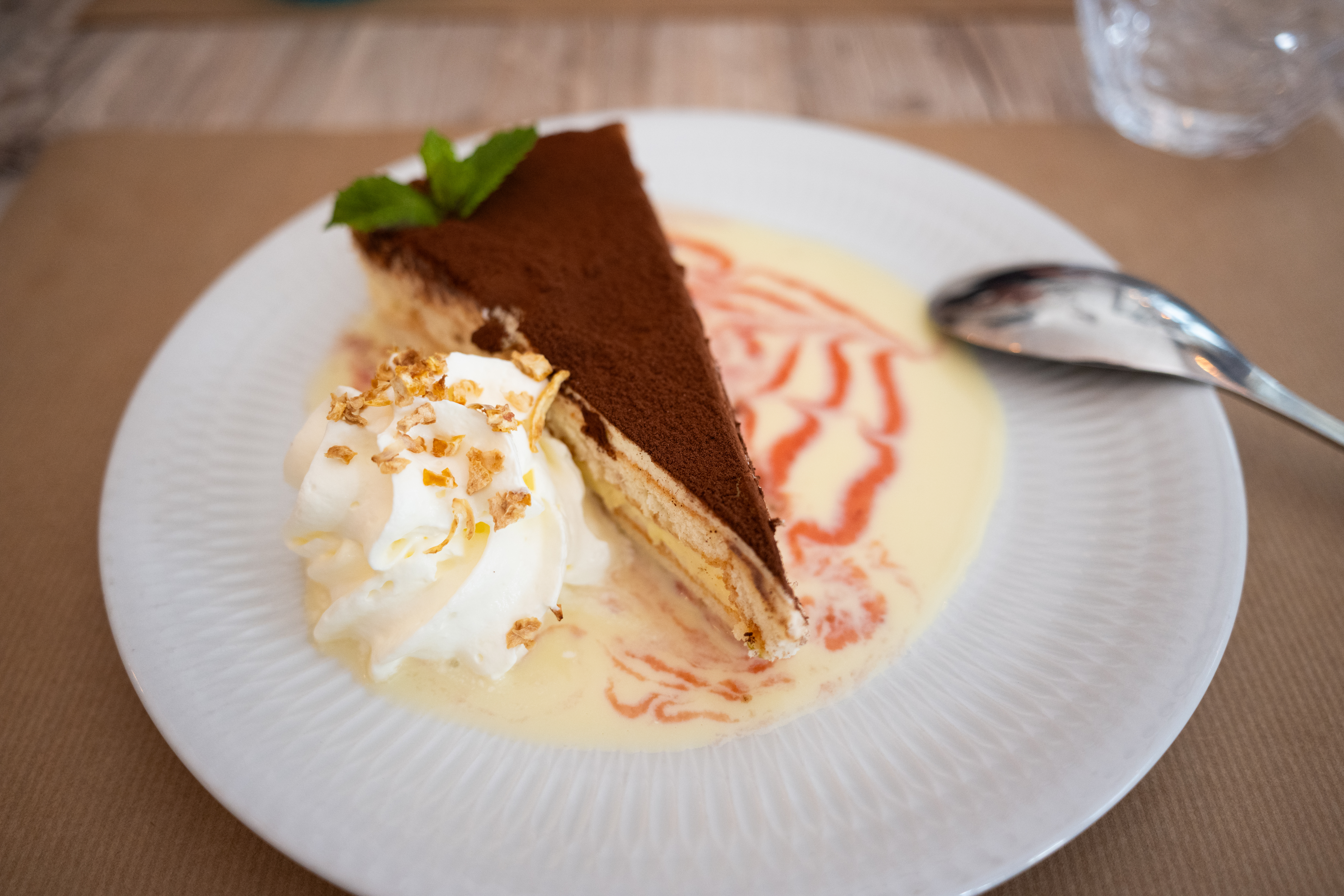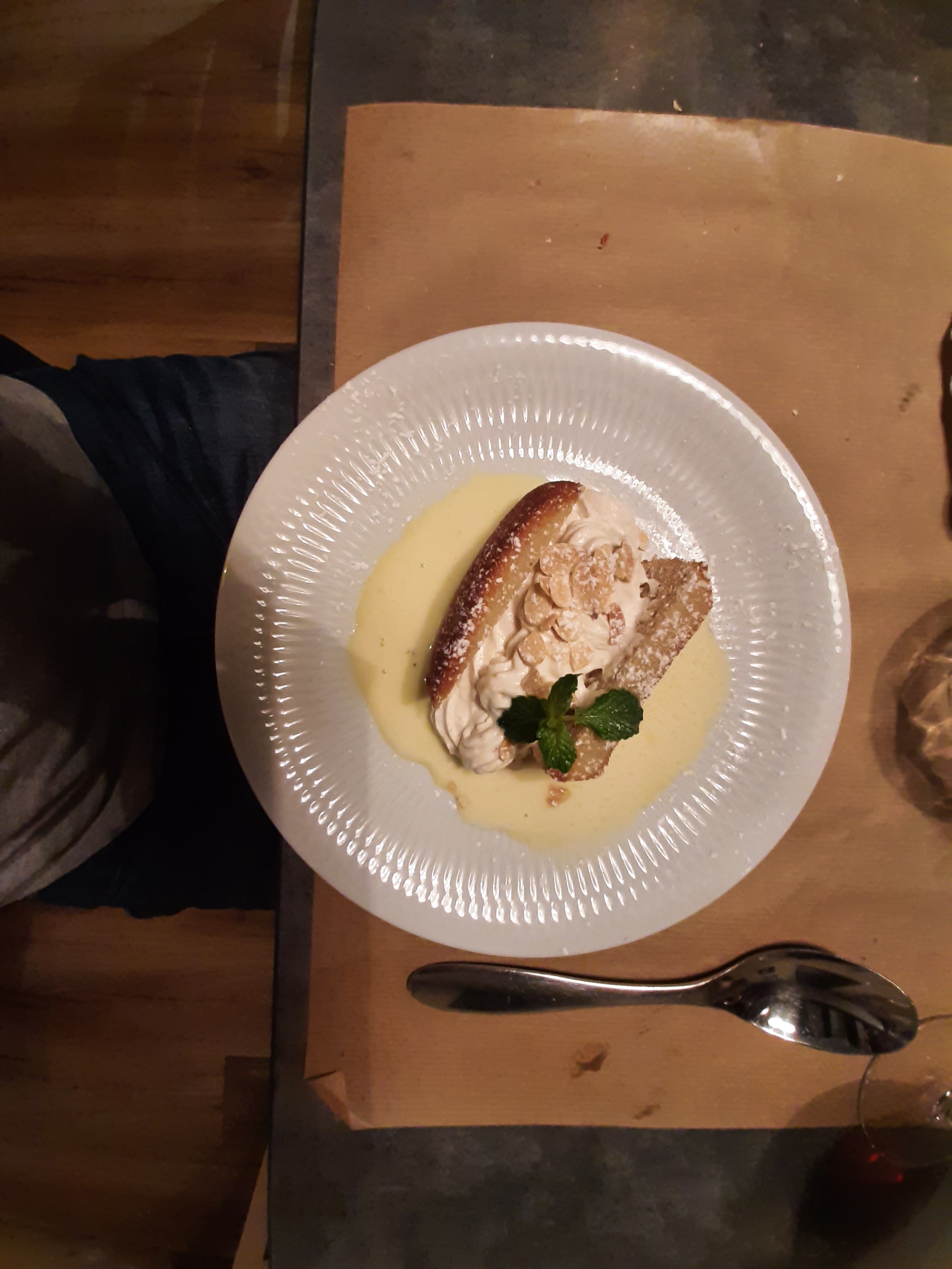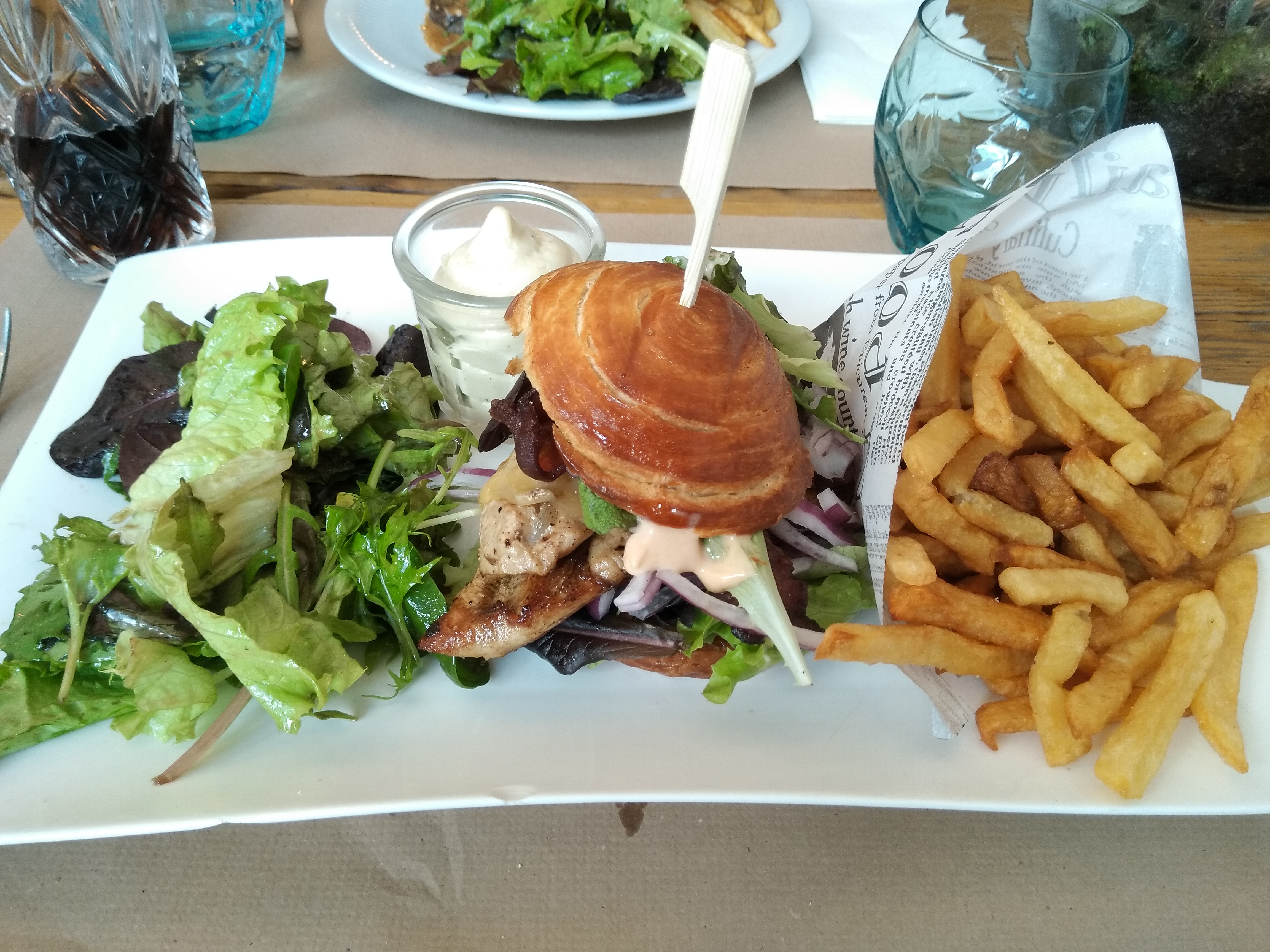 Repas rapide un midi, avec un burger maison (sans frites, désolé j’aime pas ça :) et un dessert. Le burger était vraiment bon, viande bien cuite et épaisse, mayonnaise en plus et à part et un Bun en pain feuilleté croustillant. Une vraie réussite. J’ai été un peu moins séduit par le Tiramisu qui est servi en part de gâteau, l’inconvénient de cette forme c’est qu’il y a moins de crème Mascarpone et que, de fait, c’est un peu sec. Alors oui il y a de la chantilly et de la crème anglaise mais ça devrait pas être utile avec un Tiramisu. Endroit sympa et service souriant. C’était une belle étape. 2 burgers, 1 Dessert, 1 café, une carafe d’eau 50€