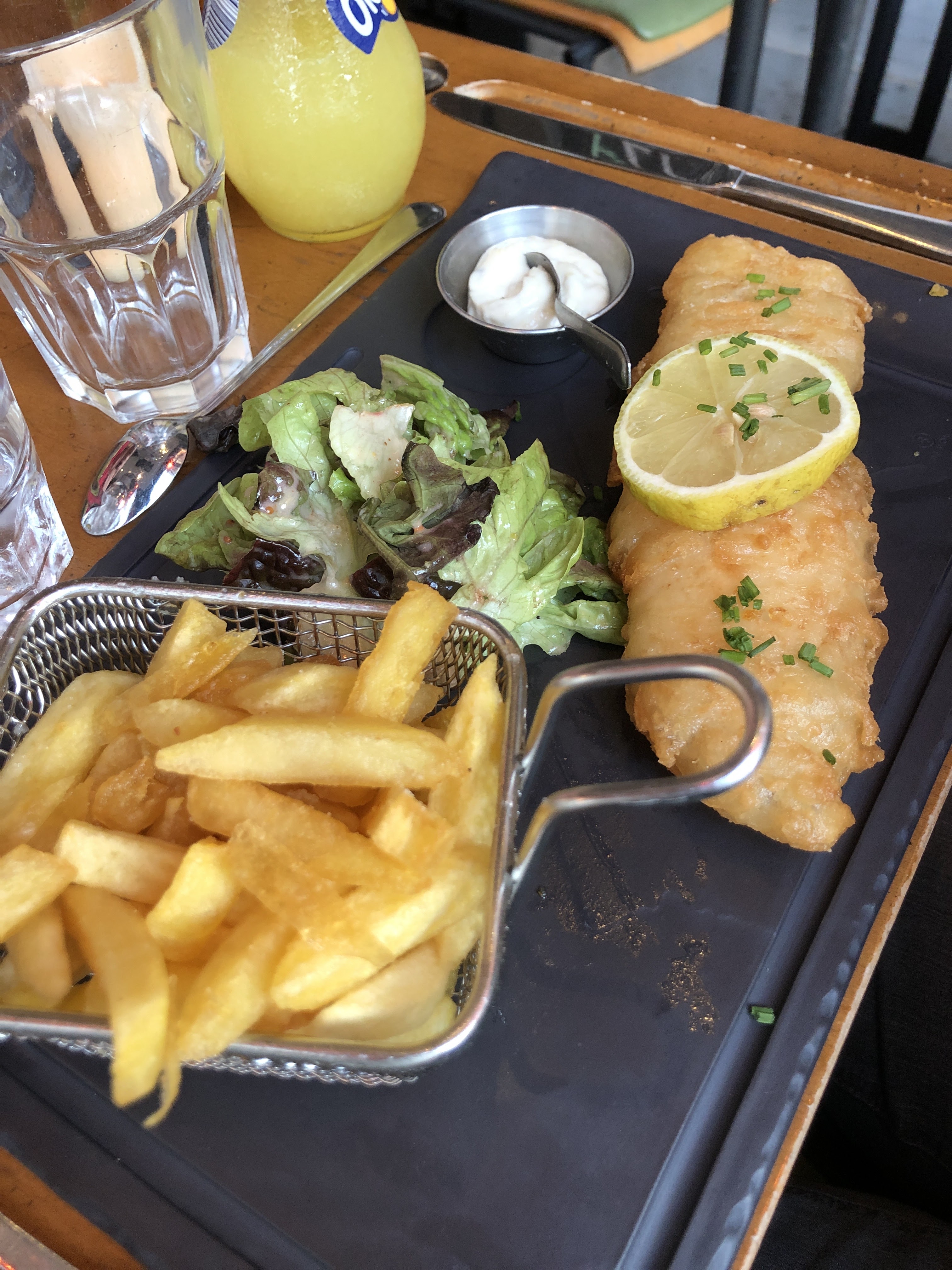 Restaurant sympathique avec une bonne ambiance et une décoration originale. Les serveurs sont aimables et mémorisent chaque commande. Nous avons pris le fish and chips et l’andouillette frites salade et n’avons pas été déçus ! Il y a ce qu’il faut dans l’assiette, mais pas trop, ce qui permet de prendre un dessert. Les desserts nous sont présentés sur un plateau pour qu’on puisse se décider, et il y a du choix.