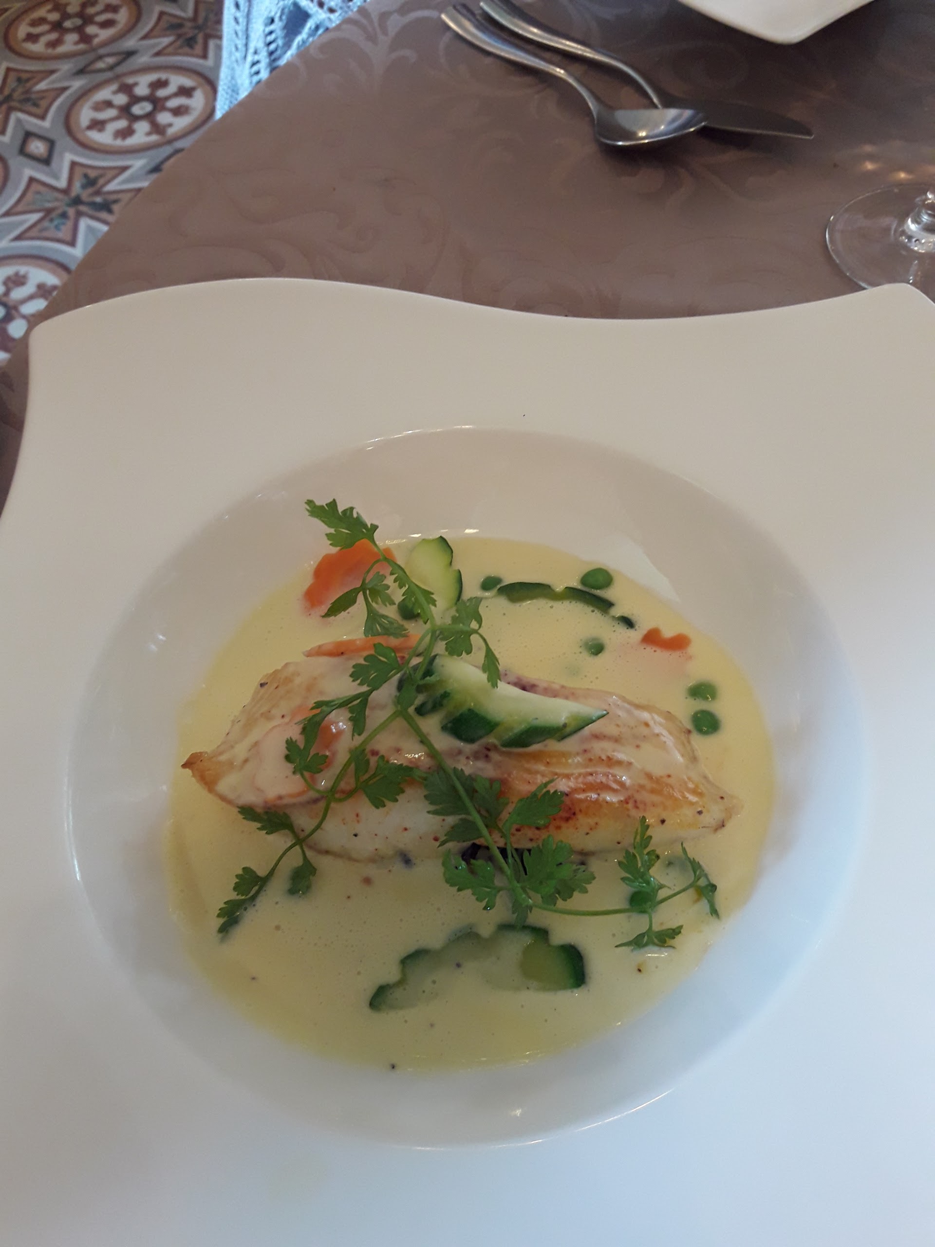 Repas excellent, service discret salle agréable tables distantes les unes des autres. Très bien.