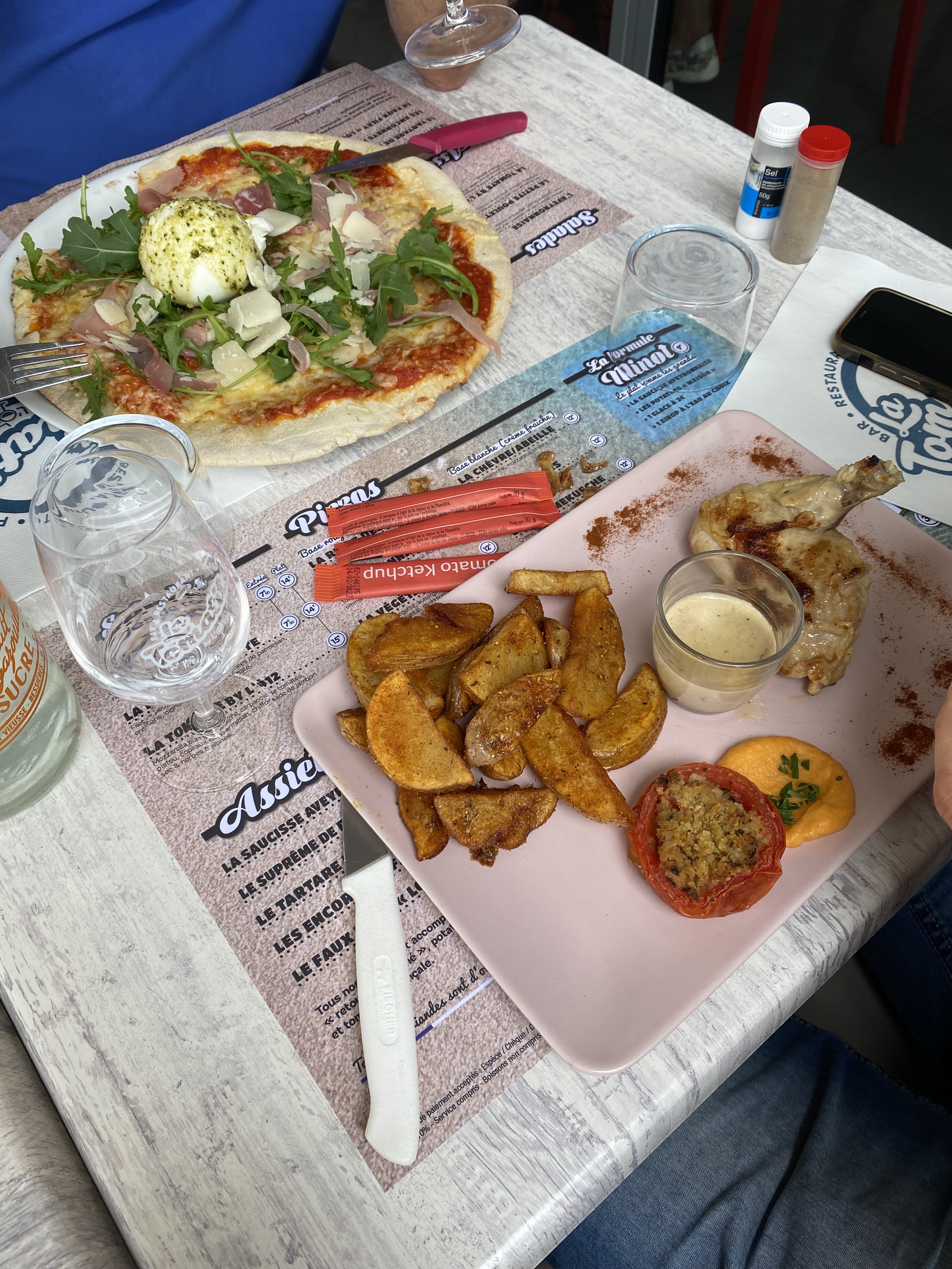 Service et accueil parfait , réactif et prévenant. Franchement rien à redire.. concernant le repas les pizzas sont délicieuses, salades gourmandes fraîche et de bonne qualité. Bref nous avons été vraiment agréablement surpris tellement c bon . Merci ne changez rien