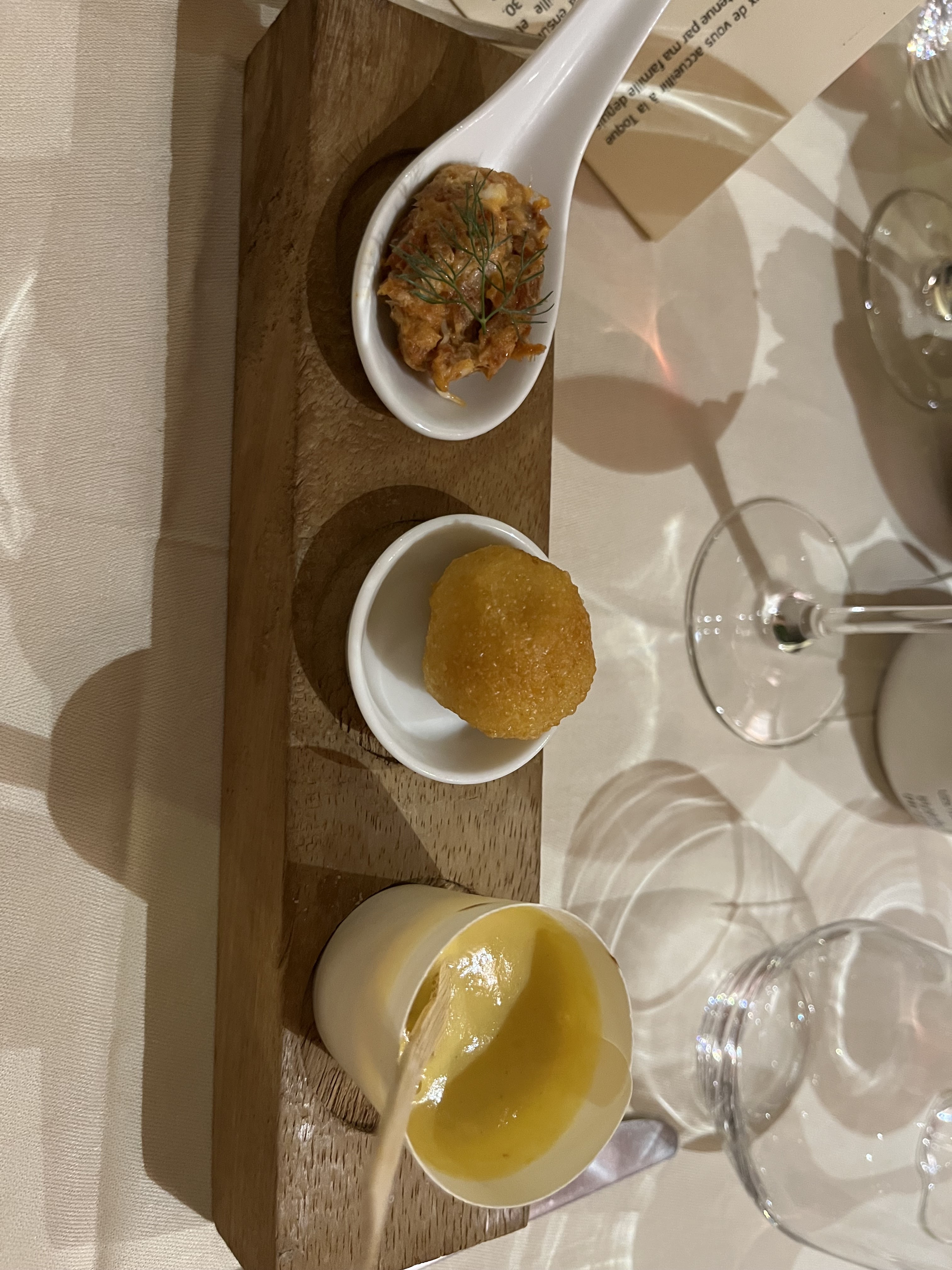 Entre amis, un délicieux déjeuner concocté par le Chef, menu confiance, tout est dans l’intitulé ! Expérience unique et rare. Félicitations