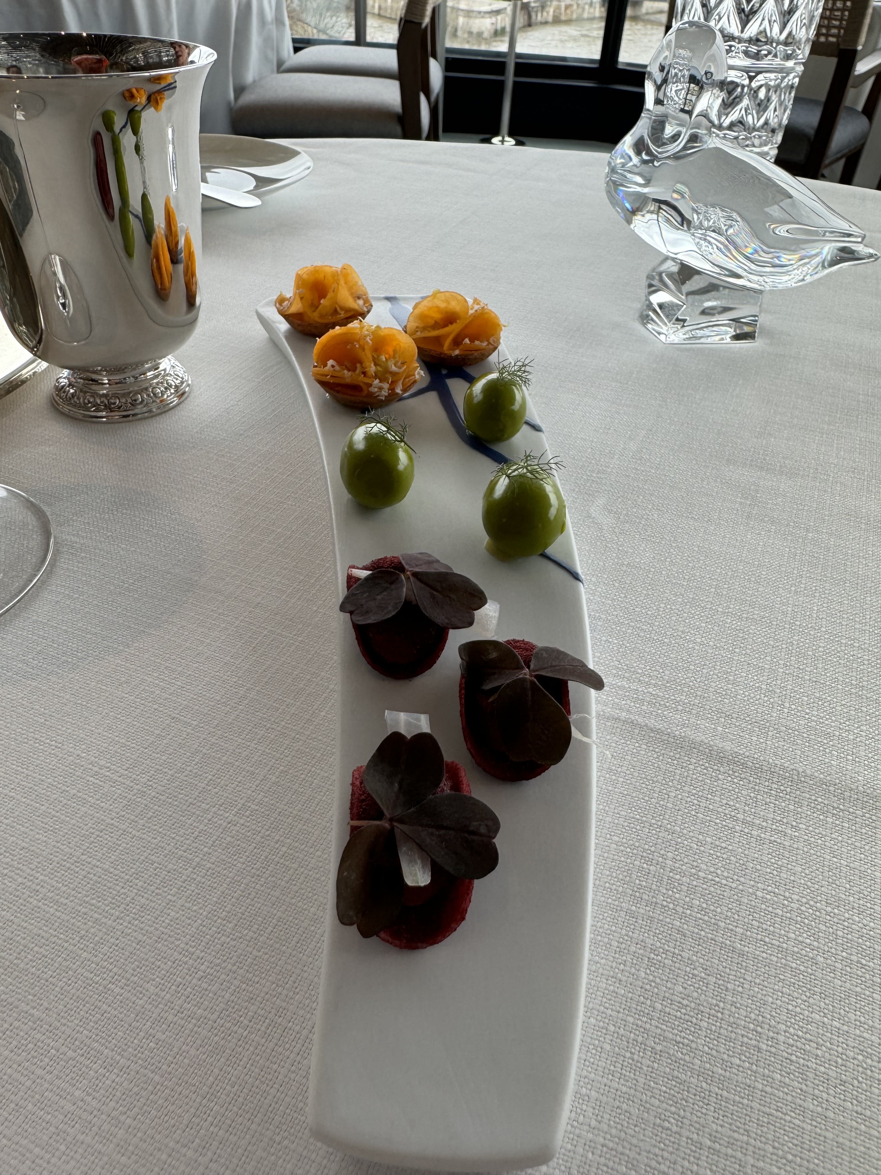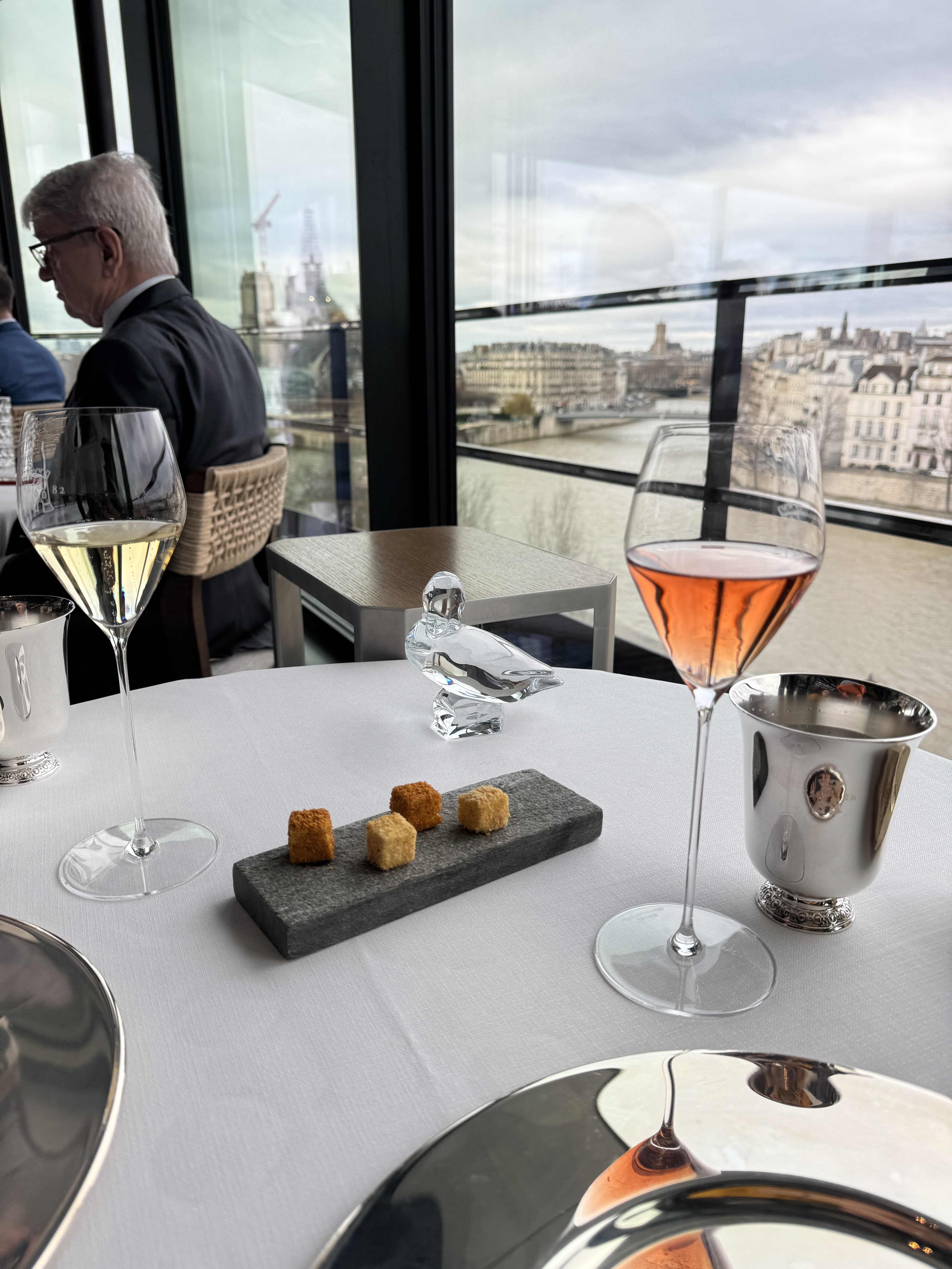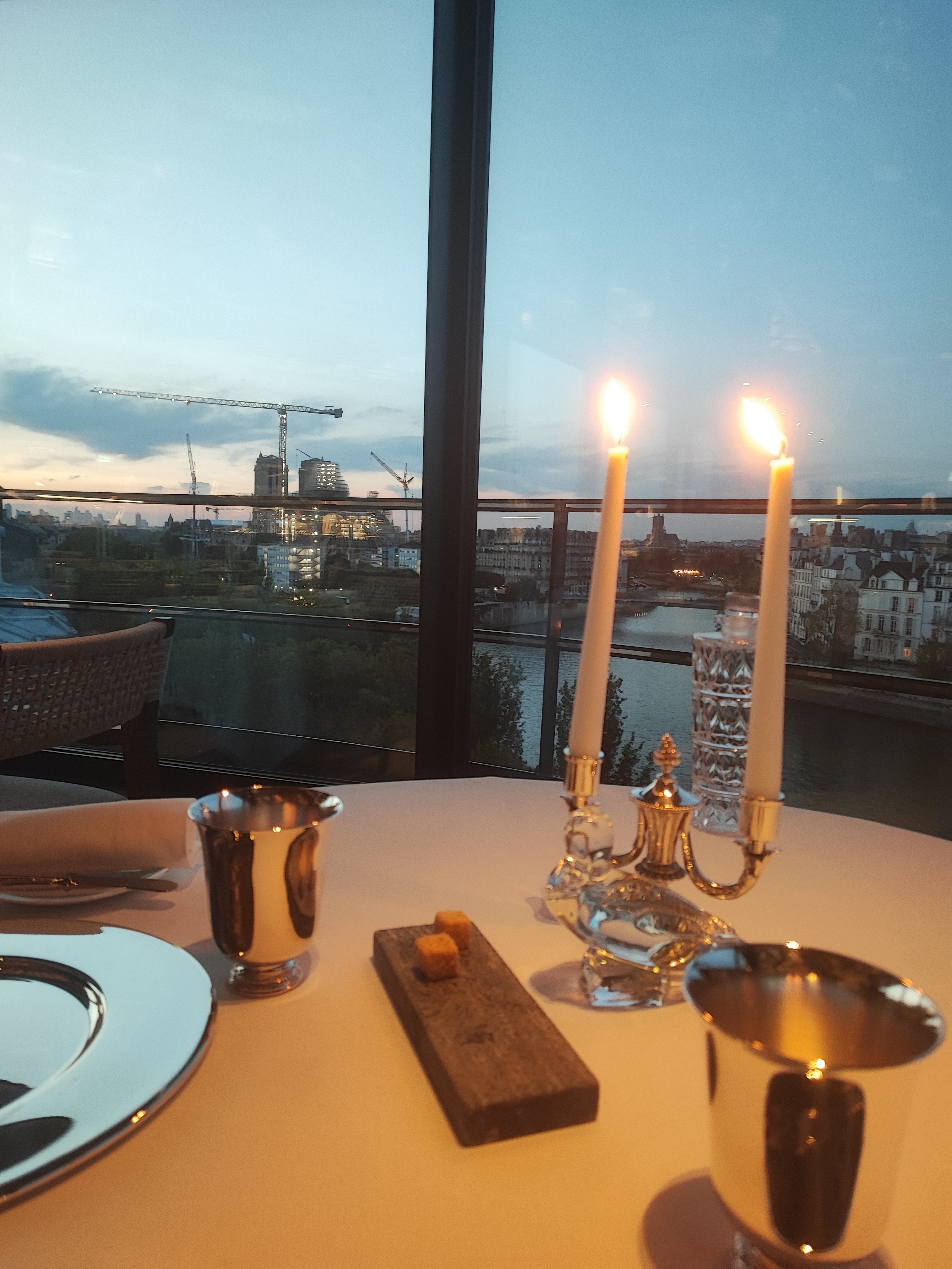 Alors oui, le cadre est super , on est ravis de l'expérience dans cette institution et la vue est sublime. Maintenant, s'il faut juger par rapport à la gamme de prix dans laquelle l'établissement se situe: - le prix de 440 euros par personne pour le grand menu Renommées étonne un peu: si le foie gras et le caneton sont excellents, on a l'impression qu'il manque quand même quelque chose. Pour comparer aux autres menus de cette gamme de prix à Paris, un peu plus de créativité, davantage d'efforts sur les détails (par exemple sur le beurre ou les pains) et un plat de plus peut-être ne seraient pas de trop - excellent service d'accueil, en revanche côté salle malgré une armée de personnes c'est un peu moins efficace, et on se retrouve à patienter et relancer sur des requêtes simples
