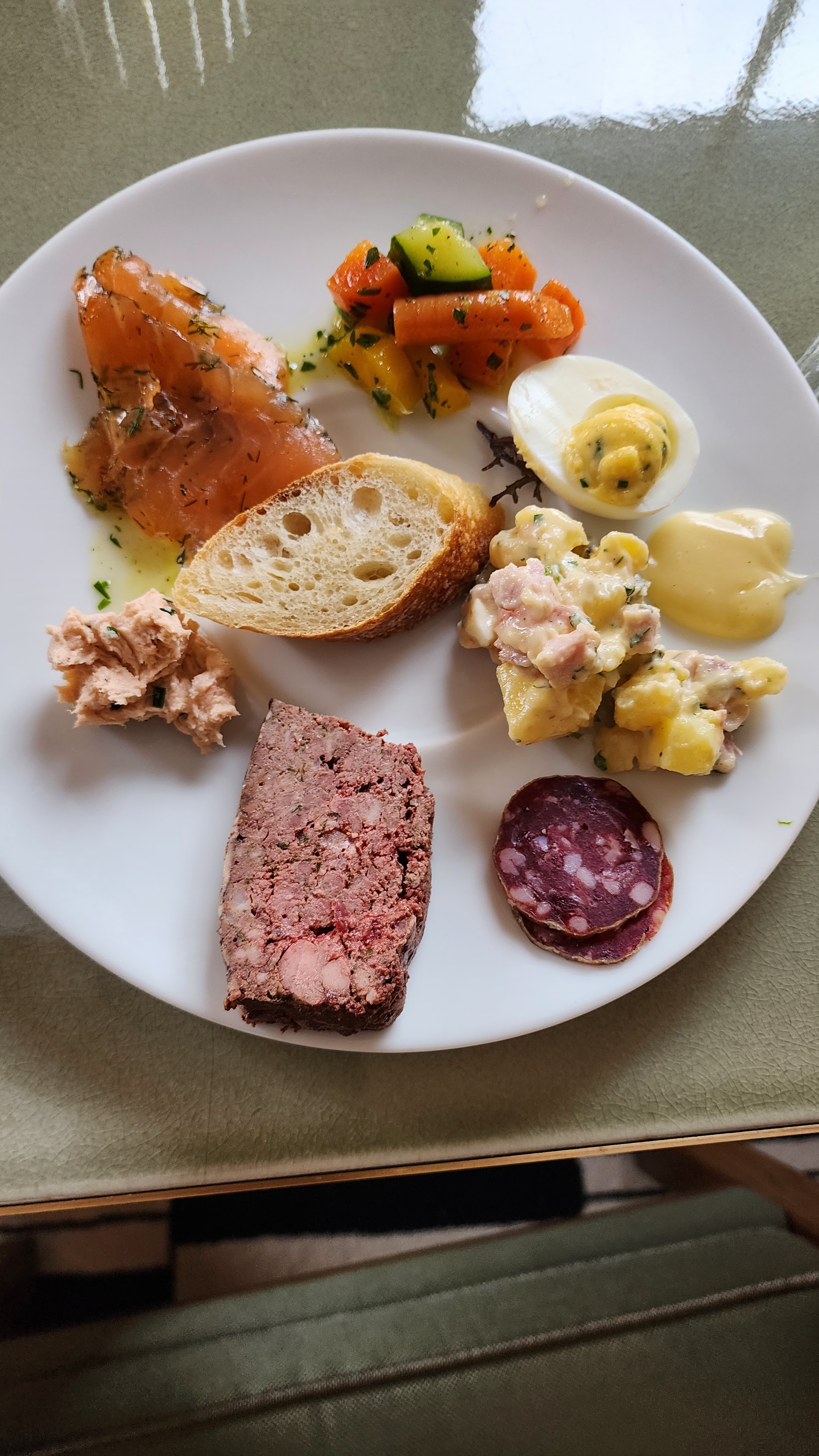 Nous avons découvert le brunch avec ma femme. Nous pensions manger dans le restaurant avec vu sur la seine , mais cela se passe dans une autre salle au RDC (petite, mais confortable, ambiance cosy type boudoir mais sans vue, enfin sur les voitures des quais) Le buffet est composé d'œufs mayonnaise, de différentes salades (taboulé, piémontaise, légumes...) , terrine et pain , charcuterie (jambon de Bayonne, saucisson) tarama et rillettes de saumon et un plateau avec des tranches de saumon et esturgeon fumées. Il y a également des tranches de fromages et des pâtisseries (mini religieuse, far Breton...) et mousse au chocolat ainsi que des viennoiseries. En choix de plat chaud: un œuf Bénédicte ou agneau/haricots verts. L'ensemble est très bon , frais et fait maison pour les préparations, mais honnêtement au tarif de 65€ on commence normalement à taper dans le haut de gamme des brunch en terme de choix et de types de mets et la on en est vraiment loin! Maintenant, il a ouvert cette année, espérons donc qu'il va s'améliorer.