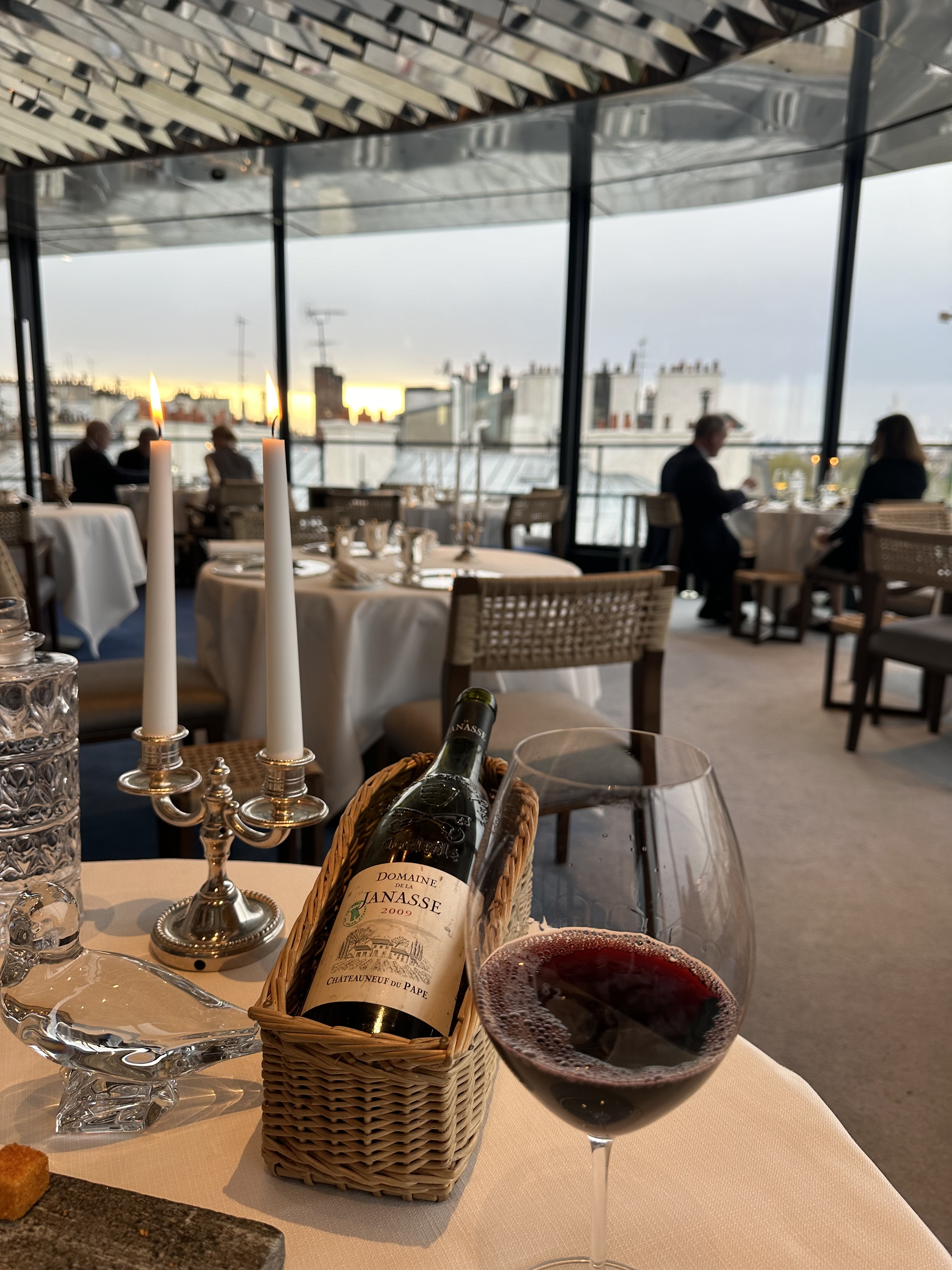 Très belle salle avec baie vitrée et vue sur Paris. Plats raffinés. 150 € le déjeuner Saint Jacques, saint Pierre, caneton Mazarine très fondant, clémentine corse.