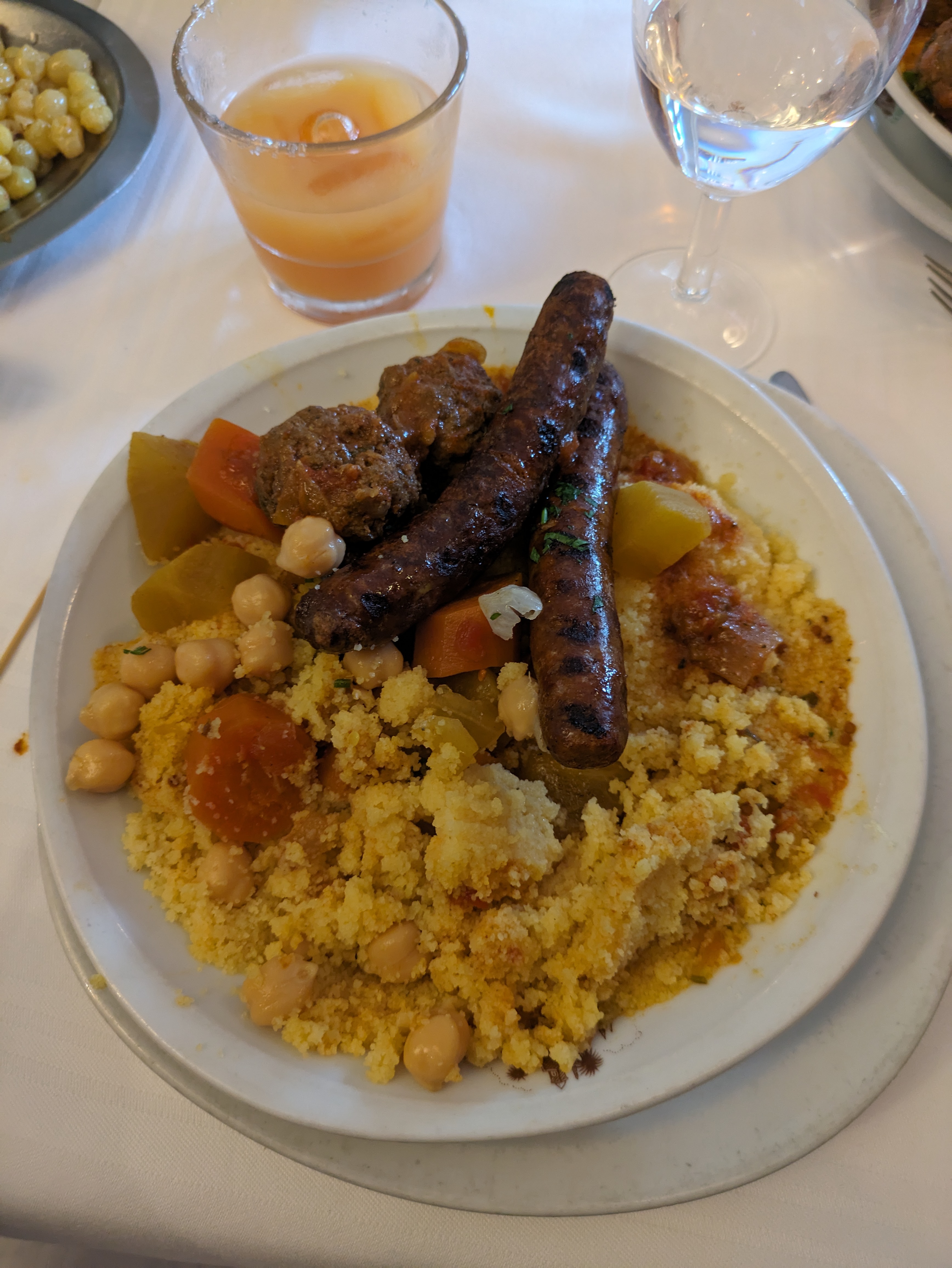 Couscous de grande qualité ,merguez ,boulettes , la boulette est un poil sèche , pour ma part ,semoule fine et très goutue , légumes bien cuits dans le bouillon ,personnel très correct et accueillant .