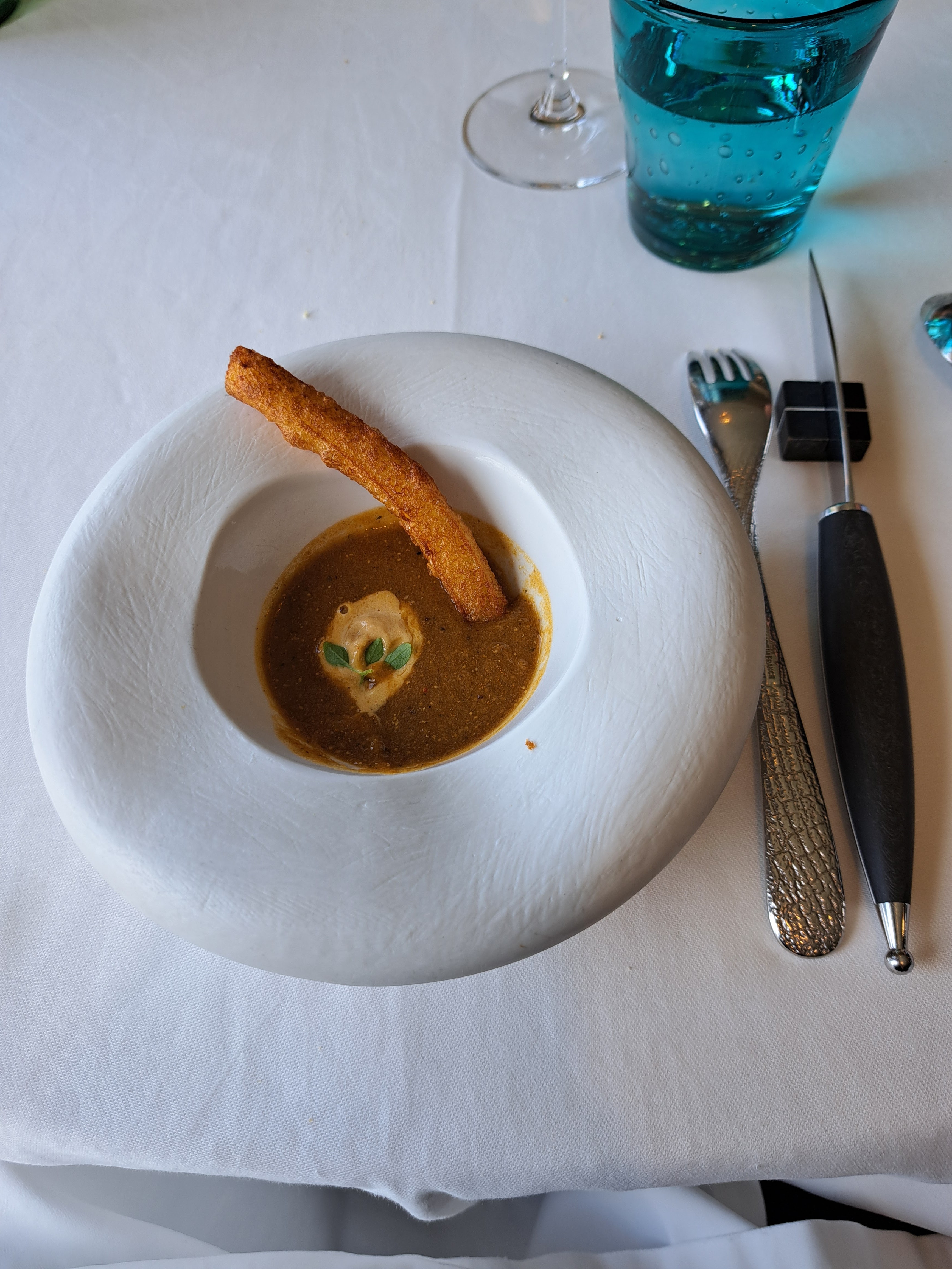 Je m'attendais au truc en plus, au whaou, au peps. Bon, il aura fallu attendre le dessert pour ça. Je déconseille les langoustines en entrée, un peu trop réfrigérées et la soupe de tomates. Mon mari n'a pas bien digéré le foie gras... Le veau était bon. Le dessert autour de la fraise était extra. Mais pour un restaurant étoilé, je suis restée sur ma faim d'extraordinaire. Un cadre magnifique, une vue incomparable. Un service irréprochable.