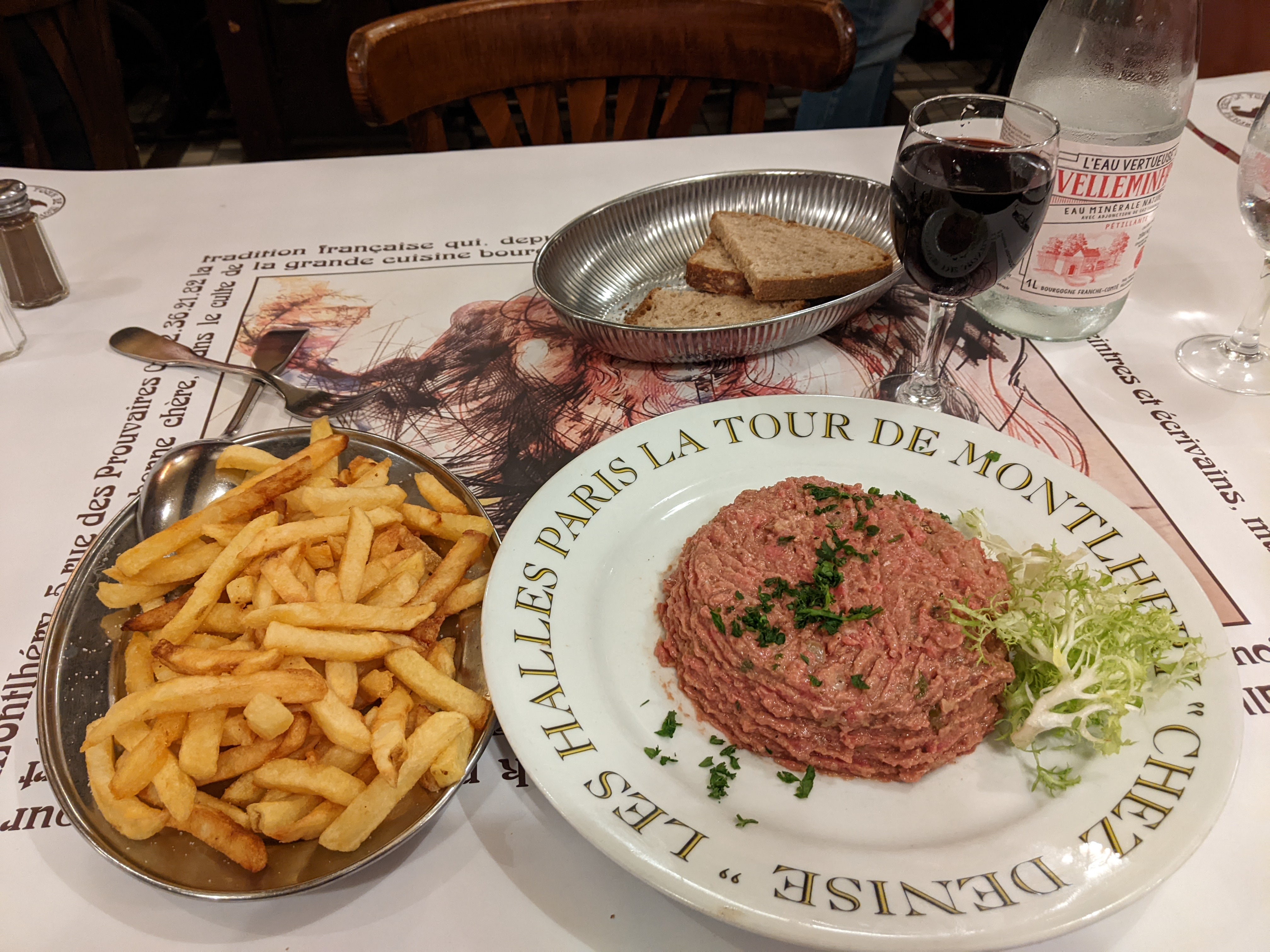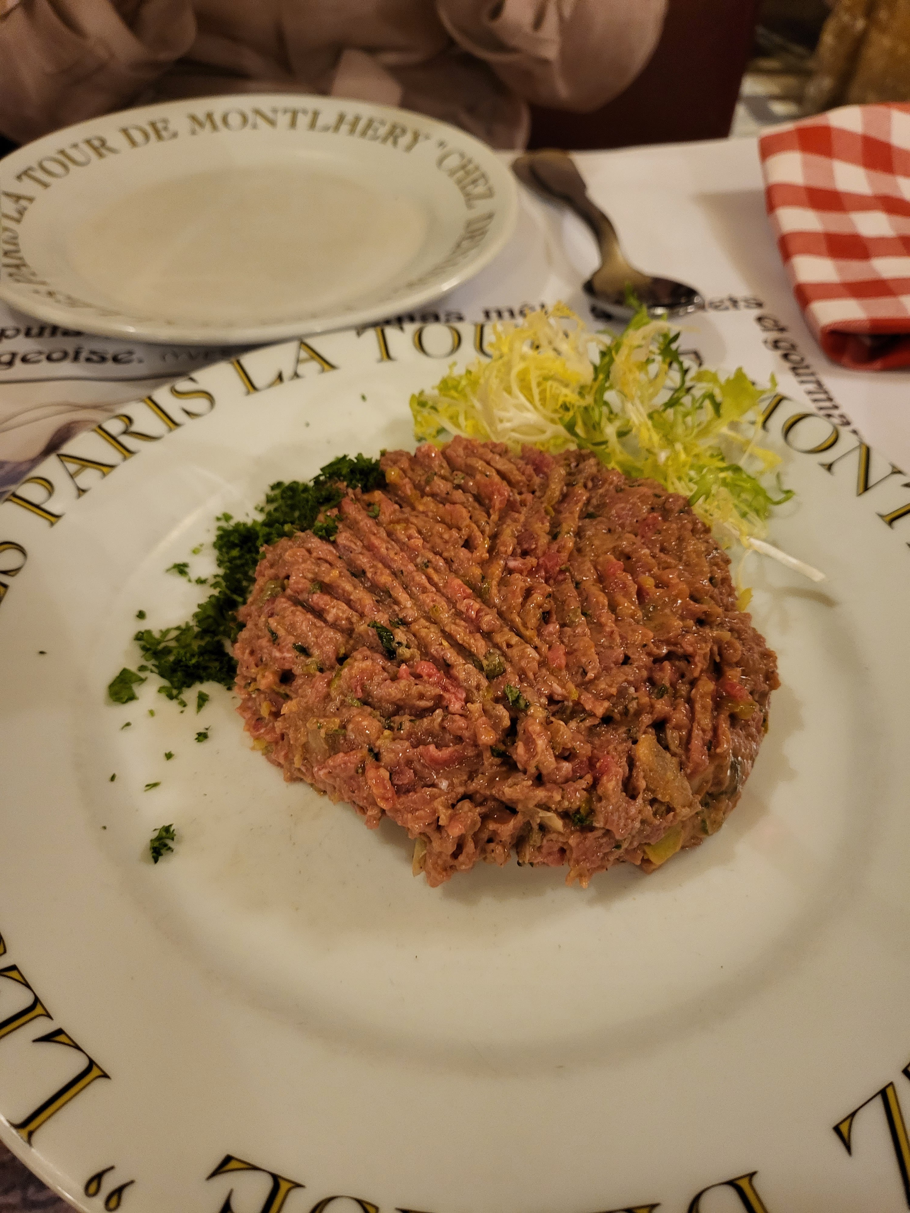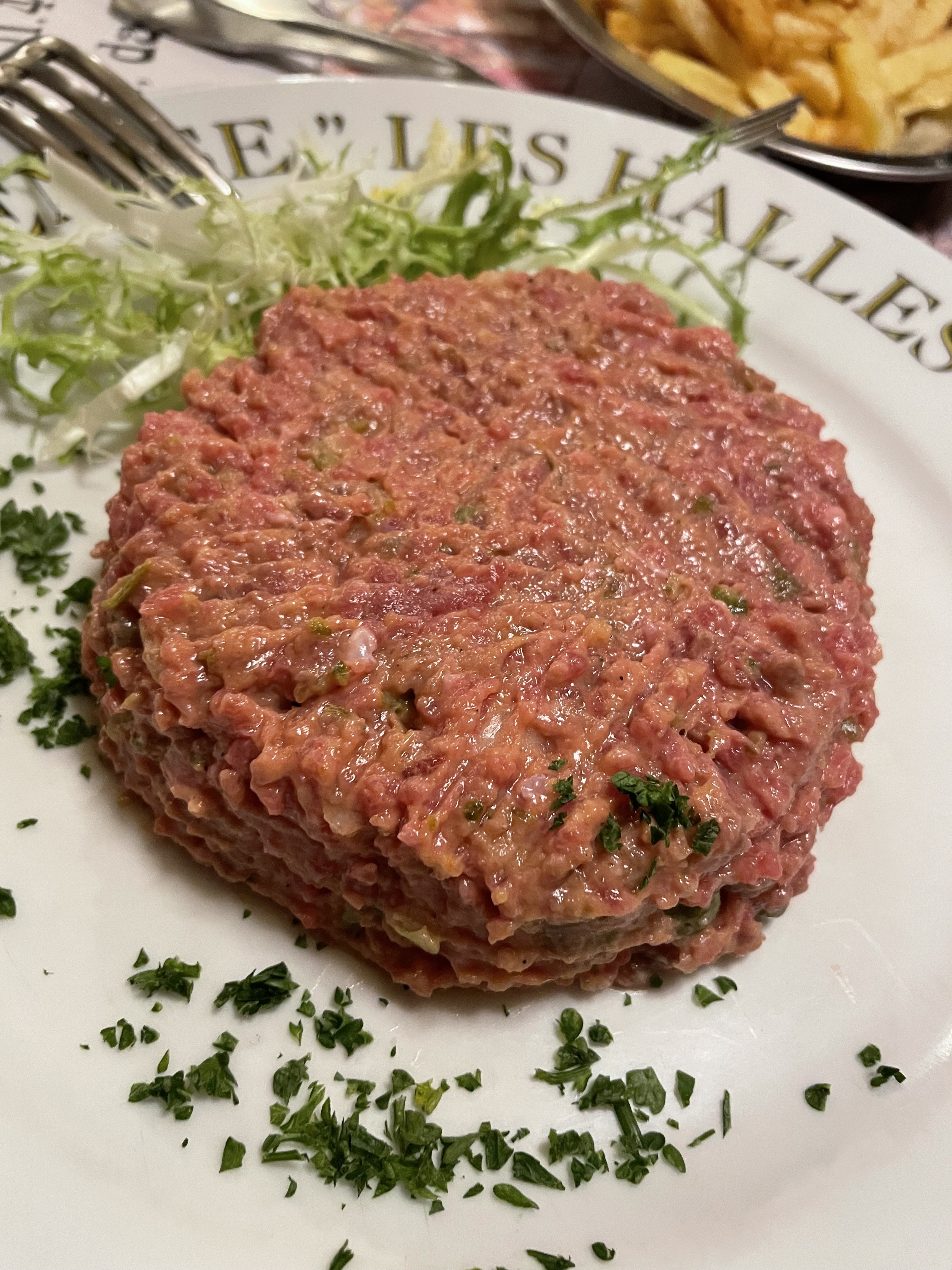 Nous avons mangé ici il y a quelque temps en 2018 mais nous parlons encore de ce restaurant. C'était une super ambiance. Tables coude à coude et vous avez interagi avec vos compagnons de table. Ce fût un agréable moment. Mon fiancé a commandé un steak tartare. Je ne mange pas de viande donc c'était tout pour lui. Nous n'avions aucune idée de la taille d'une portion, mais il a terminé toute l'énorme assiette. Il aimait chaque bouchée. Cependant, au milieu de la nuit, il ne pouvait s'empêcher de transpirer abondamment par tous ses pores. Le lit était trempé. Il avait littéralement des sueurs de viande ! Même s'il ne regrettait pas d'avoir mangé le steak tartare, il n'aurait probablement pas dû manger toute l'assiette. Haha !