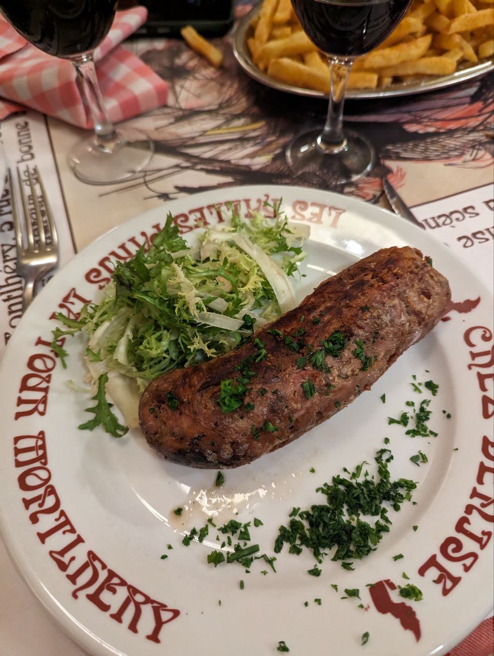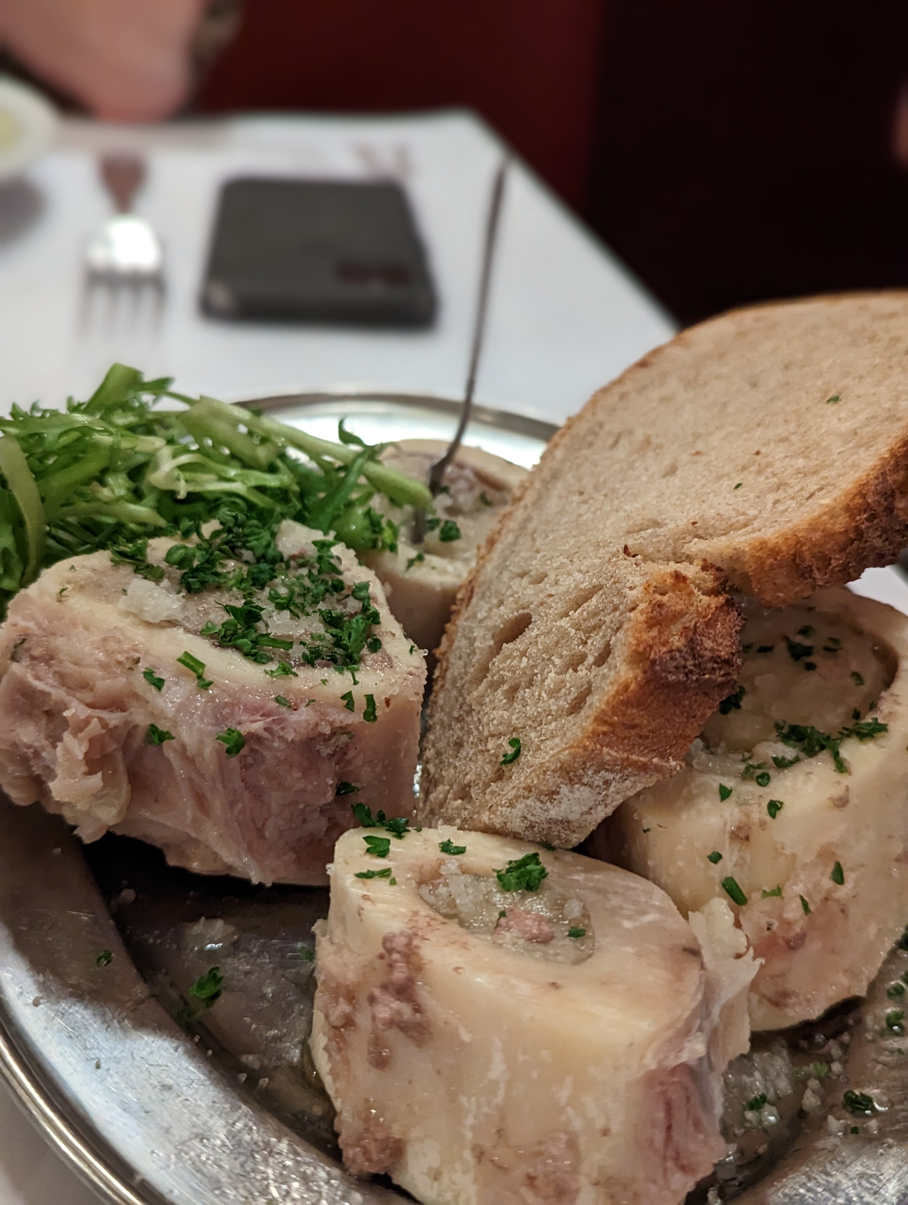 La réputation parle d'elle-même mais nous sommes très satisfaits du service et de la patience que le personnel offre au touriste. J'ai appris un peu de culture française et vécu un repas fantastique que je n'oublierai pas. Mon steak était parfaitement cuit et la moelle osseuse est quelque chose dont je vais rêver et qui me manquera ! Oh et et les frites, c'est trop bon !