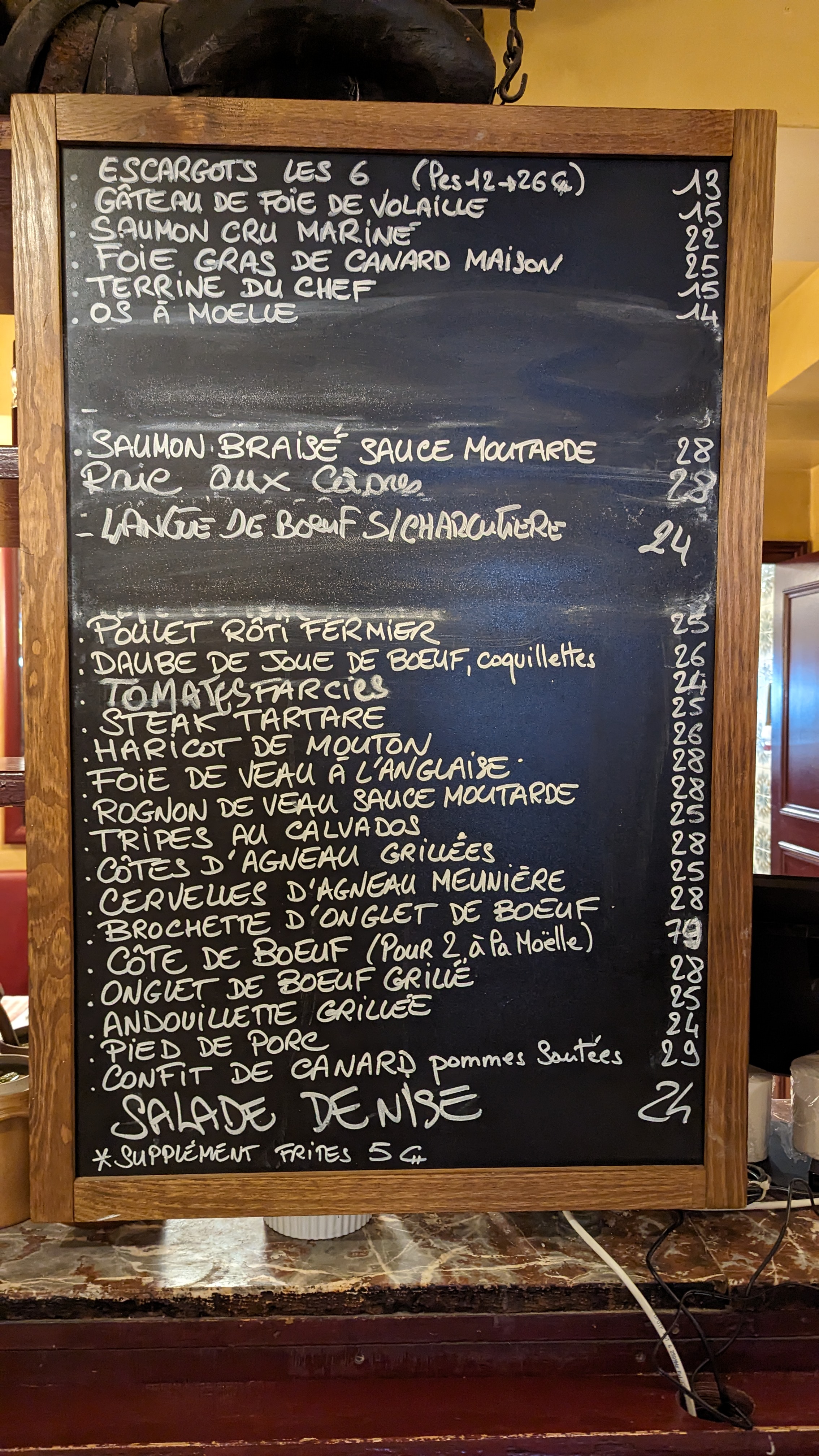 Très décevant. Je ne parle pas français. Les listes inscrites au tableau étaient difficiles à déchiffrer. J'ai dit au serveur que je voulais un steak, et il m'a juste dit « steak suspendu ». Cela ne me semblait pas être la meilleure option, mais comme le serveur ne semblait pas d'humeur à en discuter, j'ai dit ok. Mauvais choix. Il est arrivé sec et résistant. Après toutes les bonnes choses que j'avais lues sur ce restaurant, c'était très décevant.