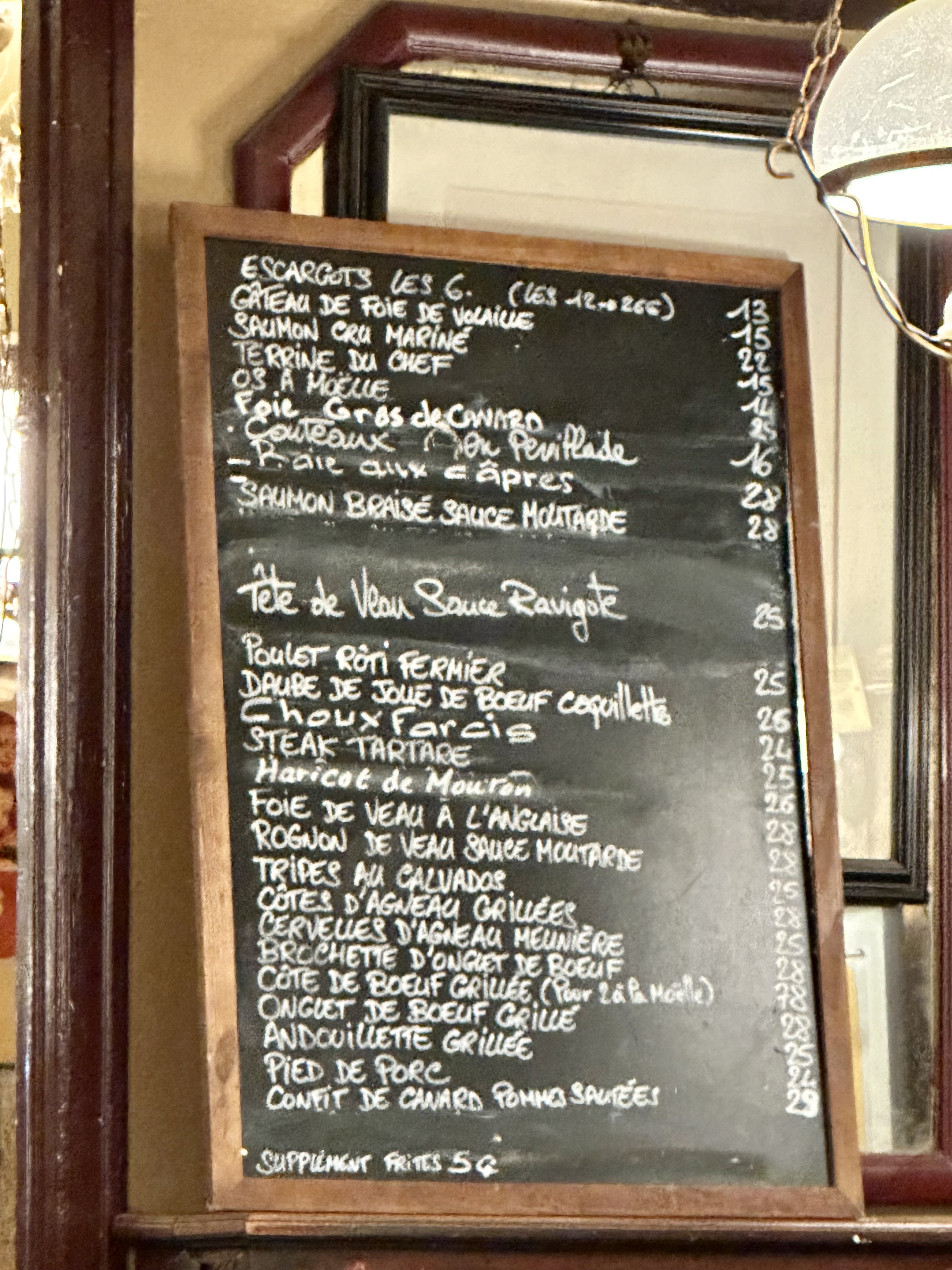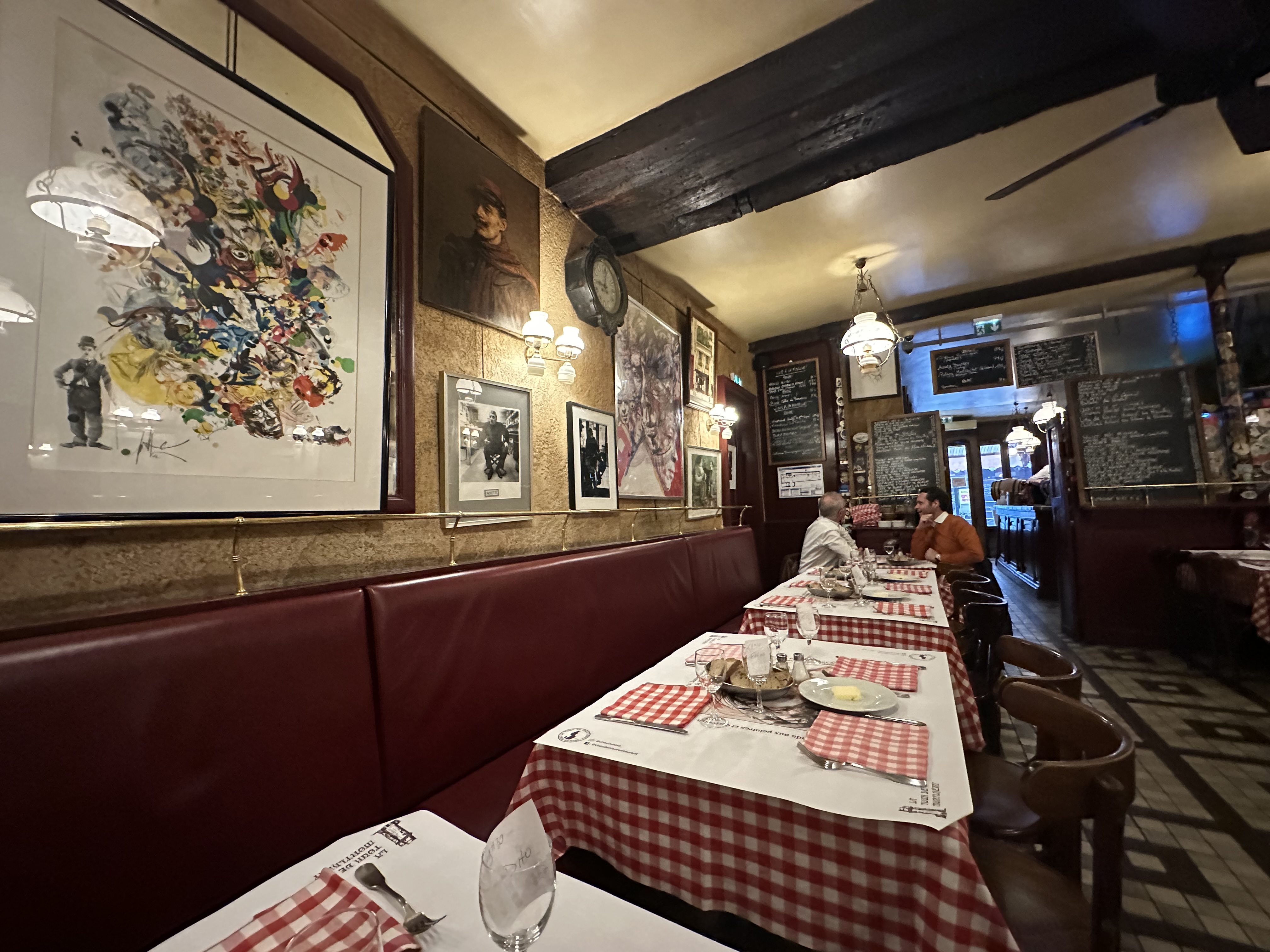 Une institution ! La bonne vielle auberge parisienne, nappes à carreaux rouges et tabliers blancs, où l’on peut dîner jusque tard dans la nuit, et où défilent les plats traditionnels ( ⚠️ de la bidoche et des abats à foison, donc pour les végétariens/ vegan, c’est compliqué : blanquette, joue de boeuf, foie de veau, rognons, cervelle… ) et les inusables mousse au chocolat, charlotte, île flottante. Le tout dans des proportions gargantuesques. Une cuisine d’un autre temps, opulente et efficace, très bonne mais pas toujours très fine (tout comme les remarques de certains serveurs). Parfois c’est la quantité qui semble primer, mais ça reste de bonne qualité, et de temps en temps ça fait du bien!