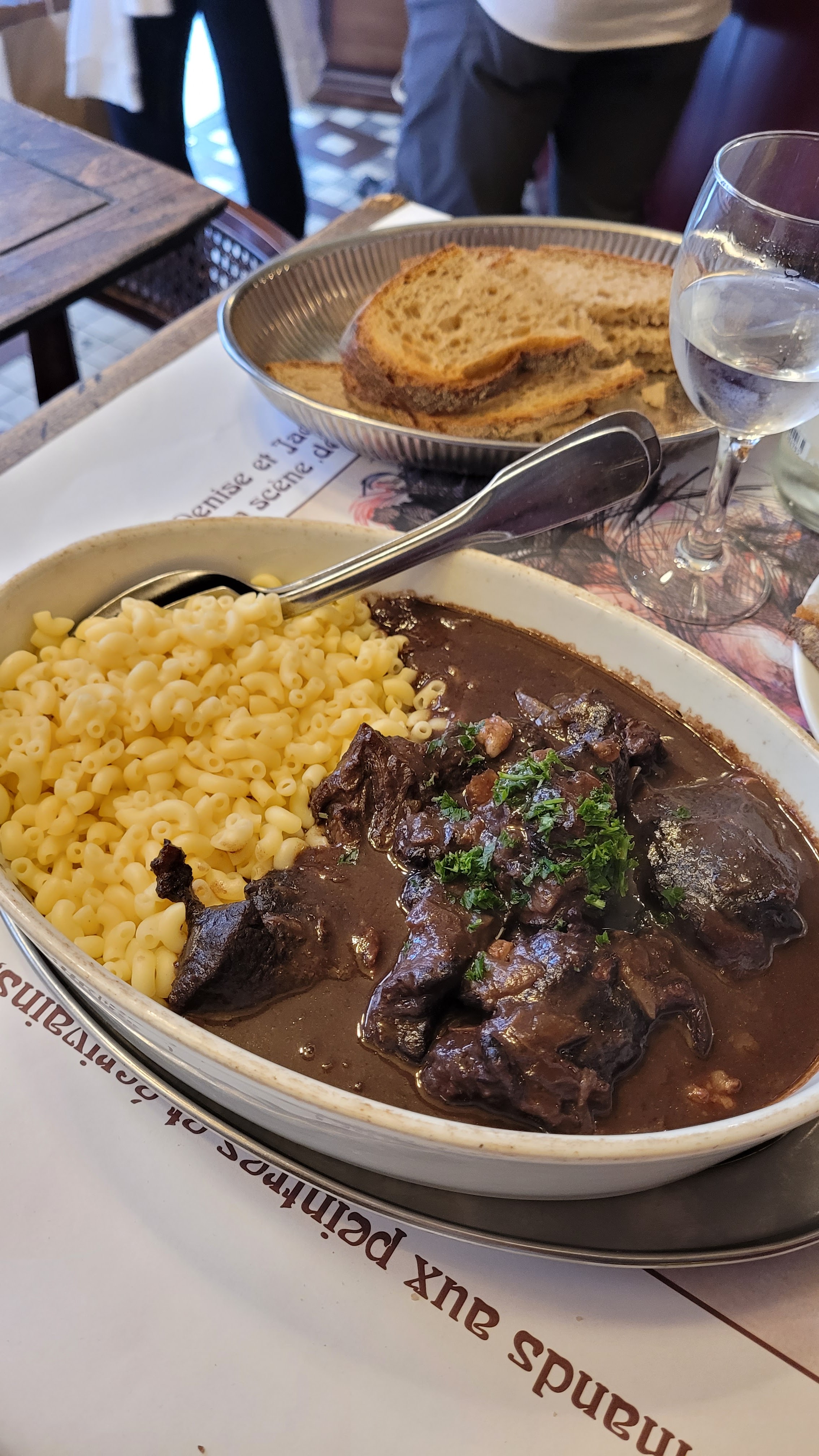 L'endroit était vraiment mignon et joli. Ils ont servi de la baguette avec du beurre, ce qui était incroyable et j'ai eu le ragoût de bœuf. C'était avec des macaronis et la quantité était énorme. Je suis venu seul mais ce serait parfait pour deux personnes. J'ai surtout mangé du bœuf avec une baguette tartinée de beurre puis des nouilles, et je vous recommande de l'essayer. Le prix total avec l'eau était de 29 euros et ce sera un bon endroit à visiter si vous voulez essayer la cuisine française et manger dans un bon restaurant :)