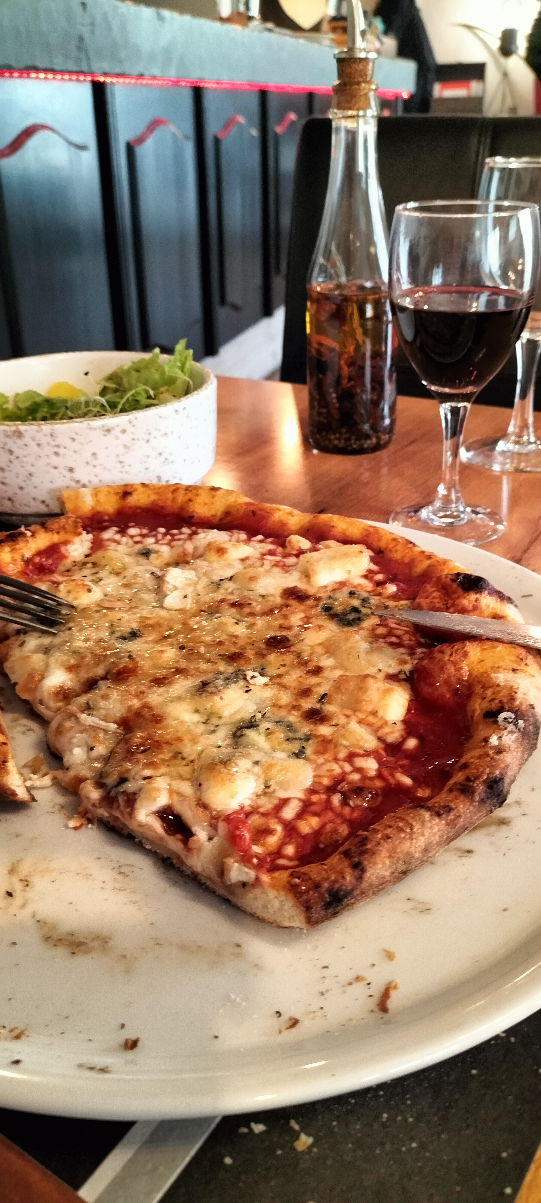 Une pizza quatre fromages goûteuse, légère grâce à une pâte de qualité. Un Chianti bien structuré, mais léger et fruité, bref du plaisir ! En terminant sur un tiramisu d'anthologie. Bref du bonheur à pas trop cher.