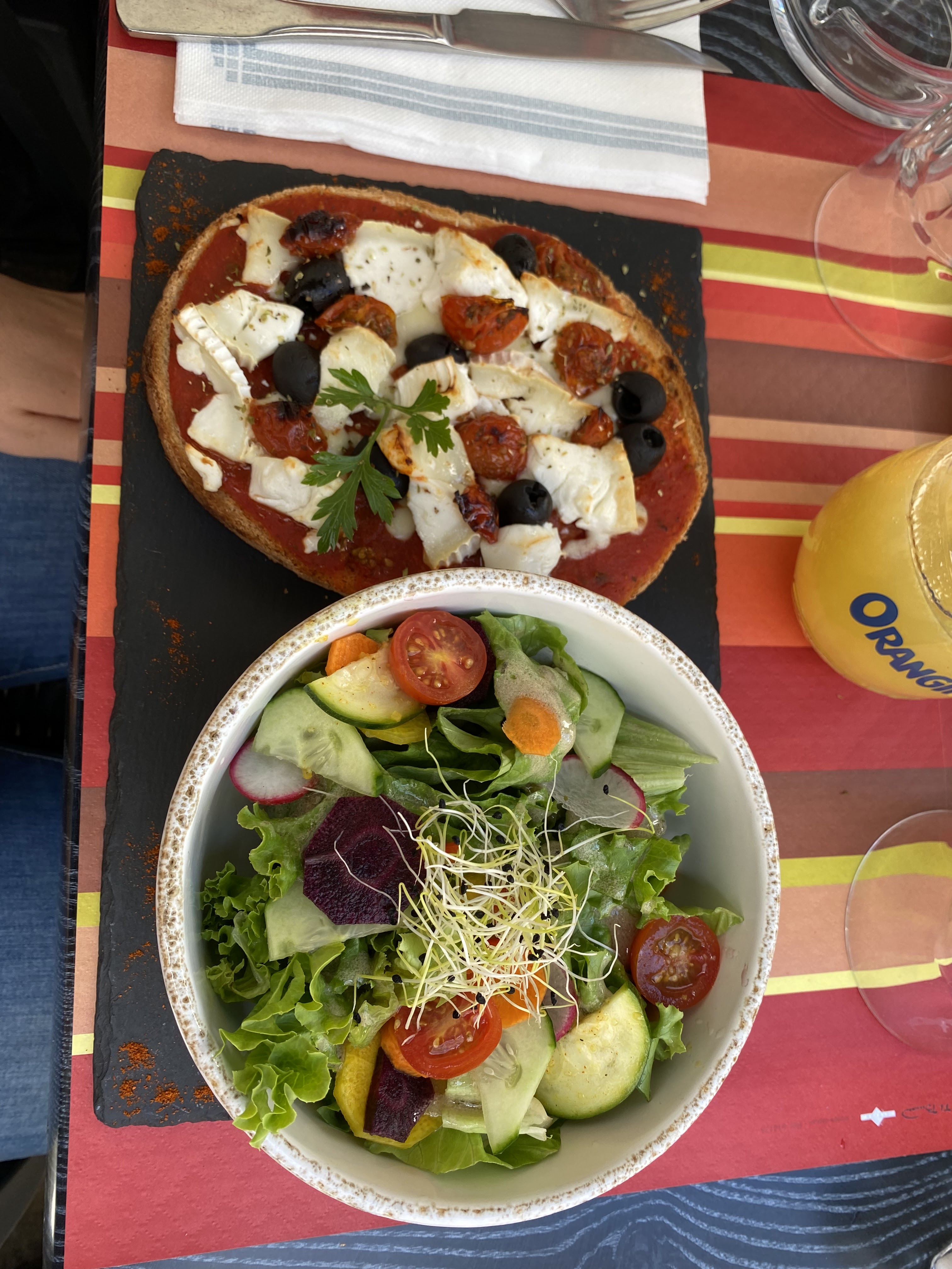 Délicieuse salade végétarienne très variée avec des champignons, des olives noires entre autres et pour dessert une panacotta très moelleuse. Cela change des panacotta parisiennes très sèches.