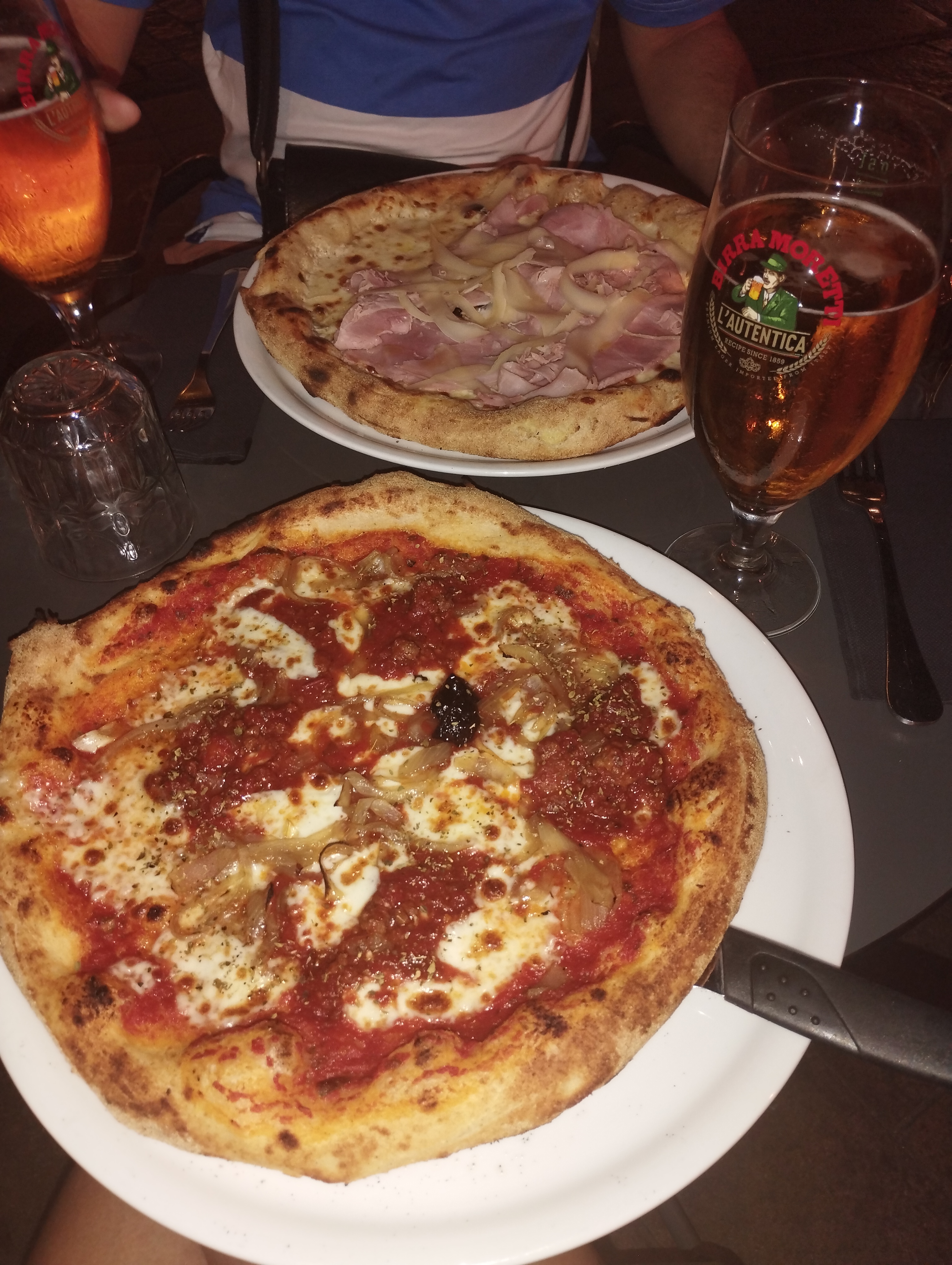 Bonne soiree dans ce lieu sympathique. Les pizzas étaient bonnes. Bien garnies. Bien cuites. L'expérience etait spéciale. Placés sous une telé, et etrangement observés pendant le repas, nous avons eu le sentiment que le serveur nous detestait. Preuve à lappui : nous avons patienté une bonne heure pour que nous assiettes soient debarrassées pour passer au dessert. Pourtant le serveur n'avait rien d'autre à faire. Heureusement que l'autre serveuse nous as sauvés, percevant probablement dans notre regard une immense détresse et une grande gène. Les desserts sont un peu lourds mais n'est ce pas le risque a prendre avec la nourriture de nos voisins italiens? Surtout bonne nuit☀