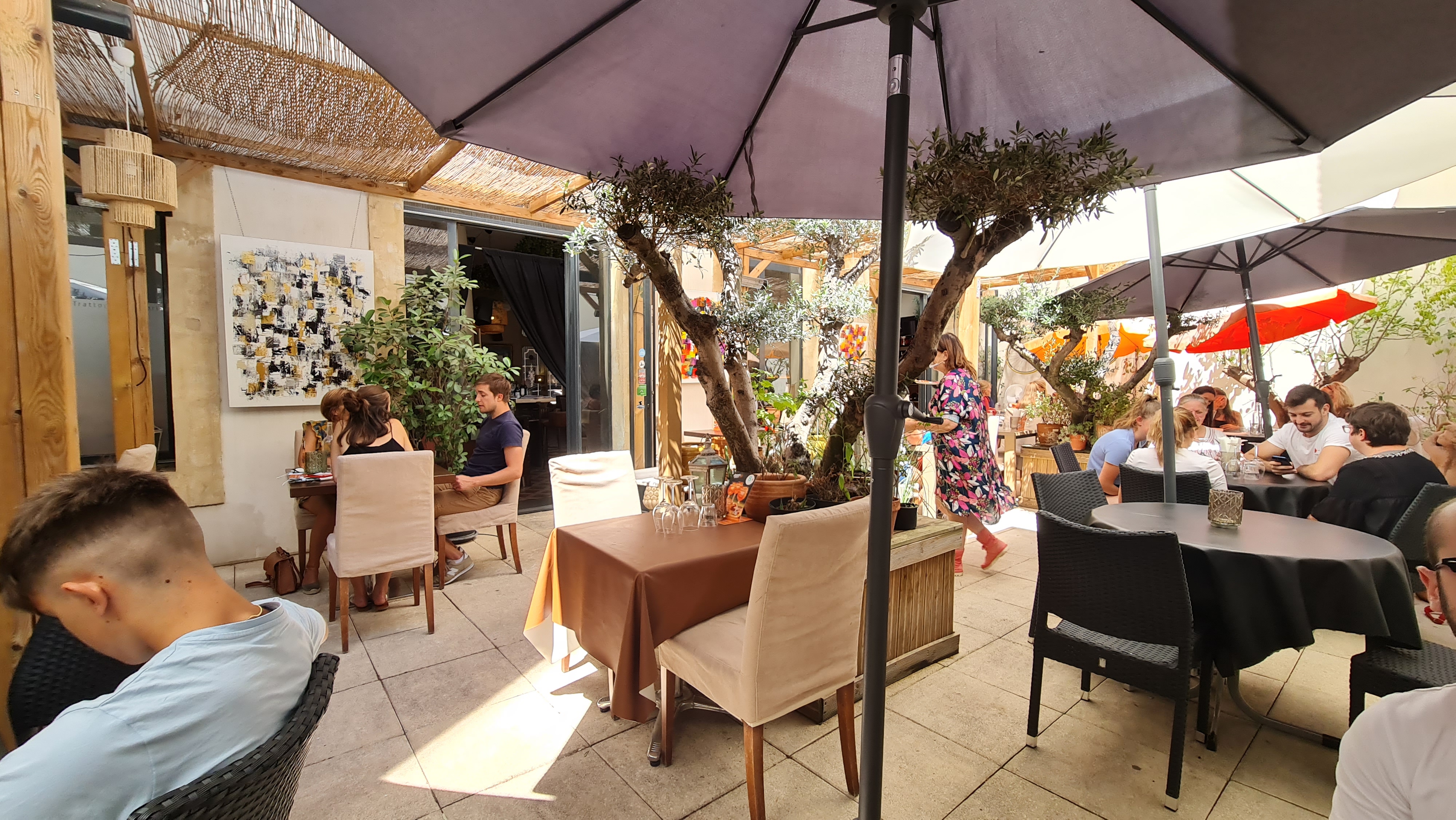 Avis concernant la soirée afterwork du vendredi soir, dès 19h. Entrée à 10E avec une conso (soft, vin ou bière) et quelques tapas (très correctes) en buffet. Lieu agréable, surtout le patio, avec ses belles pierres et ses oliviers. Musique (un peu trop forte!) avec DJ à l'intérieur, moyenne d'âge plutôt 30/50 ans et +, ambiance centre de petite ville . Cocktails attrape-touristes.. au moins on ne risque pas d'être ivres (!), même après plusieurs verres ;) Accueil agréable, équipe dynamique et plutôt sympa dans l'ensemble. Le patron est très commerçant, proche des clients et les met à l'aise, c'est chouette ! A bientôt :)