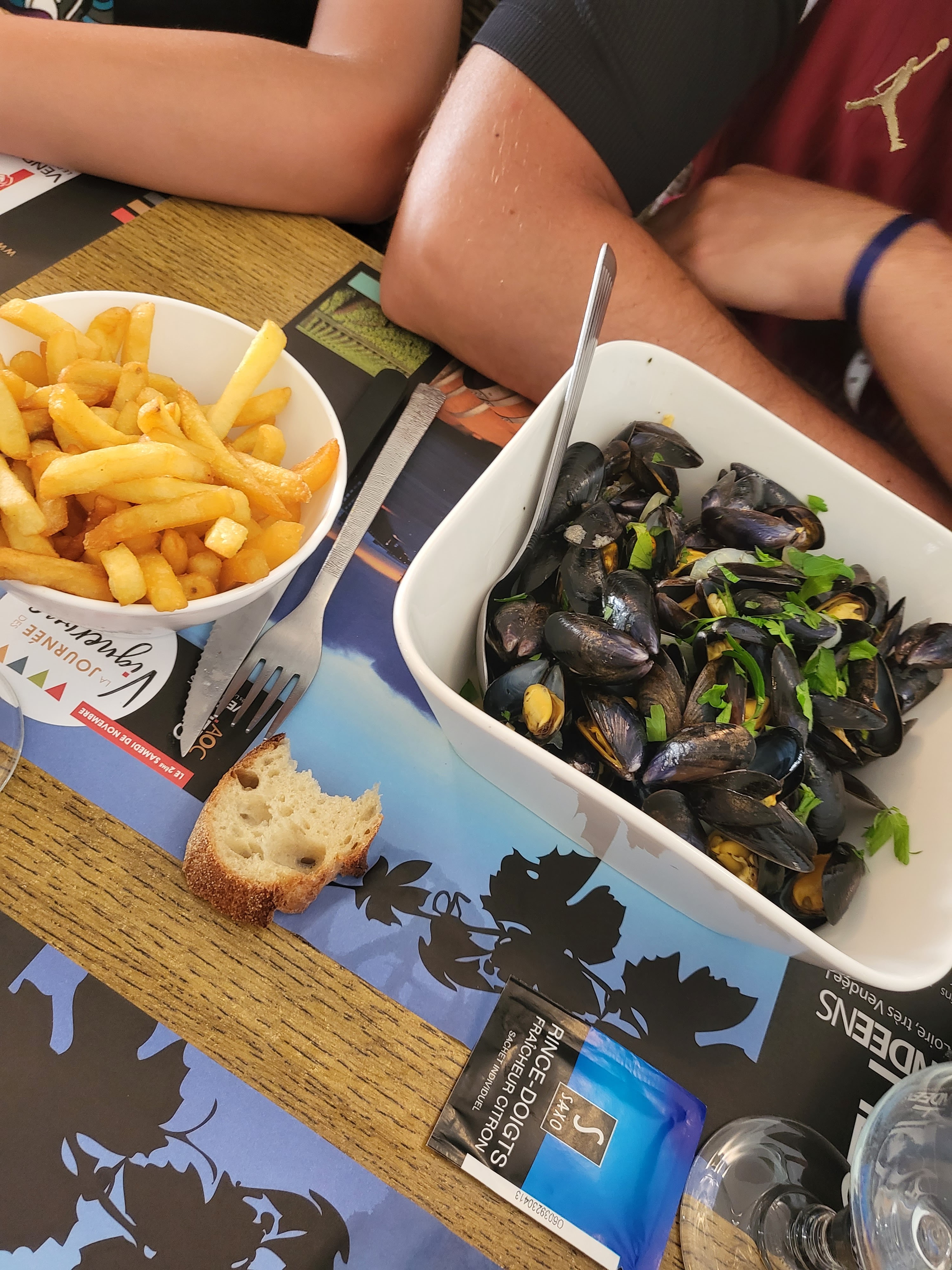 Alors comment dire, sympa et sympathique pour le personnel .... le service, pas dynamique mais speed, voir trop.... Le repas, pour ce que nous avons pris: des moules en quantité, mais mieux lavées c'est bien, les frites....non, pas au four, pas terrible.. La salade périgourdine, 2 ou 3 tomates cerises, des cerneaux de noix, ou des pignons,une tranche de pain de mie grillée coupée en 2 pour le foie gras (maison et très bon)... Nous n'avons pas pris de dessert, juste une assiette de fromage...faut pas le faire, gruyère, chèvre, puis 1 inconnu ?? Et 2 feuilles de salade...vous pouvez faire mieux ! J'ai bien évidemment regardé les tables à côté, les gens étaient satisfaits et les commentaires positifs... Je dirais que pour ce faire plaisir un 14 août en pleine saison ,c'est très, très bien, rapport qualité/ prix, le personnel reste dispo mais il vaut mieux etre du 1er service a 19h30...je pense 😉