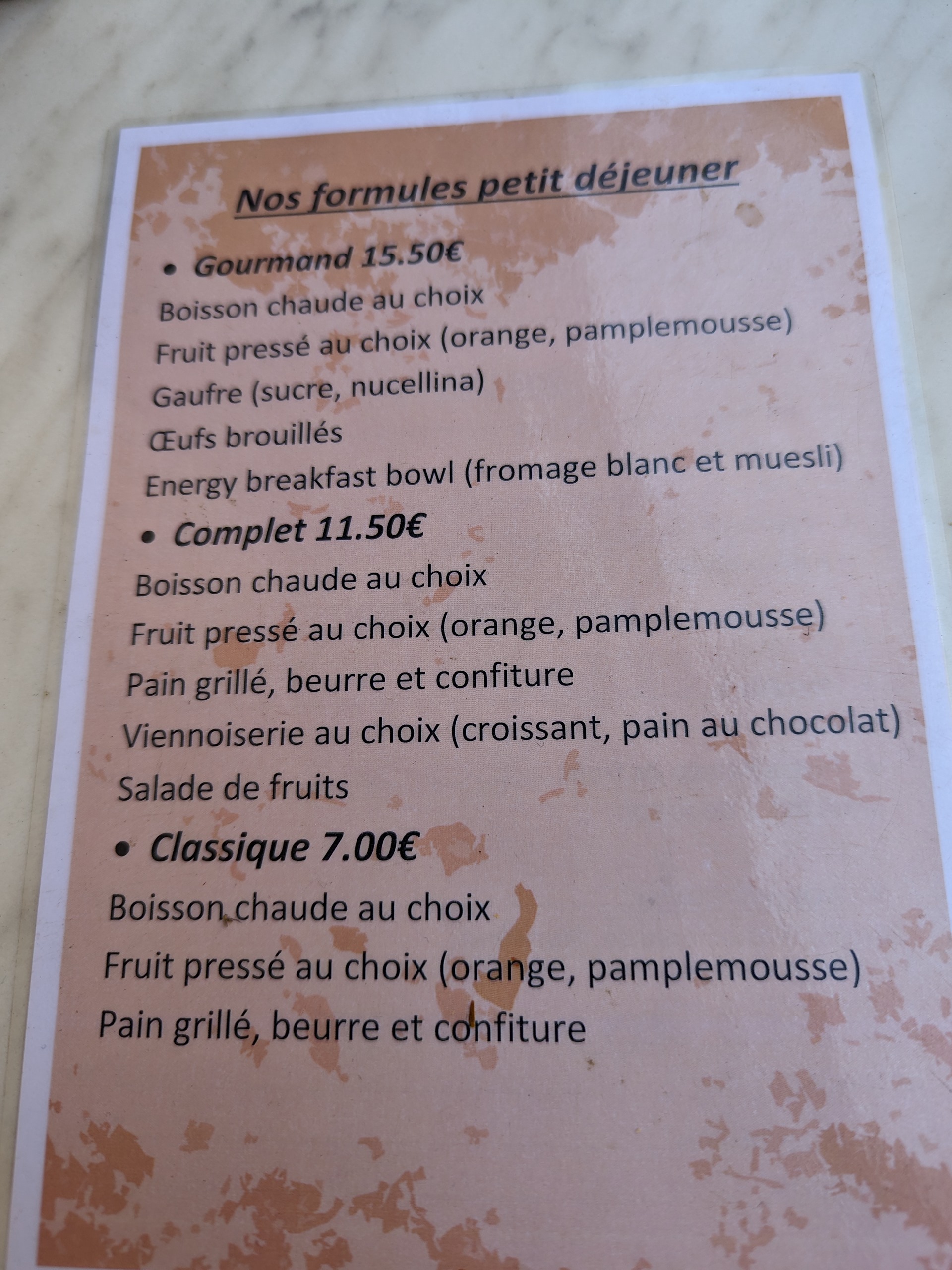 Servis à 13 h 15 avec le sourire! Très arrangeants. Salade fraîcheur et pâtes excellentes. Serveur prend le temps de discuter. 2 plats, 2 boissons et 2 cafés pour 43 euros, prix très corrects.