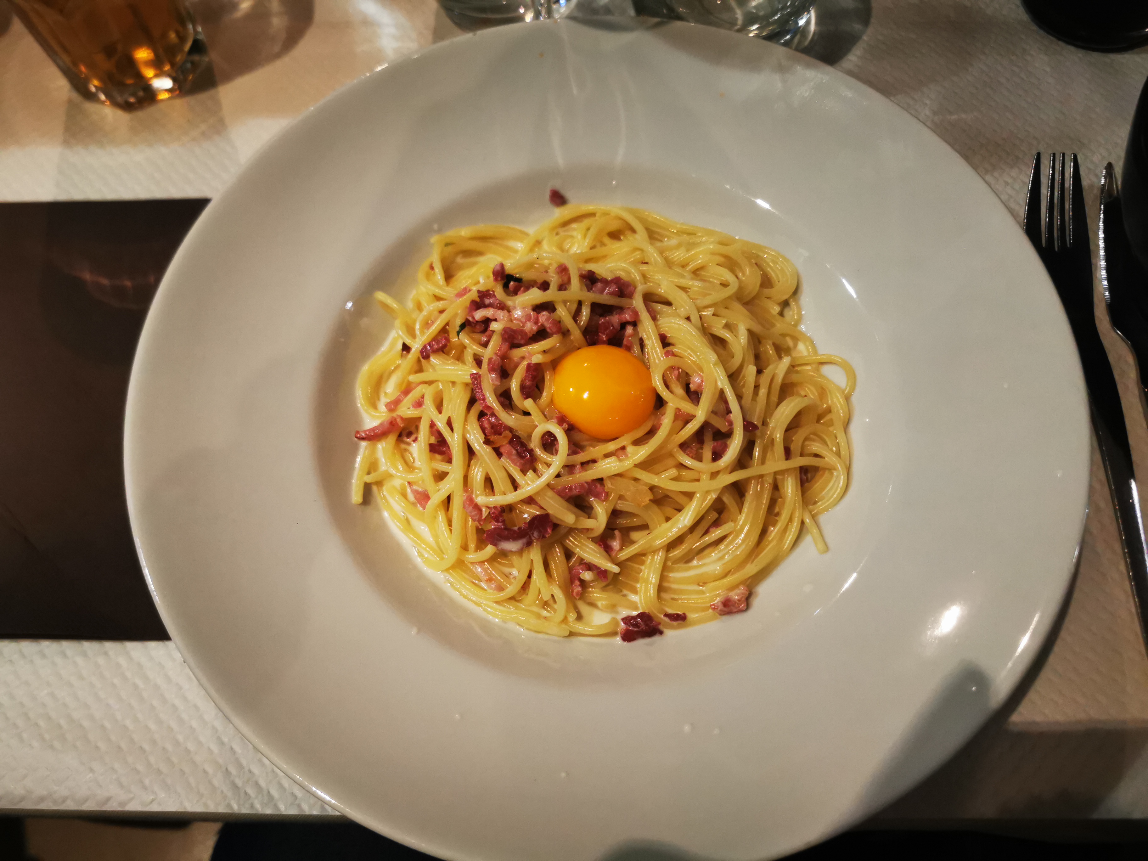 Pasta alla carbonara pourtant certifiées comme traditionnelles par la serveuse mais j'émets de gros doutes sur le guanciale dont le goût fumé caractéristique était absent, et sur la sauce qui fut liée par une matière grasse (beurre ou huile d'olive) qui est une aberration.