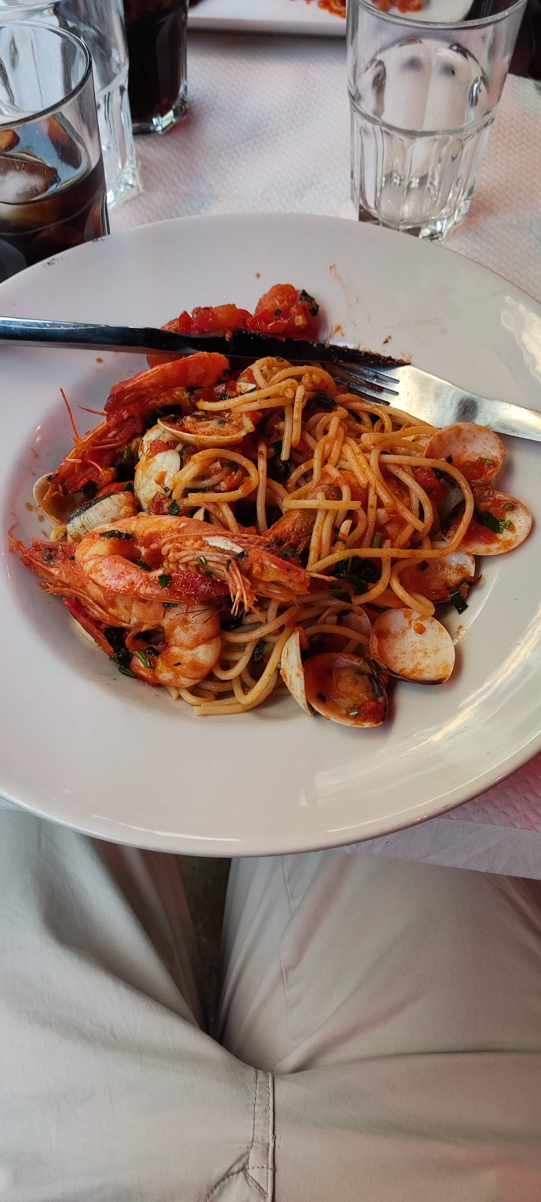 La nourriture est arrivée beaucoup trop vite, avait un goût réchauffé et fade... spaghettis, sauce tomate, fruits de mer prêts. Je n'osais plus essayer les moules et les langoustines. On a l'impression que l'essentiel est d'avoir servi le client. rapidement pour que le prochain puisse arriver à table. La rose et la pizza étaient les seules bonnes choses ici. Très décevant